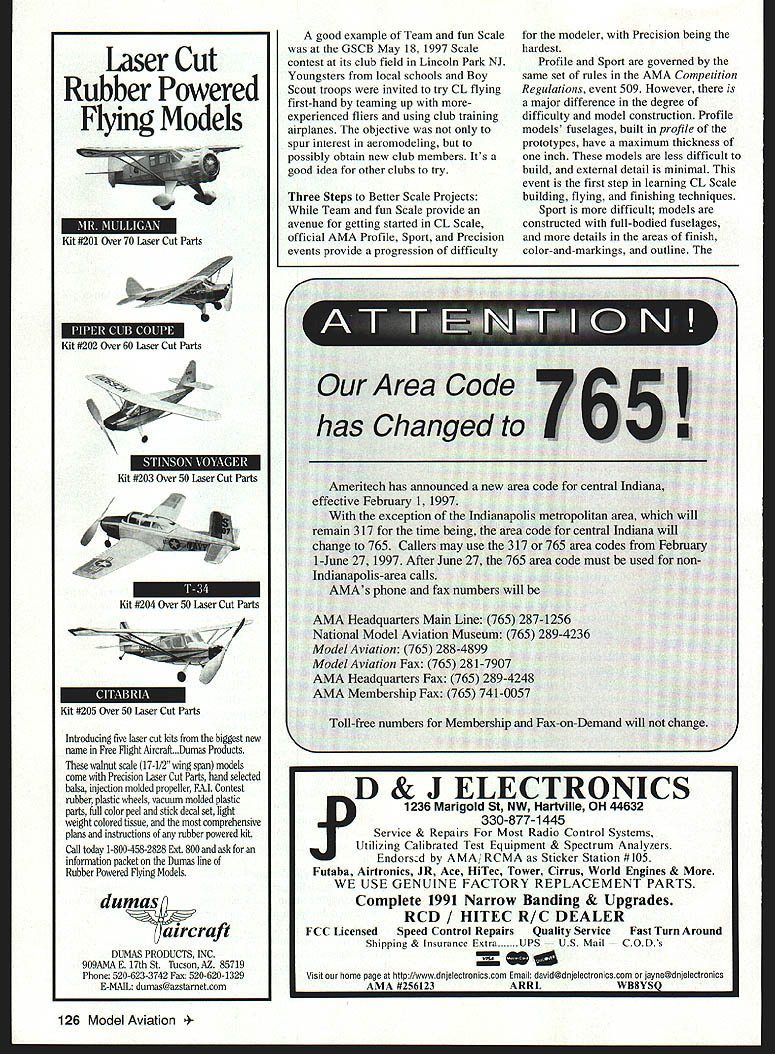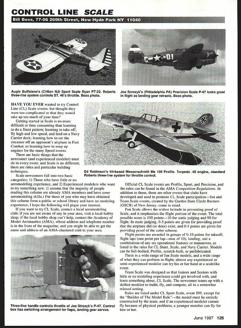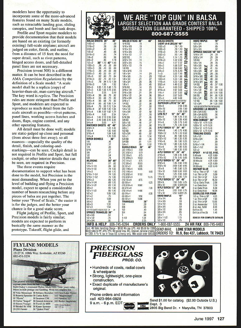CONTROL LINE SCALE E1 HAVE YOU EVER wanted try Control Line CL Scale events thought too complicated would take up too much time Getting started Scale no difficult time consuming learning Stunt pattern learning take off fly high low speed land Navy Carrier deck learning cut streamer off opponents airplane Fast Combat learning soup up engines Speed events basic things newcomer experienced modeler must event Scale no different rules particular building techniques Scale newcomers fall two basic categories 1 have little no aeromodeling experience 2 Experienced modelers want try something new assume majority people reading column already AMA members have some aeromodeling skills may have obtained column public school library have no modeling experience hope following will pique interest want try CL Scale contact local aeromodeling club aware area visit local hobby shop local hobby shop cant help contact Academy Model Aeronautics AMA address telephone number front magazine might able get name address AMA-chartered club area Official CL Scale events Profile Sport Precision rules can found AMA Competition Regulations addition other events clubs have developed used promote CL Scale participationfun Team Scale events created Garden State Circle Burners GSCB New Jersey come mind Fun Scale allows widest latitude presenting proof Scale emphasizes flight portion event total possible score 100 pointslO static judging 90 flight static judging 0-5 points given providing proof airplane did does exist 0-5 points given providing proof color scheme Flight points awarded groups 0-10 points takeoff flight laps point per lapmax 10 landing combination six operational features maneuvers listed rules CL Stunt Scale Navy Carrier Models can full-bodied Profile scratch-built prefabricated wide range fun Scale models wide range what can perform flight almost experienced semi-experienced modeler can try hand scalelike event Team Scale designed Juniors Seniors little no modeling experience could get involved learn something about CL Scale newcomer teams up skilled modeler build fly compete somewhat relaxed setting Rules listed under CL Sport Scale event 509 except Builder Model Rulethe model must entirely constrncted team experienced modeler cannot fly because physical problems younger member can fly him June1997 125 Augie Buffalanos Clifton NJ Sport Scale Ryan PT-22 Roberts Joe Scrozyks Philadelphia PA Precision Scale P-47 looks great three-line system controls ST 46s throttle Boss photo flight landing gear retracts Boss photo Ed Robinsons kit-based Messerschmitt 109 Profile Torpedo 40 engine standard Roberts three-line system throttle control Three-line handle controls throttle Joe Strozyks P-47 Control box has switching arrangement flaps landing gear servos Laser Cut Rubber Powered Flying Models Kit #201 Over 70 Laser Cut Parts Kit #202 Over 60 Laser Cut Parts \ 9 Kit #203 Over 50 Laser Cut Parts / Kit #204 Over 50 Laser Cut Parts Kit #205 Over 50 Laser Cut Parts Introducing five laser cut kits biggest new name Free Flight Aircraft.Dumas Products walnut scale 17-1t2 wing span models come Precision Laser Cut Parts hand selected balsa injection molded propeller FAI Contest rubber plastic wheels vacuum molded plastic parts full color peel stick decal set light weight colored tissue comprehensive plans instructions rubber powered kit Call today 1-800458-2828 Ext 800 ask information packet Dumas line Rubber Powered Flying Models du~f aircraft DUMAS PRODUCTS INC 9O9AMA E 17th St Thcson AZ 85719 Phone 520-623-3742 Fax 520-620-1329 E-MAIL dumas@azstarnetcom good example Team fun Scale GSCB May 18 1997 Scale contest its club field Lincoln Park NJ Youngsters local schools Boy Scout troops invited try CL flying first-hand teaming up moreexperienced fliers using club training airplanes objective spur interest aeromodeling possibly obtain new club members Its good idea other clubs try Three Steps Better Scale Projects Team fun Scale provide avenue getting started CL Scale official AMA Profile Sport Precision events provide progression difficulty modeler Precision being hardest Profile Sport governed same set rules AMA Competition Regulations event 509 However major difference degree difficulty model construction Profile models fuselages built profile prototypes have maximum thickness inch models less difficult build external detail minimal event first step learning CL Scale building flying finishing techniques Sport difficult models constructed full-bodied fuselages details areas finish color-and-markings outline 126 Model Aviation 1236330-877-1445 3 ice & Repairs Most Radio Control Systems Utilizing Calibrated Test Equipment & Spectrum Analyzers Endors2d AMA/RCMA Sticker Station #105 Futaba Airtronics JR Ace HiTec Tower Cirrus World Engines & WE USE GENUINE FACTORY REPLACEMENT PARTS Complete 1991 Narrow Banding & Upgrades RCD / HITEC R/C DEALER FCC Licensed Speed Control Repairs Quality Service Fast Turn Around Shipping & Insurance ExtraUPS Mail __ w t home page http//wwwdnjeIectromcscom Email david@dnjelectronicscon jayne@dnjelectronics AMA #256123ARRLWBSYSQ modelers have opportunity incorporate some more-advanced features found Scale models such retractable landing gear sliding canopies bomb fuel tank drops Profile Sport require modelers provide documentation models based existing formerly existing full-scale airplane aircraft judged color finish outline distance 15 feet need super detail such rivet patterns hinged access doors full-detailed panel lines necessary Precision event 508 different matter can best described AMA Competition Regulations definition Scale model scale model shall replica copy heavier-than-air man-carrying aircraft key word replica Precision rules stringent Profile Sport modelers expected reproduce much detail fullscale aircraft possiblerivet patterns panel lines working access hatches doors flaps engine control other operating features detail must done well models static-judged up close personal about thr