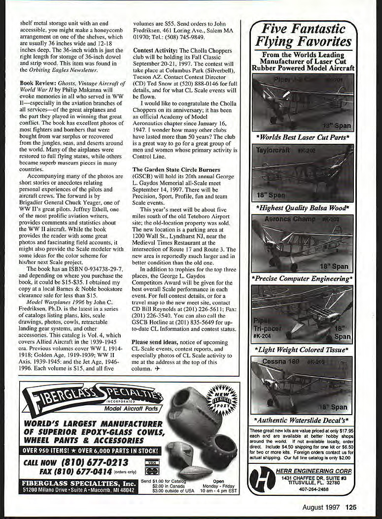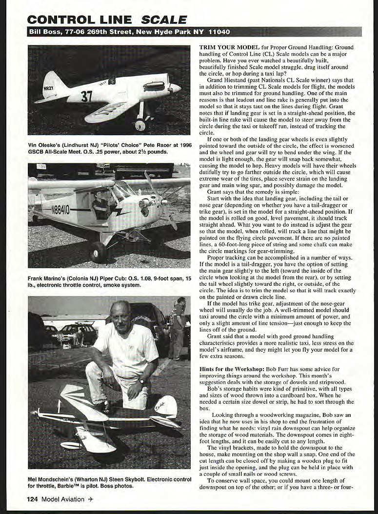 CONTROL LINE SCALE S- TRIM YOUR MODEL Proper Ground Handling Ground handling Control Line CL Scale models can major problem Have ever watched beautifully built beautifully finished Scale model struggle drag itself around circle hop during taxi lap Grand Hiestand past Nationals CL Scale winner says addition trimming CL Scale models flight models must also trimmed ground handling main reasons leadout line rake generally put model stays taut lines during flight Grant notes landing gear set straight-ahead position built-in line rake will cause model steer away circle during taxi takeoff run instead tracking circle both landing gear wheels slightly pointed toward outside circle effect worsened wheel gear will try bend under wing model light enough gear will snap back somewhat causing model hop Heavy models will have wheels dutifully try go farther outside circle will cause extreme wear tires place severe strain landing gear main wing spar possibly damage model Grant says remedy simple Start idea landing gear including tail nose gear depending whether have tail-dragger trike gear set model straight-ahead position model rolled good level pavement should track straight ahead What want instead adjust gear model rolled will track line might painted flying circle pavement no painted lines 60-foot-long piece string some chalk can make circle markings gear-trimming Proper tracking can accomplished number ways model tail-dragger have option setting main gear slightly left toward inside circle looking model rear setting tail wheel slightly toward right outside circle idea trim model will track exactly painted drawn circle line model has trike gear adjustment nose-gear wheel will usually job well-trimmed model should taxi around circle minimum amount power slight amount line tensionjust enough keep lines off ground Grant said model good ground handling characteristics provides realistic taxi less stress models airframe might let fly model few extra seasons Hints Workshop Bob Furr has some advice improving things around workshop months suggestion deals storage dowels stripwood Bobs storage habits kind primitive types sizes wood thrown cardboard box needed certain size dowel strip sort through box Looking through woodworking magazine Bob saw idea now uses shop end frustration finding what needs vinyl rain downspout can help organize storage wood materials downspout comes eightfoot lengths can easily cut length vinyl brackets made hold downspout house make mounting shop wall snap end cut length can closed off making wooden plug fit just inside opening plug can held place couple small nails wood screws conserve wall space could mount length downspout top other have three- four124 Model Aviation Oleskes Lindhurst NJ Pilots Choice Pete Racer 1996 GSCB All-Scale Meet OS 25 power about 21h pounds Frank Marinos Colonia NJ Piper Cub 0S 108 9-foot span 15 lb electronic throttle control smoke system Mel Mondscheins Wharton NJ Steen Skybolt Electronic control throttle BarbieTM pilot Boss photos shelf metal storage unit end accessible might make honeycomb arrangement shelves usually 36 inches wide 12-18 inches deep 36-inch width just right length storage 36-inch dowel strip wood item found Orbiting Eagles Newsletter Book Review Ghosts Vintage Aircraft World War II Philip Makanna will evoke memories served WW TIespecially aviation branches servicesof great airplanes part played winning great conflict book has excellent photos fighters bombers bought war surplus recovered jungles seas deserts around world airplanes restored full flying status others became superb museum pieces countries Accompanying photos short stories anecdotes relating personal experiences pilots aircraft crews forward Brigadier General Chuck Yeager WW II s great pilots Jeffrey Ethell prolific aviation writers provides comments statistics about WW II aircraft book provides reader some great photos fascinating field accounts might also provide Scale modeler some ideas color scheme his/her next Scale project book has ISBN 0-934738-29-7 depending purchase book could $15-$35 obtained copy local Barnes & Noble bookstore clearance sale less $15 Model Warplanes 1996 John C Fredriksen PhD latest series catalogs listing plans kits scale drawings photos cowls retractable landing gear systems other accessories catalog Vol 4 covers Allied Aircraft 1939-1945 era Previous volumes cover WW 19 141918 Golden Age 1919-1939 WW II Axis 1939-1945 Jet Age 19461996 volume $15 five volumes $55 Send orders John Fredriksen 461 Loring Ave Salem MA 01970 Tel 508 745-9849 Contest Activity Cholla Choppers club will holding its Fall Classic September 20-21 1997 contest will take place Columbus Park Silverbell Tucson AZ Contact Contest Director CD Ted Snow 520 888-0146 full details what CL Scale events will flown would like congratulate Cholla Choppers its anniversary has official Academy Model Aeronautics chapter since January 16 1947 wonder other clubs have lasted 50 years club great way go great group men women primary activity Control Line Garden State Circle Burners GSCB will hold its 20th annual George L Gaydos Memorial all-Scale meet September 14 1997 will Precision Sport Profile fun team Scale events years meet will about five miles south old Teteboro Airport site old-location property sold new location parking area 1200 Wall St Lyndhurst NJ near Medieval Times Restaurant intersection Route 17 Route 3 new area reportedly much larger better condition old addition trophies top three places George L Gaydos Competitors Award will given best overall Scale performance event full contest details travel map new meet site contact CD Bill Reynolds 201 226-5611 Fax 201 226-3540 can also call GSCB Hotline 201 835-5649 upto-date CL Information contest status Please send ideas notice upcoming CL Scale events contest reports especially photos CL Scale activity address top column Fantastic Flying Favorites I Worlds Leading I Manufacturer Laser Cut I Rubber Powered Model Aircraft great new