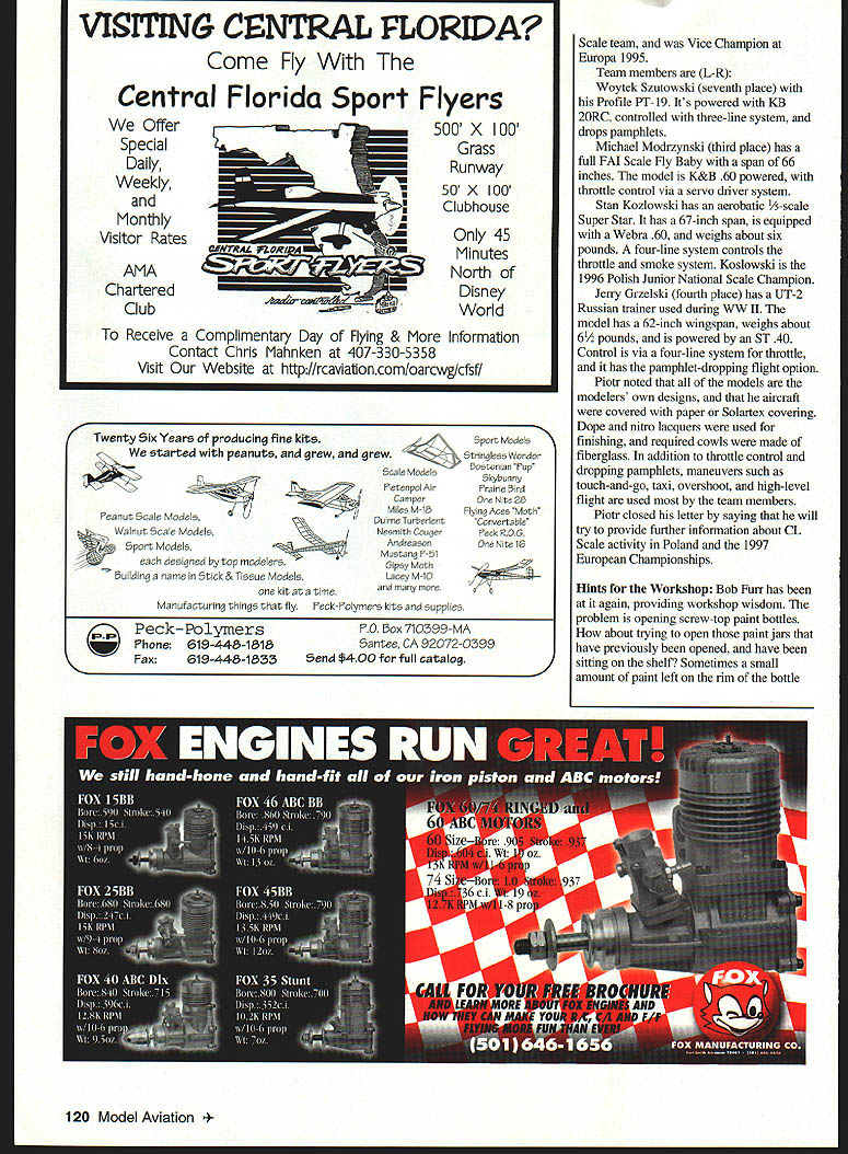 CONTROL LINE SCALE SCALE RULES PROPOSALS can affect Control Line CL Scale modeling have just through Initial Vote 19981999 rules cycle might interested following SC-99-21 designating popular Profile Scale official Academy Model Aeronautics AMA event has passed should have little difficulty passing final vote Profile Scale featured CL Scale contests around country SC-99-24 called noise abatement RC [Radio Control] CL Events has failed Although CL Scale models required use mufflers dont seem cause problem other spoiling models appearance passage proposal would have caused havoc other events would muffle Jet engine SC-99-23 calls Sport Scale event divided Sportsman Expert classes elimination Precision Scale would eliminated replaced Designer Scale now appears RC Scale events active CL Scale modelers polled Bill Reynolds East Coast Fred Cronenwett West Coast myself Most modelers indicated have no problem Sport event change strongly opposed elimination Precision event because being used contests both coasts growing participation Sport rules would basis Designer Scale thats okay strong opposition Designer event CL because Eligibility Requirements appear page 140 Competition Regulations 1 Only models original design contestant eligible event Models built kits commercially available plans modifications kits plans scaled commercial plans eligible 2 Craftsmanship judging will done zero distance reasonable approach might have introduce Designer Scale new supplemental event see would used before eliminating Precision event also felt Designer event would rarely used CL Scale modeler wants build such demanding event can look toward Federation Aeronautique Internationale FAI Scale trials World Championships urge CL Scale modelers think seriously about change Contact district Scale Board member let him know thoughts talk up club meetings want eliminate Precision event favor something untried CL will actually build such demanding event What will Designer builders present Precision models Enter Sport event maybe discourage others entering Let District Scale Contest Board member know feel will too late anything after rule passed final vote Overseas Mail Its always pleasure able talk about overseas Scale modelers show some work Piotr Zawada Poznan Poland sent couple photos letter telling about Junior Scale Team Poznan Aeroklub photo shows four members team won Best Junior Scale Team cup 1996 Polish Nationals fifth modeler center photo no model Boguslav Malota Ostrov Poland member Poznan club close friend team members member Polish September 1997 119 Poznan Aerokiubs Best Junior Scale Team Polands 1996 National Championships L-R Szutowski Modrzynski Malota Kozlowski Grselski Piotr Zawada photo Full-scale glider back dwarfs Michael Modrzynski Fly Baby Third Junior CL Scale 1996 Polish Nationals Chuck Snyder Profile DH Hornet has retracts flaps throttle control Power two Fox engines Byron Barker photo VIITIN& CENTRAL FLOPJPA Come Fly Central Florida Sport Offer Special Daily Weekly Monthly Visitor Rates AMA Flyers 500 X 100 Grass Runway 50 X 100 Clubhouse Only 45 Minutes North Disney World Receive Complimentary Day Flying & Information Contact Chris Mahnken 407-330-5358 Visit Website http//rcaviationcom/oarcwglcfsf/ Twenty Six Yeare producing fine kitsSport Models cWe started peanuts grew grewStringless Wondor Sostonian Pup reanut Scale Models Walnut Scale Models Sport Models designed hy top modelers Building name Stick & Tissue Models kit time Scale Models Fietenpol Air Camper Miles M-1S Ojirne Turherlent Nesmith Couger Andreason Mustang F-Si Gipsy Moth acey M-1O Skybunny Prairie Sird Site 25 Flying Aces Moth Convertayle Feck F0G Site 15 Manufacturing things fly reck-Polymers kits supplies Peck-Polymers Phone619-448-1818 Fax619-448-1833 l0 Sox 710399-MA Santee CA 92072-0399 Send $400 forfull catalog 2 Chartered Club Scale team Vice Champion Europa 1995 Team members L-R Woytek Szutowski seventh place Profile PT-19 Its powered KB 2ORC controlled three-line system drops pamphlets Michael Modrzynski third place has full FAI Scale Fly Baby span 66 inches model K&B 60 powered throttle control via servo driver system Stan Kozlowski has aerobatic /5-scale Super Star has 67-inch span equipped Webra 60 weighs about six pounds four-line system controls throttle smoke system Koslowski 1996 Polish Junior National Scale Champion Jerry Grzelski fourth place has UT-2 Russian trainer used during WW II model has 62-inch wingspan weighs about 61/2 pounds powered ST 40 Control via four-line system throttle has pamphlet-dropping flight option Piotr noted models modelers own designs aircraft covered paper Solartex covering Dope nitro lacquers used finishing required cowls made fiberglass addition throttle control dropping pamphlets maneuvers such touch-and-go taxi overshoot high-level flight used team members Piotr closed letter saying will try provide further information about CL Scale activity Poland 1997 European Championships Hints Workshop Bob Furr has again providing workshop wisdom problem opening screw-top paint botfies about trying open paint jars have previously opened have sitting shelf Sometimes small amount paint left rim bottle 120 Model Aviation ening makes almost impossible get bottle open Bob has tried turning bottles upside down applying acetone hot water thread area tops No matter what method used winds up being chore prevent frustration Bob suggests wrapping turn two TeflonTM pipe thread tape around threads bottle closing Youll get tighter seal youll have easier time next time open bottle item found Orbiting Eagles Omaha NE newsletter Contest Activity West Coast Seebree Hayes Annual contest will October 11-12 1997 Whittier Narrows flying area Because last years contest successful Precision Sport Profile fun Scale events will offered Although contest information did name Contest Director CD youll have no trouble getting full contest details drop line Fred Cronenwett 7352 Independence Ave Apt #201 Canoga Park CA 