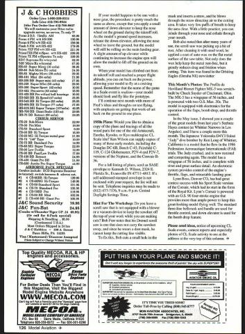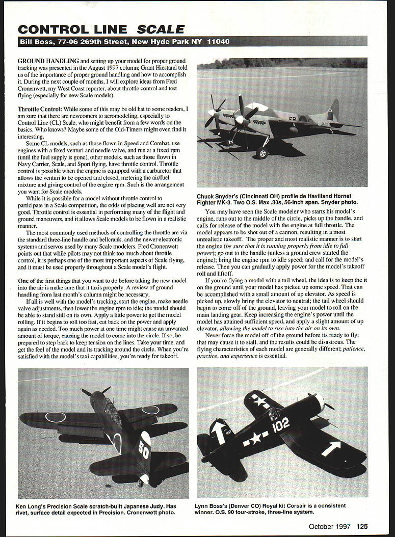 CONTROL LINE SCALE GROUND HANDLING setting up model proper ground tracking presented August 1997 column Grant Hiestand told us importance proper ground handling accomplish During next couple months will explore ideas Fred Cronenwett West Coast reporter about throttle control test flying especially new Scale models Throttle Control some may old hat some readers am sure newcomers aeromodeling especially Control Line CL Scale might benefit few words basics knows Maybe some Old-Timers might find interesting Some CL models such flown Speed Combat use engines fixed venturi needle valve run fixed rpm until fuel supply gone other models such flown Navy Carrier Scale Sport flying have throttle control Throttle control possible engine equipped carburetor allows venturi opened closed metering air/fuel mixture giving control engine rpm Such arrangement want Scale models possible model throttle control participate Scale competition odds placing well very good Throttle control essential performing flight ground maneuvers allows Scale models flown realistic manner commonly used methods controlling throttle via standard three-line handle bellcrank newer electronic systems servos used Scale modelers Fred Cronenwett points out pilots may think too much about throttle control perhaps important aspects Scale flying must used properly throughout Scale models flight first things want before taking new model air make sure taxis properly review ground handling last months column might necessary well models tracking start engine make needle valve adjustments lower engine rpm idle model should able stand still its own Apply little power get model rolling begins roll too fast cut back power apply again needed Too much power time might cause unwanted amount torque causing model come circle prepared step back keep tension lines Take time get feel model its tracking around circle youre satisfied models taxi capabilities youre ready takeoff Chuck Snyders Cincinnati OH profile de Havilland Hornet Fighter MK-3 Two 05 Max 30s 56-inch span Snyder photo may have seen Scale modeler starts models engine runs out middle circle picks up handle calls release model engine full throttle model appears shot out cannon resulting unrealistic takeoff proper realistic manner start engine sure running properly idle full power go out handle unless ground crew started engine bring engine rpm idle speed call models release can gradually apply power models takeoff roll liftoff youre flying model tail wheel idea keep the ground until model has picked up some speed can accomplished small amount up elevator As speed picked up slowly bring elevator neutral tall wheel should begin come off ground leaving model roll main landing gear Keep increasing engines power until model has attained sufficient speed apply slight amount up elevator allowing model rise air its own Never force model off ground before its ready fly may cause stall results could disastrous flying characteristics model generally different patience practice experience essential October 1997 125 Ken Longs Precision Scale scratch-built Japanese Judy Has rivet surface detail expected Precision Cronenweft photo Lynn Bosss Denver CO Royal kit Corsair consistent winner 0S 90 four-stroke three-line system J & C HOBBIES Order Line 1-800-309-8314 Info Line 412-796-9344 24hr Fax Order line 412-798-9867 will customize Hitec radio upgrade servos no servos Tx only? Focus 2 SS 72mHz AM6595 Focus 4 FM w14 HS-30013095 Focus 6 FM w14 HS-42215995 Flash 5 FM w/4 HS-42217995 Prism 7XF FM w/4 HS42222195 Prism7XS FM w/Spec w/4 HS-42230995 Prism 7X FM w/Spectra Tx only19995 RDC Supreme Rx w/crystal6295 535 Micro Rx w/crystal6795 HS-60 Super Micro 16 oz/in3895 HS-80 Sub Micro 1 oz/in2495 HS-85 Mighty Micro 38 ozlin2995 HS-101 Mini 24 ox/in2195 HS-205 BB Super mini 43 oz/ln2795 HS-225 Super Mini 50 ox/In2995 HS-300 Super Sport 42 ox/in1095 HS-422 Pro-servo 43 ox/in1395 HS-425 BB Pro w/dual ball bearings1995 HS-525 BB Hi Speed 47 oz/in3595 HS-545 BE Hi Torque 62 oz/in3595 HS-605 BB Hi Torque 77 oz/in3795 HS-615 MG Super Torque lO7ozIln4095 HS-700 BB Giant Scale 133 ox2995 HS-75 BE Retract 90 ox/in3995 CIRRUS SERVOS CS-20 Sub-Micro2299 CS-30 Pro Mini1999 CS-SO Standard Sport999 CS-60 BE Hi Torque1699 CS-60 MG Hi Torque metal gear2199 CS-70 148 Type1099 CS-70 BE Standard Pro1499 CS-80 MG Super Torque2299 CS-90 Low Profile1299 CS-90 BE Fast/Low Profile1799 CS-100 BE Retract2499 CS-400 Giant Pro BE2199 CS-600 Jumbo Pro Super Torque4499 AIRBORNE PACK SPECIALS Combos include ROD Supreme Receiver w/crystal switch harness & aileron ext #14 OS-OQEB Hi-Torque12995 #24 CS-6OMG Hi-Torque14995 #34 CS-SO Standard Sport10195 #44 CS-70 Standard Pro10595 #64 CS7OBB Pro11995 #62 CS30 BE Mini10295 #72 CS-400 BE Giant Pro10595 J&C Sound Security1995 J&C Fun-Bat2495 Combo wfFhunder Tiger GP 16 6996 call 6-Pack special Shipping & Handling . $500 Continental USA Most Orders Shipped 24 brs J & C Hobbies Street Penn Hills PA 16236 Visa Mastercard Discover Accepted Prices Subject Change Without Notice model happens nose gear procedure pretty much same above except apply small amount down elevator keep nose wheel ground during takeoff roll As models ground speed increases release down elevator allowing nose wheel leave ground model will still rolling main landing gear slight amount up elevator continuing increase engine rpm will allow model lift off ground its own model has climbed out its takeoff roll reached proper flight altitude can cut back power allowing model fly cruising speed Remember name game Scale event realismyour model should look fly like prototype Ill continue next month Freds ideas thoughts test flying emphasis getting work-of-art back ground piece 1950s Plans Would like obtain copy plans tracings wood parts old Aristocraft Eureka Kyosho Kyo multiengine CL Scale kits Ken Wilson can supply copies of early models including Douglas DC-6B Beech C-45 Fairchild C 119 C-124 Globemaster P2V-4 P2V-7 versions Neptune Convair B