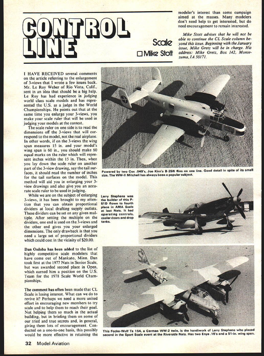 I Scale 0 Mike Stott HAVE RECEIVED several comments article referring enlargement 3-views wrote few issues back Mr Le Roy Weber Rio Vista Calif sent idea should big help Le Roy has experience judging world class scale models has repre sented US judge World Championships points out same time enlarge 3-views make scale ruler will used judging models contest scale ruler side read dimensions off 3-views will cor respond model real airplane other words 3-views wing span measures 15 models wing span 60 should make 60 equal marks ruler will repre sent inches within 15 lay down scale ruler another part 3-view drawing say tail sur faces should read number inches tail surfaces model method will aid enlarging 3view drawings also give accu rate scale ruler used judging subject enlarging 3-views has brought atten tion can obtain proportional dividers local drafting supply outlets dividers can set given mul tiple After setting multiple dividers end used 3-views other end gives enlarged dimensions drawback need large set proportional dividers could cost vicinity $2000 Dan Osdoba has added list highly competitive scale modelers have come out Mankato Minn Dan took first 1977 Nats Senior Scale awarded second place Open earned him position US Team 1978 Scale World Cham pionships comment has often made CL Scale losing interest What can revive Perhaps need united effort encouraging new members try scale help reach goal helping much actual building briefing some tried true secrets general giving lots encouragement Con ducted one-to-one basis possibly would effective retaining modelers interest some campaign aimed masses modelers dont need help get interested need encouragement remain interested Mike Stott advises will able continue CL Scale column yond issue Beginning January issue Mike Gretz will charge address Mike Gretz Box 142 Monte zuma IA 50171 32 Model Aviation Powered two Cox 04W Joe Iirns 8-25N flies line Good detail spite its small size WW-ll Mitchell has always popular subject Foclce-WuIf Ta 154 German WW-2 twin handiwork Larry Stephens placed second Sport Scale event Riverside Nats Has two Enya 15s 51-in wing span