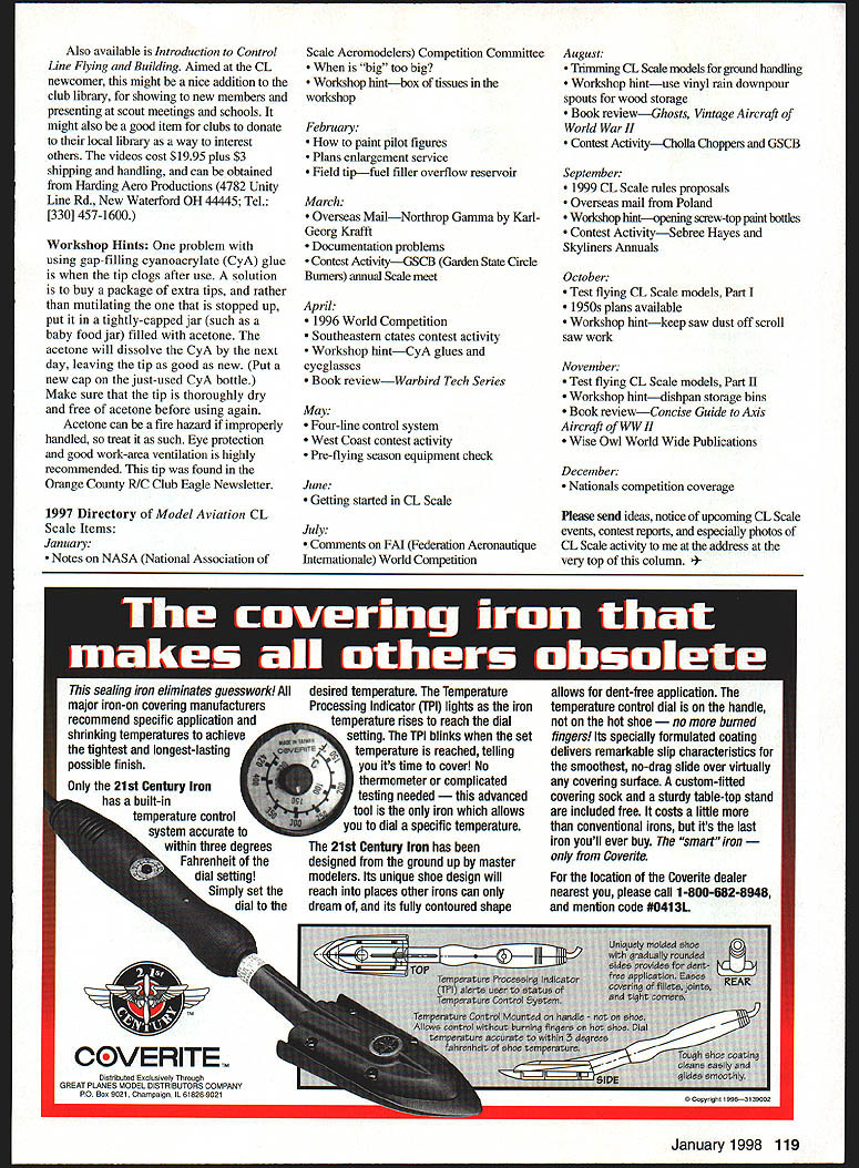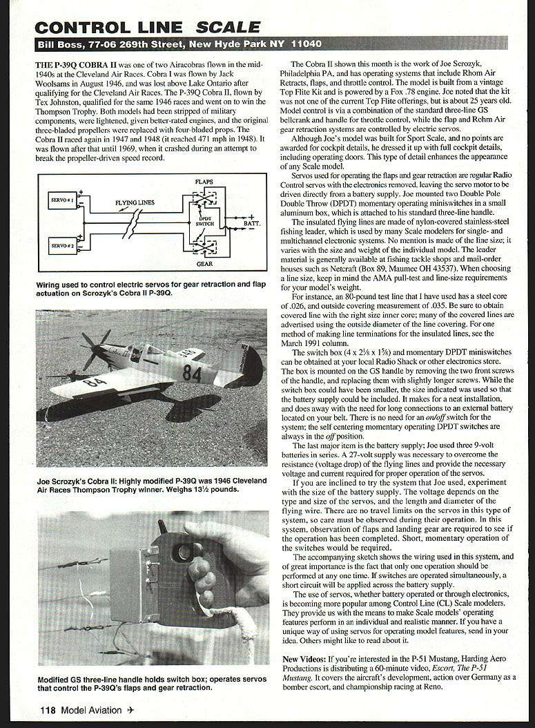 CONTROL LINE SCALE fj P-39Q COBRA II two Airacobras flown mid 1940s Cleveland Air Races Cobra flown Jack Woolsams August 1946 lost above Lake Ontario after qualifying Cleveland Air Races P-39Q Cobra II flown Tex Johnston qualified same 1946 races went win Thompson Trophy Both models stripped military components lightened given better-rated engines original three-bladed propellers replaced four-bladed props Cobra II raced again 1947 1948 reached 471 mph 1948 flown after until 1969 crashed during attempt break propeller-driven speed record Wiring used control electric servos gear retraction flap actuation Scrozyks Cobra II P-39Q Cobra II shown month work Joe Scrozyk Philadelphia PA has operating systems include Rhom Air Retracts flaps throttle control model built vintage lop Elite Kit powered Fox 78 engine Joe noted kit current lop Elite offerings about 25 years old Model control via combination standard three-line US belicrank handle throttle control flap Rohm Air gear retraction systems controlled electric servos Although Joes model built Sport Scale no points awarded cockpit details dressed up full cockpit details including operating doors type detail enhances appearance Scale model Servos used operating flaps gear retraction regular Radio Control servos electroaics removed leaving servo motor driven directly battery supply Joe mounted two Double Pole Double Throw DPDT momentary operating miniswitches small aluminum box attached standard three-line handle insulated flying lines made nylon-covered stainless-steel fishing leader used Scale modelers single- multichannel electronic systems No mention made line size varies size weight individual model leader material generally available fishing tackle shops mail-order houses such Netcraft Box 89 Maumee OH 43537 choosing line size keep mind AIVIA pull-test line-size requirements models weight instance 80-pound test line have used has steel core 026 outside covering measurement 035 sure obtain covered line right size inner core covered lines advertised using outside diameter line covering method making line terminations insulated lines see March 1991 column switch box 4 x 21/8 x li/s momentary DPDT miniswitches can obtained local Radio Shack other electronics store box mounted US handle removing two front screws handle replacing slightly longer screws switch box could have smaller size indicated used battery supply could included makes neat installation does away need long connections external battery located belt no need on/off switch system self centering momentary operating DPDT switches always off position last major item battery supply Joe used three 9-volt batteries series 27-volt supply necessary overcome resistance voltage drop flying lines provide necessary voltage current required proper operation servos inclined try system Joe used experiment size battery supply voltage depends type size servos length diameter flying wire no travel limits servos type system care must observed during operation system observation flaps landing gear required see operation has completed Short momentary operation switches would required accompanying sketch shows wiring used system great importance fact operation should performed time switches operated simultaneously short circuit will applied across battery supply use servos whether battery operated through electroaics becoming popular among Control Line CL Scale modelers provide us means make Scale models operating features perform individual realistic manner have unique way using servos operating model features send idea Others might like read about New Videos youre interested P-Si Mustang Harding Aero Productions distributing 60-minute video Escort P-Si Mustang covers aircrafts development action over Germany bomber escort championship racing Reno 118 Model Aviation S RVO #1 FLYING LINES 1 DPDT Oj2 GEAR Joe Scrozyks Cobra II Highly modified P-39Q 1946 Cleveland Air Races Thompson Trophy winner Weighs 1 31h pounds Modified GS three-line handle holds switch box operates servos control P-390s flaps gear retraction Also available Introduction Control Line Flying Building Aimed CL newcomer might nice addition club library showing new members presenting scout meetings schools might also good item clubs donate local library way interest others videos cost $1995 plus $3 shipping handling can obtained Harding Aero Productions 4782 Unity Line Rd New Waterford OH 44445 Tel [330] 457-1600 Workshop Hints problem using gap-filling cyanoacrylate CyA glue tip clogs after use solution buy package extra tips rather mutilating stopped up put tightly-capped jar such baby food jar filled acetone acetone will dissolve CyA next day leaving tip good new Put new cap just-used CyA bottle Make sure tip thoroughly dry free acetone before using again Acetone can fire hazard improperly handled treat such Eye protection good work-area ventilation highly recommended tip found Orange County R/C Club Eagle Newsletter 1997 Directory Model Aviation CL Scale Items January Notes NASA National Association Scale Aeromodelers Competition Committee big too big Workshop hintbox tissues workshop February paint pilot figures Plans enlargement service Field tipfuel filler overflow reservoir March Overseas MallNorthrop Gamma Karl Georg Krafft Documentation problems Contest ActivityGSCB Ganlen State Circle Burners annual Scale meet April 1996 World Competition Southeastern ctates contest activity Workshop hintCyA glues eyeglasses Book reviewWarbird Tech Series May Four-line control system West Coast contest activity Pre-flying season equipment check June Getting started CL Scale July Comments PAl Federation Aeronautique Intemationale World Competition August Trimming CL Scale models gmund handling Workshop hintuse vinyl rain downpour spouts wood storage Book reviewGhosts Vintage Aircraft World War II Contest ActivityChoila Choppers GSCB September 1999 CL Scale rules proposals Overseas mail Poland Wofirshop hintopening screw-top paint bottles Contes