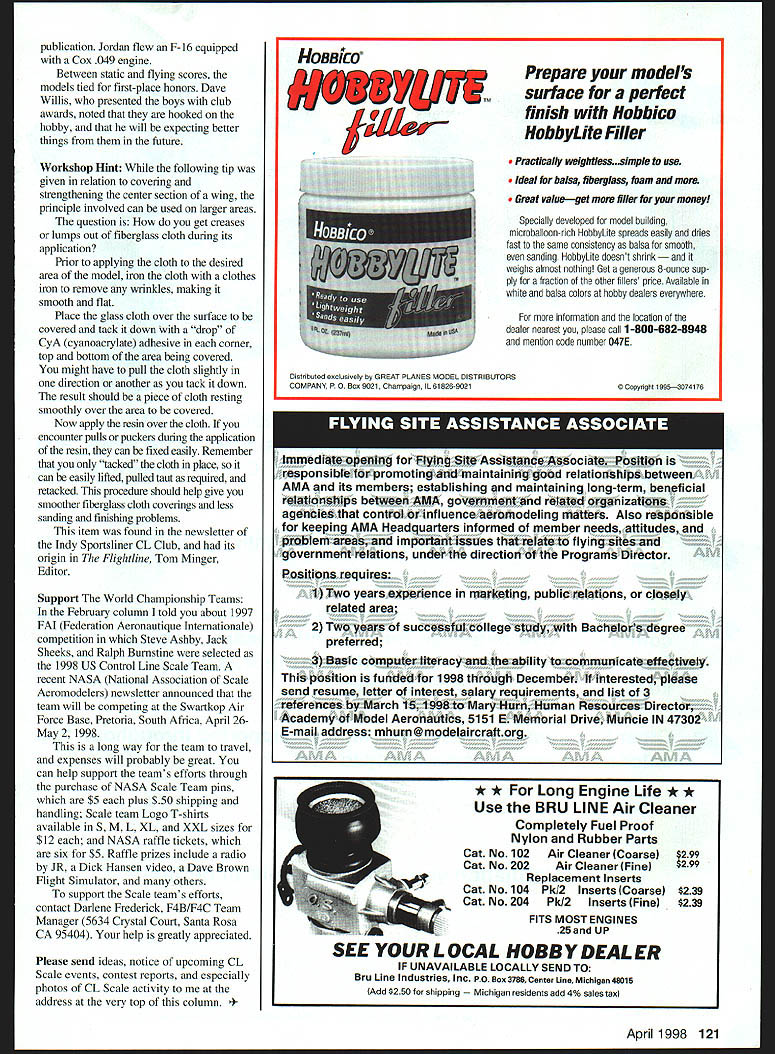 CONTROL LINE SCALE MODEL DATA main features model magazine columns photos sketches model construction workshop tips great-looking aircraft just completed ready take winners circle However person submits photos often does include much photo description overcome problem have put together form asking basic data sketch equipment give appropriate information about its use works etc photo including people tell something about involvement picture activity information allows columnist create better captions column material good thing about having photo data can give readers information about models weight power plants finish control system etc form also asks have special construction techniques ideas can pass other Scale builders ideas present might help fellow Scale modeler solve building problem Other columnists could also benefit using form least get asked-for data would happy send copies form anyone wants just send selfaddressed stamped envelope address top column hope future submissions will include requested data Model Information Form equivalent information Racing Corsair Kenneth R Smith Panna Heights OH reports Control Line CL Scale modeler Norm Skudeiin member North Coast Control Liners Club Cleveland OH honored 13th Annual Air Racing Historical Symposium having F2G Corsair model display symposiuma gathering pilots people involved Cleveland Air Races throughout yearswas held May 1997 Holiday Inn Cleveland Norms F2G Corsair # 74 its racing color scheme dark blue white tnm fashioned after F2G Corsair flown pilot Dick Becker 1948 Thompson 1949 Sohio races Mechanical problems blown reduction gear kept Corsair competing 1949 Thompson Races model scratch-built using Brian Taylor F4U plans modified meet F2G racing configuration has 60-inch span weighs about nine pounds uses standard Roberts three-line control system throttle powered OS 80 finished Sig paints Norm reported after adding about pound nose weight model handles extremely well pleasure fly little-known F2C Corsairs nicknamed Super Corsairs produced part 1944 crash program between US Navy Goodyear Aircraft produce fast powerful fighter high rate climb airplane used combat Japanese Kamikazes before reached targets Corsairs equipped Pratt & Whitney R-4300-4 engine capable developing 3500 horsepower given four-blade Hamilton-Standard Super Hydromatic propellers handle new engines power However Grummans F8F Bearcat similar capabilities F2G being used carrier interceptor end war Japan precluded need F2G 1946 several F2Gs found way Cleveland Air Races Between 1946 1949 F2Gs raced using numbers 57 74 94 reached speeds excess 390 mph closed race course hand symposium racing pilots Bill Brennand Steve Beville Bill pilot Goodyear racer Buster 1947April1998 119 great-looking 1930s racers competed Profile full-bodied class events Queen City U/C Club contest Cincinnati OH Chuck Snyder photo Brandon Jordan Mills Queen City U/C contest Brandon Norm Skuderins F2G Corsair #74 L-R Skuderin Becker Brennand holds Zero Corsair Jordan holds F-i 6 jet fighter Snyder photo Beville Queen City UC Club contest Adam Shelley photo 1949 Steve piloted Galloping Ghost P-Si Kendall Thompson Sohio races during 1947 1949 also piloted Little Spook Goodyear racer 1949 recent telephone conversation Norm learned original #74 racing Corsair purchased Crawford AutoAviation Museum Ohio will restored display purposes Its great hear another fabulous airplane WW II era will take its rightful place museum can appreciated public Contest Report Chuck Snyder Queen City U-Control Club Cincinnati Ohio reports clubs Golden Age Racing Profile Scale contest held Labor Day weekend 1997 Golden Age Racing took place Saturday competition among six clubs members Clayton Smith North Carolina flying 1930s racers models 36-inch wingspans entered two classesProfile full-bodied modelsand engine type propeller size restricted Profile full-bodied Stock class models equipped OS Max 4OFPs Unlimited models permitted equipped 40-size engine cost less $150 required swing 11inch props must have pleasant sight spectators see three scaleconfigured 930s racers air same time Sunday Scale competition club special Junior category two entrants overall number Juniors disappointing club two entries Scale event two contests have great start build Brothers Brandon Jordan Mills 13 11 years old respectively flew airplanes built Sterling/stes kits Brandon flew Zero powered NorVel 061 model wing guns radio mast belly tank documented using Aircraft Profile 120 Model Aviation 0-877-1445 f Service & Repairs Most Radio Control Systems Utilizing Calibrated Test Equipment & Spectrum Analyzers Endorsd AMA/ RCMA Sticker Station 4105 Futaba Airtronics JR Ace IliTec Tower Cirrus World Engines & WE USE GENUINE FACTORY REPLACEMENT PARTS Complete 1991 Narrow Banding & Upgrades RCD / HITEC R/C DEALER FCC Licensed Speed Control Repairs Quality Service Fast Turn Around Shipping & Insurance ExtraUPSU S MailCODs Visit home page http//wwwdnjelectronicscom Email david@dnelectronicscoifl jayne@dnjelectronics AMA #256123ARRLWBSYS Hats $995 AIRPLANE FACTORY INC 1135 FLORIDA MANDEVILLE LA 70448 Radios Engines BASIC TRAINER $8495 $595 P&H NEW AT THIS want gentle sport plane need KOMBAT 40 BASIC TRAINER spend days weeks months building trainer just see SMASHED TO SMITHEREENS learning Fly hour Everything except radio engine box No Gluing No Covering No Sanding No Tears CRASH required 40146 size engine four channel radio big 60 wing span tricycle gear weighing 5-1/2 pounds BASIC TRAiNER easy land can take some real punishment Most crashes usually result just couple broken nylon bolts can easily replaced minutes keep flying hours Available Red Yellow Orange Blue Order today Sport model KOMBAT 40 available $7495 VISA/MC/AMEX/COD 1-800-264-7840 FREE CATALOG 504 626-7840 publication Jordan flew F- 16 equipped Cox 049 engine Between static flying scores models tied first-place honors Dave Willis presented boys club awards noted hooked hobby will expect