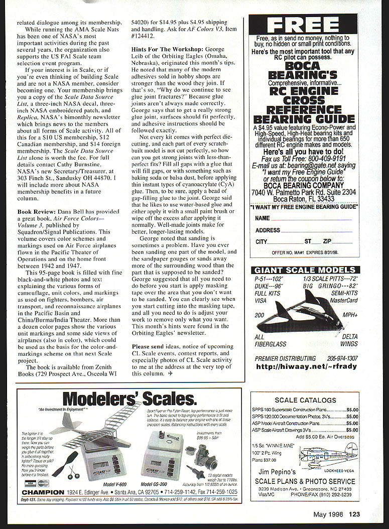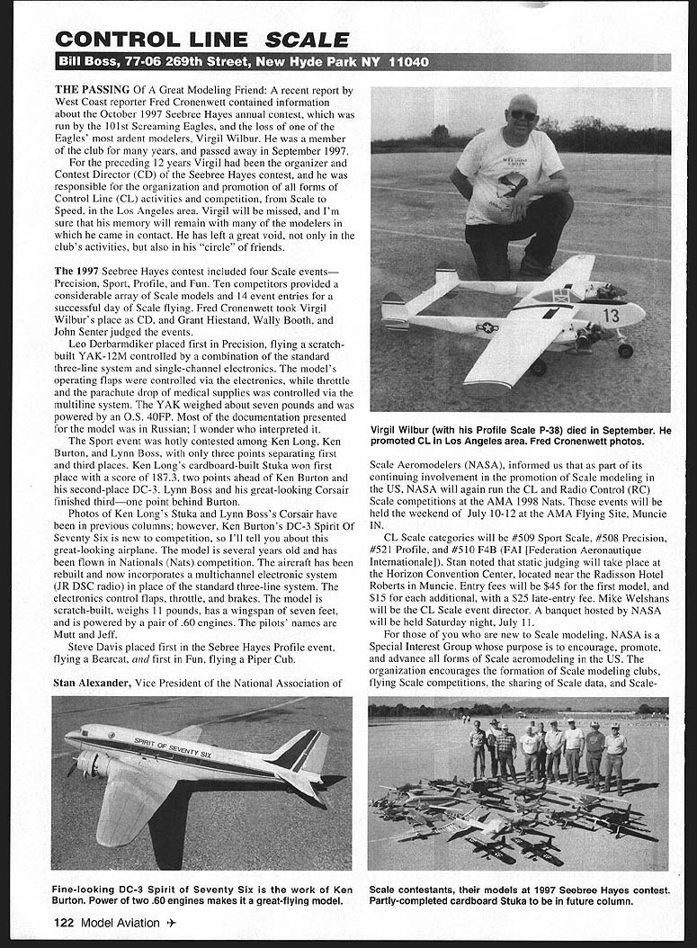 CONTROL LINE SCALE THE PASSING Great Modeling Friend recent report West Coast reporter Fred Cronenwett contained information about October 1997 Seebree Hayes annual contest run 101st Screaming Eagles loss Eagles ardent modelers Virgil Wilbur member club years passed away September 1997 preceding 12 years Virgil organizer Contest Director CD Seebree Hayes contest responsible organization promotion forms Control Line CL activities competition Scale Speed Los Angeles area Virgil will missed Im sure memory will remain modelers came contact has left great void clubs activities also circle friends 1997 Seebree Hayes contest included four Scale events Precision Sport Profile Fun Ten competitors provided considerable array Scale models 14 event entries successful day Scale flying Fred Cronenwett took Virgil Wilburs place CD Grant Hiestand Wally Booth John Senter judged events Leo Derbarmdiker placed first Precision flying scratchbuilt YAK-12M controlled combination standard three-line system single-channel electronics models operating flaps controlled via electronics throttle parachute drop medical supplies controlled via multiline system YAK weighed about seven pounds powered OS 4OFP Most documentation presented model Russian wonder interpreted Sport event hotly contested among Ken Long Ken Burton Lynn Boss three points separating first third places Ken Longs cardboard-built Stuka won first place score 1873 two points ahead Ken Burton second-place DC-3 Lynn Boss great-looking Corsair finished thirdone point behind Burton Photos Ken Longs Stuka Lynn Bosss Corsair have previous columns however Ken Burtons DC-3 Spirit Seventy Six new competition Ill tell about great-looking airplane model several years old has flown Nationals Nats competition aircraft has rebuilt now incorporates multichannel electronic system JR DSC radio place standard three-line system electronics control flaps throttle brakes model scratch-built weighs 11 pounds has wingspan seven feet powered pair 60 engines pilots names Mutt Jeff Steve Davis placed first Sebree Hayes Profile event flying Bearcat first Fun flying Piper Cub Stan Alexander Vice President National Association Scale Aeromodelers NASA informed us part its continuing involvement promotion Scale modeling US NASA will again run CL Radio Control RC Scale competitions AMA 1998 Nats events will held weekend July 10-12 AMA Flying Site Muncie IN CL Scale categories will #509 Sport Scale #508 Precision #521 Profile #510 F4B FAL [Federation Aeronautique Internationale] Stan noted static judging will take place Horizon Convention Center located near Radisson Hotel Roberts Muncie Entry fees will $45 first model $15 additional $25 late-entry fee Mike Welshans will CL Scale event director banquet hosted NASA will held Saturday night July 11 new Scale modeling NASA Special Interest Group purpose encourage promote advance forms Scale aeromodeling US organization encourages formation Scale modeling clubs flying Scale competitions sharing Scale data Scale122 Model Aviation il Wilbur Profile Scale P-38 died September promoted CL Los Angeles area Fred Cronenwett photos Fine-looking DC-3 Spirit Seventy Six work Ken Scale contestants models 1997 Seebree Hayes contest Burton Power two 60 engines makes great-flying model Partly-completed cardboard Stuka future column related dialogue among its membership running AMA Scale Nats has NASAs important activities during past several years organization also supports US FAI Scale team selection event program interest Scale youre thinking building Scale NASA member consider becoming membership brings copy Scale Data Source List three-inch NASA decal threeinch NASA embroidered patch Replica NASAs bimonthly newsletter brings news members about forms Scale activity $10 US membership $12 Canadian membership $14 foreign membership Scale Data Source List alone worth fee full details contact Cathy Burnstine NASAs new Secretary/Treasurer 303 Finch St Sandusky OH 44870 1 will include about NASA membership benefits future column Book Review Dana Bell has provided great book Air Force Colors Volume 3 published Squadron/Signal Publications volume covers color schemes markings used Air Force airplanes flown Pacific Theater Operations home front between 1942 1947 95-page book filled fine black-and-white photos text explaining various forms camouflage unit colors markings used fighters bombers air transport reconnaissance airplanes Pacific Basin China/Burma/India Theater dozen color pages show various unit markings some side views airplanes also color could used basis color-andmarkings scheme next Scale project book available Zenith Books 729 Prospect Ave Osceola WI 54020 $1495 plus $495 shipping handling Ask AF Colors V3 Item #1244 12 Hints Workshop George Leib Orbiting Eagles Omaha Nebraska originated months tips noted modern adhesives sold hobby shops stronger wood join thats continue see glue joint fractures Because glue joints arent always made correctly George says get really strong glue joint surfaces should fit perfectly adhesive instructions should followed exactly kit comes perfect diecutting part scratchbuilt model cut perfectly can get strong joints less-thanperfect fits Fill gaps glue will fill gaps something such baking soda balsa dust before applying thin instant types cyanoacrylate CyA glue sure apply bead gap-filling glue joint George said likes use water-based glue either apply small paint brush wipe off excess after applying normally Well-made joints make better longer-lasting models George noted sanding sometimes problem Have ever sanding part model sandpaper gouges sands away surrounding wood part supposed sanded George suggested need before start apply masking tape over area dont want sanded can clearly see start cutting masking tape need adjust work remove what want months hints found Orbiting Eagles newsletter Please send ideas notice upcoming CL Scale events contest reports especially photos CL Scale activity address very top column no 