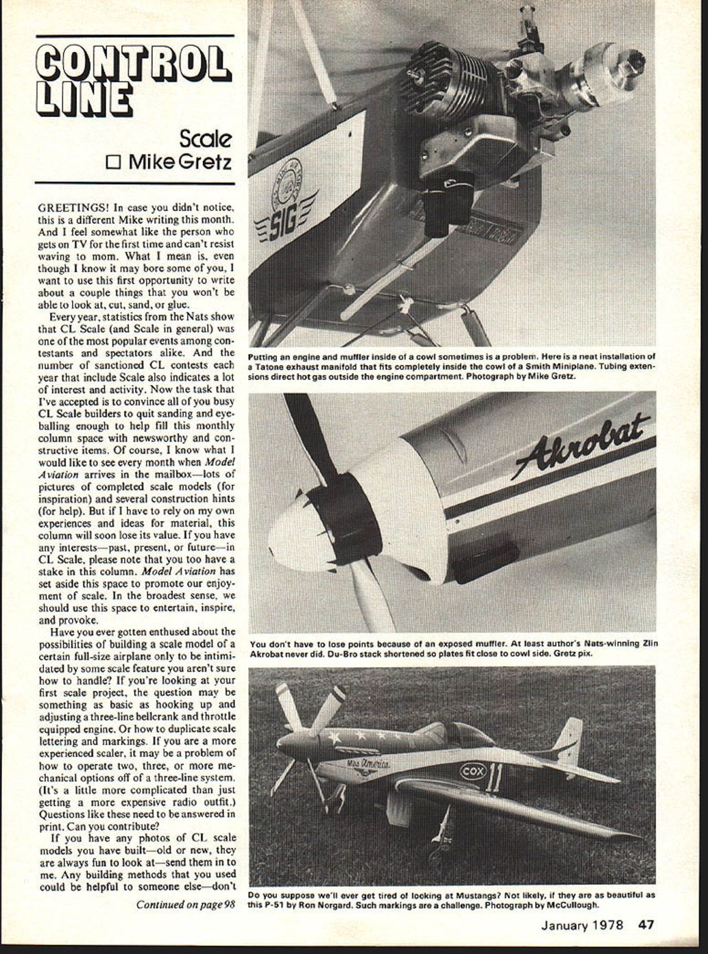 Scale 0 MikeGretz GREETINGS case didnt notice different Mike writing month feel somewhat like person gets TV first time cant resist waving mom What mean though know may bore some want use first opportunity write about couple things wont able look cut sand glue year statistics Nats show CL Scale Scale general popular events among con testants spectators alike number sanctioned CL contests year include Scale also indicates lot interest activity Now task Ive accepted convince busy CL Scale builders quit sanding eyeballing enough help fill monthly column space newsworthy con structive items course know what would like see month Model Aviation arrives mailboxlots pictures completed scale models inspiration several construction hints help have rely own experiences ideas material column will soon lose its value have interestspast present futurein CL Scale please note too have stake column Model Aviation has set aside space promote enjoy ment scale broadest sense should use space entertain inspire provoke Have ever gotten enthused about possibilities building scale model certain full-size airplane intimi dated some scale feature arent sure handle youre looking first scale project question may something basic hooking up adjusting three-line bellcrank throttle equipped engine duplicate scale lettering markings experienced scaler may problem operate two three chanical options off three-line system Its little complicated just getting expensive radio outfit Questions like need answered print Can contribute have photos CL scale models have builtold new always fun look atsend Any building methods used could helpful someone elsedont suppose well ever get tired looking Mustangs likely beautiful Continued page 98 P-51 Ron Norgard Such markings challenge Photograph Mccullough January1978 47 Putting engine muffler inside cowl sometimes problem neat installation Tatone exhaust manifold fits completely inside cowl Smith Miniplane Tubing exten sions direct hot gas outside engine compartment Photograph Mike Gretz dont have lose points because exposed muffler least authors Nats-winning Zlin Akrobat never did Du-Bro stack shortened plates fit close cowl side Gretz pix BOX 511G HIGGINSVILLE MISSOURI 64037 plane will slow down flop maneuv ers Spacing between leadouts makes difference About 2 recommended 7 Brasher big tail has proven asset rudders may prove greater help Theyll keep plane yawing tight turns Howd like tower oer oppon ents Take hint FAI Team Race guys get yourself some Elton John shoes height advantage may some thing wont want pass up Now some way increase reach wed have monkey arms Charlie Johnson 3716 Ingraham St San Diego CA 92109 CL Racing/Lee continued page 46 Tim Gillott did District 8 Rat fliers got licks qualifying four out 12 Vic Ed took finals out 24 flew finals Rat joke Once get past Tim really act together turned good 438 rest places determined screwed up least lucky enough have reason able read slow flight turned 449 second place Dickie Ritch also Houston motored 505 third just arent good times good local contest let alone Nats times supposed best wouldnt believe some things happened Rat Ron Esman Houston excellent shot last heat finals blew blade off fiberglass prop tore up plane badly Pete Storrie Denton Texas blew HP heat lot problems kept some awfully good people out money Texas typically fly tem peratures 90s humidity usually 50% range Both Rats built least three years ago until year using K&B 40S setup fuel tanks about 3 4 oz good about 55 laps year switched K&B 65 ABC engines significantly increased speed also fuel consumption However tanks still good about 50 laps using 50% fuel normally run bit mar ginal serious problem Until got Riverside temperatures Riverside usu ally 95-105 range day Along relative humidity about 1520% result increase fuel consumption about 15% sudden 50 laps per tank dwindled 42 laps still OK qualifying need 35 laps per tank should happen make finals need about 47 laps per tank go entire 140 laps two required pit stops practice night before thought might problem brought along some 40% just case made finals during break before heats began wished see what required get mileage back up turned out could get about 46 laps 42% fuel thats what ran final pilot Richard Stub blefield worked out would signal him 45 laps would hit shutoff lap later bring ship 47 laps no margin got three good tanks way made 140 laps close 138 laps engine began go lean lack fuel brought 140 plug element completely gone would never have made another lap needed Close Slow Rat owned Nashville Rats just last year have act together point being consistently better rest us year fliers pushing bunch District 8 year something like 35 Nats pre entries 20 processed flew small number 10 taken finals four being Axis Nashville bunch took first through third fourth going Harold Lambert Florida fifth sixth seventh eighth came Texas Contest Report past Labor Day participated annual Southwestern Control Line Championships Dallas Texas top contest held year District 8 racing other control-line events Judg ing results racing particu larly good Goodyear won good 609 second 612 Low qualifying 259 Rat also quite competitive three teams under 500 qualifying times event won Ron Esman Houston 443 Slow Rat best competition nine entries since time getting short event director decided run single quali fying heat take four two final heats dust settled low qualify ing 302 seventh fastest time 3159 times close together decided take six three finals 3159 didnt qualify consider cutoff time Nats two heats high six-minute area very respectable times final saw Larry Hoffman Corpus Christi winning time 6102 good some times weve heard about other areas get ting very close W R Lee 3522 Tamarisk Lane Mis souri City TX 77459 CL Scale/Gretz continued page 47 take granted being too basic send Pros cons current AMA rules ideas possible changes can aired Send Contest announcements contest results send too added encourage ment Model Avi