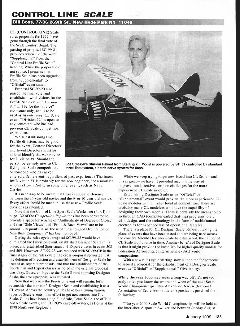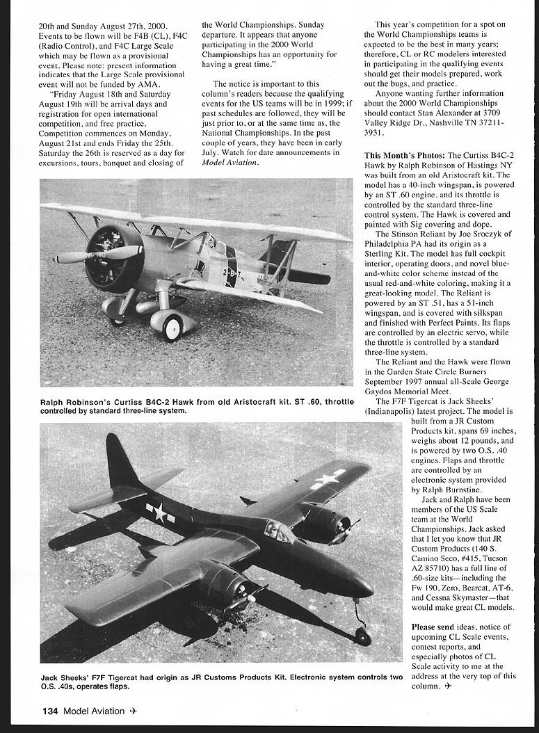 CONTROL LINE SCALE 11-Il CL CONTROL LINE Scale rules proposals 1999 have gone through final vote Scale Contest Board passing proposal SC-99-2 provides removal word Supplemental Control Line Profile Scale heading proposal did say presume Profile Scale has upgraded Supplemental Official event status Proposal SC-99-20 also passed final vote established two divisions Profile Scale event Division #1 will novice contestant used entry level CL Scale event Division #2 open contestant has previous CL Scale competition experience establishing two Profile divisions may good event Contest Directors Event Directors must able identify true novice Division #1 Should person entirely new CL flying Scale competition someone has never entered Scale event regardless past experience intent Division #1 probably real beginner modeler has flown Profile some other event such Navy Carrier Its necessary aware great difference between 25-year-old novice 9- 10-year-old novice effort should made use new Profile Scale divisions intended Note Control Line Sport Scale Worksheet Part page 132 Competition Regulations has corrected provide space scoring Authenticity Degree Gloss Side Views Front & Back Views scored 1-15 points Also need Signed Declaration Non-Built Components has removed During rules cycle proposal SC-99-23 would have eliminated Precision event established Designer Scale its place established Sportsman Expert classes event 508 509 However SC-99-23 replaced SC-99-CP final stages rules cycle cross-proposal requested deletion Precision establishment Designer Scale treated separate proposals establishment Sportsman Expert classes noted original proposal okay Based input Scale Board opposing Designer Scale cross-proposal defeated Now know Precision event will remain lets reconsider merits Designer Scale establishing CL event Across country clubs have trying various types Scale events effort get newcomers CL Scale Clubs have using Fun Scale Team Scale official AMA Scale events CL ROW rise-off-water flown 1998 Northwest Regionals keep trying get new blood CL Scaleand greatwe havent provided much way improvement incentives new challenges experienced CL Scale modeler Establishing Designer Scale Official Supplemental event would provide experienced CL Scale modeler higher level competition probably CL modelers have capability designing own models certainly means through CAD computer-aided drafting programs aid design technology form multichannel electronics expanded use operational features place CL Designer Scale taking place events have tested being used across country Should Designer Scale established caliber CL Scale would raise time Another benefit Designer Scale might provide incentive higher quality models Federation Aeronautique Internationale FAI world competitions new rules cycle starting now time someone submit proposal establishment Designer Scale event Official Supplemental Give try year 2000 may seem long way off its too early let know next Scale World Championships Stan Alexander NASA National Association Scale Aeromodelers president provided following year 2000 Scale World Championships will held Interlaken Airport Switzerland betwcen Sunday August January1999 133 Joe Sroczyks Stinson Reliant Sterling kit Model powered ST 51 controlled standard three-line system electric servo system flaps 20th Sunday August 27th 2000 Events flown will F4B CL F4C Radio Control F4C Large Scale may flown provisional event Please note present information indicates Large Scale provisional event will funded AMA Friday August 18th Saturday August 19th will arrival days registration open international competition free practice Competition commences Monday August 21st ends Friday 25th Saturday 26th reserved day excursions tours banquet closing World Championships Sunday departure appears anyone participating 2000 World Championships has opportunity having great time notice important columns readers because qualifying events US teams will 1999 past schedules followed will just prior same time National Championships past couple years have early July Watch date announcements Model Aviation years competition spot World Championships teams expected best years therefore CL RC modelers interested participating qualifying events should get models prepared work Out bugs practice Anyone wanting further information about 2000 World Championships should contact Stan Alexander 3709 Valley Ridge Dr Nashville TN 37211393 1 Months Photos Curtiss B4C-2 Hawk Ralph Robinson Hastings NY built old Aristocraft kit model has 40-inch wingspan powered ST 60 engine its throttle controlled standard three-line control system Hawk covered painted Sig covering dope Stinson Reliant Joe Sroczyk Philadelphia PA its origin Sterling Kit model has full cockpit interior operating doors novel blueand-white color scheme instead usual red-and-white coloring making great-looking model Reliant powered ST 51 has 51-inch wingspan covered silkspan finished Perfect Paints Its flaps controlled electric servo throttle controlled standard three-line system Reliant Hawk flown Garden State Circle Burners September 1997 annual all-Scale George Gaydos Memorial Meet F7F Tigercat Jack Sheeks Indianapolis latest project model built JR Custom Products kit spans 69 inches weighs about 12 pounds powered two OS 40 engines Flaps throttle controlled electronic system provided Ralph Burnstine Jack Ralph have members US Scale team World Championships Jack asked let know JR Custom Products 140 5 Camino Seco #415 Tucson AZ 85710 has full line 60-size kitsincluding Fw 190 Zero Bearcat AT-6 Cessna Skymasterthat would make great CL models Please send ideas notice upcoming CL Scale events contest reports especially photos CL Scale activity address very top column Model Aviation h Robinsons Curtiss B4C-2 Hawk old Aristocraft kit ST 60 throttle controlled standard three-line system Jack Sheeks F7F Tigercat origin JR Customs Products Kit Electronic system controls two 0S 40s operates flaps