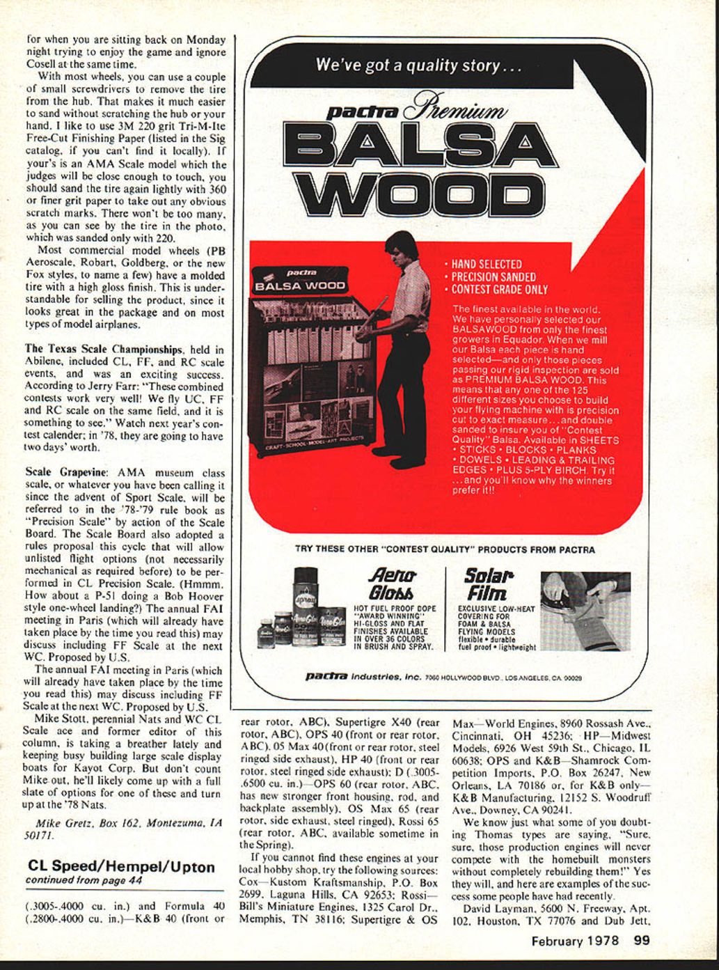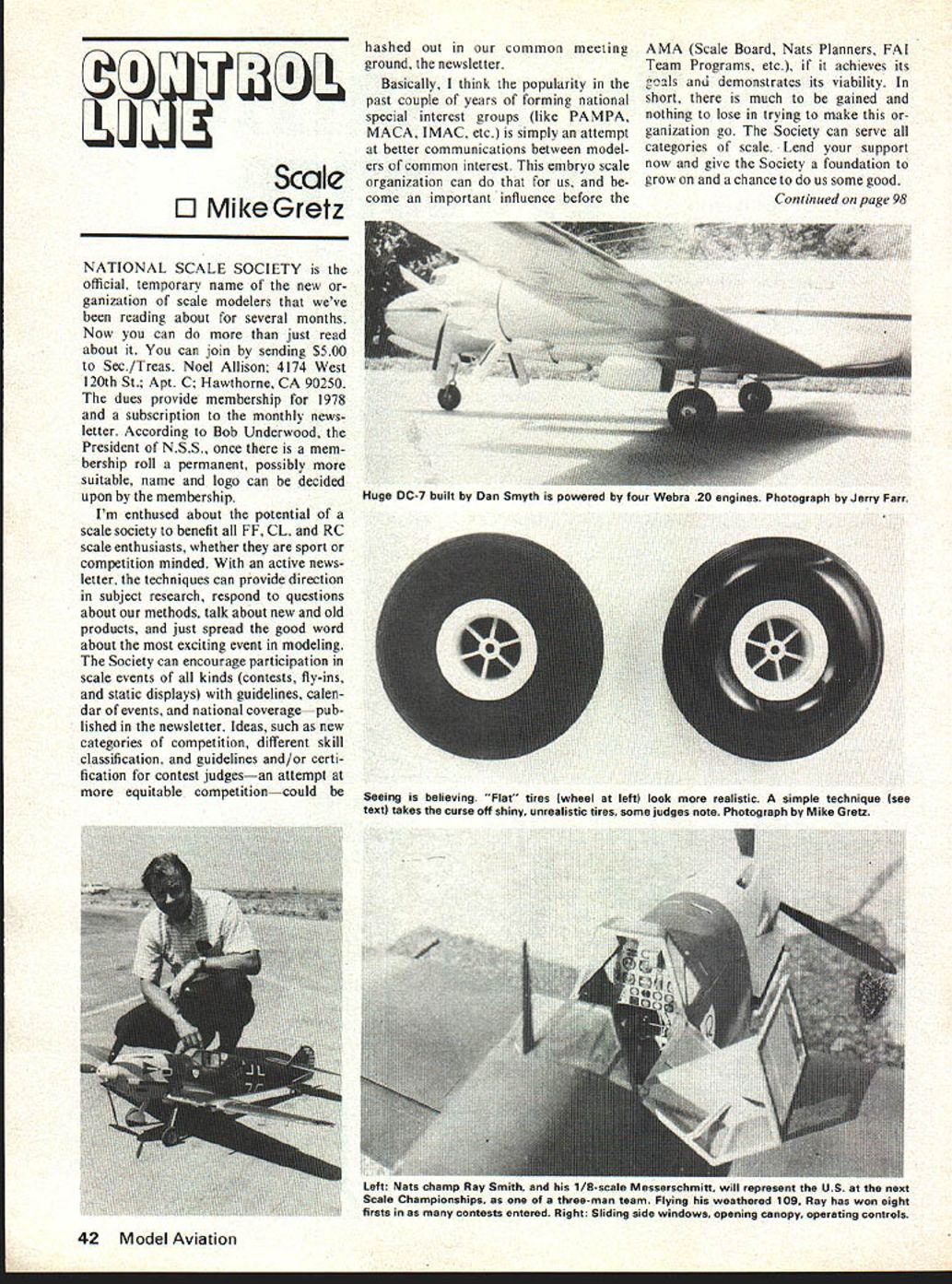 c~ncixi FrJu Scale 0 MikeGretz NATIONAL SCALE SOCIETY official temporary name new ganization scale modelers weve reading about several months Now can just read about can join sending $500 Sec/Treas Noel Allison 4174 West 120th St Apt C Hawthorne CA 90250 dues provide membership 1978 subscription monthly news letter According Bob Underwood President NSS once mem bership roll permanent possibly suitable name logo can decided upon membership Im enthused about potential scale society benefit FF CL RC scale enthusiasts whether sport competition minded active news letter techniques can provide direction subject research respond questions about methods talk about new old products just spread good word about exciting event modeling Society can encourage participation scale events kinds contests fly-ins static displays guidelines calen dar events national coverage pub lished newsletter Ideas such new categories competition different skill classification guidelines and/or certi fication contest judgesan attempt equitable competitioncould hashed out common meeting ground newsletter Basically think popularity past couple years forming national special interest groups like PAMPA MACA IMAC etc simply attempt better communications between model ers common interest embryo scale organization can us come important influence before AMA Scale Board Nats Planners FAI Team Programs etc achieves its gimis demonstrates its viability short much gained nothing lose trying make ganization go Society can serve categories scale Lend support now give Society foundation grow chance us some good Continued page 98 42 Model Aviation Huge DC-i built Dan Smyth powered four Webra 20 engines Photograph Jerry Farr Seeing believing Flat tires wheel left look realistic simple technique see text takes curse off shiny unrealistic tires some judges note Photograph Mike Gretz Left Nats champ Ray Smith 1/8-scale Messerschmitt will represent US next Scale Championships three-man team Flying weathered 109 Ray has won eight firsts contests entered Right Sliding side windows opening canopy operating controls U R T S S UEMhI V PLANS aLflEI U sY RALPH BECK NOW AVAILABLE FROM 170d0 ENT CORP P0 BOX 9641SAN DIEGO CALIFORNIA 92109 SEND 1O FOR COMPLETE CATALOG OF AIRCRAFT HARDWARE & ACCESSORIESPLUS DESCRIPTIVE JENNYBROCHURE prevent condition Seems like lot work pays off ABC Its really hard tell whats hap pening chrome bore visual signs lot harder see look two things First shiny spots actually just little shinier rest chrome surface hold sleeve up strong light attempt cast shadow top piston comes top stroke shadow means oversize piston has pushed chrome deformed brass substrate beneath either condition lapping indicated Ringed Piston want sleeve shiny top bottom ring travel around surface sleeve either out round warped bulged spots Look rings carefully perfectly wear pattern rings case ringed pistons round true sleeves round rings necessary maximum power must try achieve condi tion difference can easily amount nearly 1000 rpm flying prop Now some basic procedures have followed lets continue running engine Assume engine running fine problems have identified solved Run engine short 2-minute runs until will hold really full power setting dura tion run switch prop 1 pitch lower ss diam eter repeat runs rich settings full power Examine engine continu ously during run signs over heating inability hold rpm fixed setting etc purpose smaller pitch diameter props prepare engine run satisfactorily rpms will achieve air some prop will run 3000 rpm faster intend fly want finish initial break-in Assuming have used same basic fuel started now time switch potent fuels intend use start 5% nitro fuel except FAT fuel engines switch fuel intended use flying RC 12% nitro good year-around brew CL 12% stunt sport 40% second step running high-nitro engines fol lowed 65% 78% depending high nitro application Again start flight prop short runs until engine stabi lizes put lower load props until engine runs easily 3000 rpm over flight prop rpm successive fuels until reach final brew Got notebook Conclusion will achieve two really important objectives following pro cedures outlined First will acquire ability understand some intrica cies engine operate will assured have top mechani cal condition properly prepared fly Second will learn operate engine what sounds like re acts what needle valve response likes started choke prime etc means go out fly will know engine prob lems come up engine initially installed plane boat car will know source problem engine something else Bench running can developed pro vide serious modeler far formation Two examples 1 Running several engines identical make comparison performance swapping parts between engines get best engine J E Albritton Herb Stock ton ran seven Supertigre 29s session recorded 900 rpm difference between best worst engine methodically swapped parts among engines obtain best crankcase bear ings crank rod piston-sleeve set head almost went nuts taking things apart keeping track swaps Net result 700 rpm over best seven engines Analysis what best-best engine provided basis what developing still power provided recorded what did what notebook kept track important observations 2 Running engines dynamometer making power fuel consumption tests sophisticated work type sometimes produces results swap-and-try method just mentioned Ill cover sophisticated testing development procedures later articles next article will power trains engine mount tank prop accessories put model make go Don Jehlik 438 Schweer Dr Star Route 1 Hawthorne NV 89415 CL Scale/Gretz continued page 42 Super Team Ray Smith Los Alamitos California highest ranking member 1978 FAT CL Scale Team having won first both Open AMA Scale team selection program 77 Nats Riverside Ray plans add detail already outstanding Nats winning Messerschmitt BF-109E use World Championships World Cham pionships tenatively scheduled early August England Dimensionally Rays scratch-built Messersch