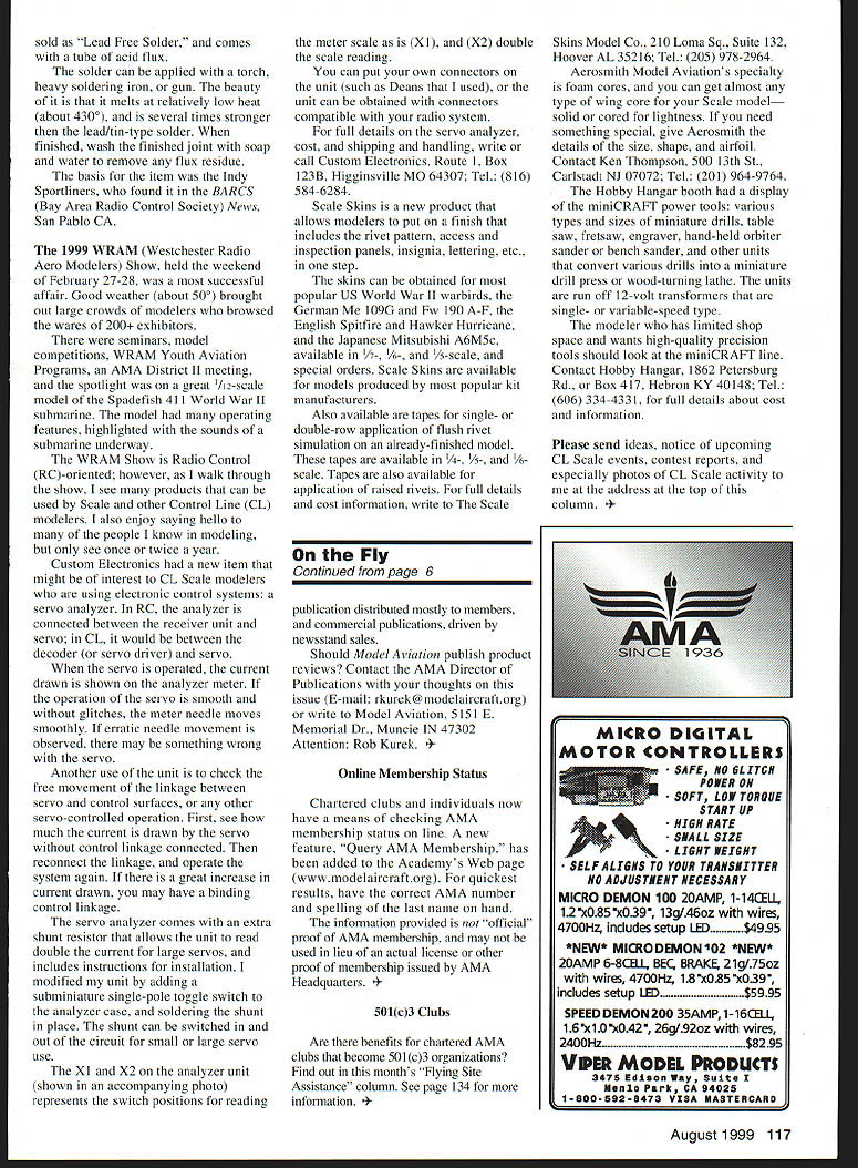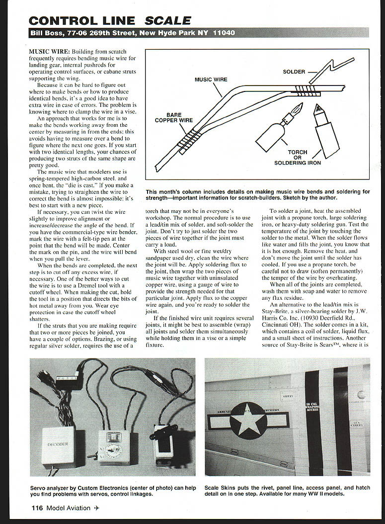 CONTROL LINE SCALE fl U -41-L -1 &-1-i l7U ~ — MUSIC WIRE Building scratch frequently requires bending music wire landing gear internal pushrods operating control surfaces cabane struts supporting wing Because can hard figure out make bends produce identical bends its good idea have extra wire case errors problem knowing clamp wire vise An approach works make bends working away center measuring ends avoids having measure over bend figure next goes start two identical lengths chances producing two struts same shape pretty good music wire modelers use spring-tempered high-carbon steel once bent die cast make mistake trying straighten wire correct bend almost impossible its best start new piece necessary can twist wire slightly improve alignment increase/decrease angle bend have commercial-type wire bender mark wire felt-tip pen point bend will made Center mark pin wire will bend pull lever bends completed next step cut off excess wire necessary better ways cut wire use Dremel tool cutoff wheel making cut hold tool position directs bits hot metal away Wear eye protection case cutoff wheel shatters struts making require two pieces joined have couple options Brazing using regular silver solder requires use months column includes details making music wire bends soldering strengthimportant information scratch-builders Sketch author torch may everyones workshop normal procedure use lead/tin mix solder soft-solder joint Dont try just solder two pieces wire together joint must carry load steel wool fine wet/dry sandpaper used dry clean wire joint will Apply soldering flux joint wrap two pieces music wire together uninsulated copper wire using gauge wire provide strength needed particular joint Apply flux copper wire again youre ready solder joint finished wire unit requires several joints might best assemble wrap joints solder simultaneously holding vise simple fixture solder joint heat assembled joint propane torch large soldering iron heavy-duty soldering gun Test temperature joint touching solder metal solder flows like water fills joint know hot enough Remove heat dont move joint until solder has cooled use propane torch careful draw soften permanently temper wire overheating joints completed wash soap water remove flux residue An alternative lead/tin mix Stay-Brite silver-bearing solder JW Harris Co Inc 10930 Deerfield Rd Cincinnati OH solder comes kit contains coil solder liquid flux small sheet instructions Another source Stay-Brite SearsTM 116 Model Aviation ER MUSIC WIRE COPPER WIRE T%RCH / SOLDERING IRON Servo analyzer Custom Electronics center photo can help Scale Skins puts rivet panel line access panel hatch find problems servos control linkages detail step Available WW II models sold Lead Free Solder comes tube acid flux solder can applied torch heavy soldering iron gun beauty melts relatively low heat about 4300 several times stronger lead/tin-type solder finished wash finished joint soap water remove flux residue basis item Indy Sportliners found BARCS Bay Area Radio Control Society News San Pablo CA 1999 WRAM Westchester Radio Aero Modelers Show held weekend February 27-28 successful affair Good weather about 500 brought out large crowds modelers browsed wares 200 exhibitors seminars model competitions WRAM Youth Aviation Programs AMA District II meeting spotlight great /12-scale model Spadefish 411 World War 11 submarine model operating features highlighted sounds submarine underway WRAM Show Radio Control RC-oriented however walk through show see products can used Scale other Control Line CL modelers also enjoy saying hello people know modeling see once twice year Custom Electronics new item might interest CL Scale modelers using electronic control systems servo analyzer RC analyzer connected between receiver unit servo CL would between decoder servo driver servo servo operated current drawn shown analyzer meter operation servo smooth glitches meter needle moves smoothly erratic needle movement observed may something wrong servo Another use unit check free movement linkage between servo control surfaces other servo-controlled operation First see much current drawn servo control linkage connected reconnect linkage operate system again great increase current drawn may have binding control linkage servo analyzer comes extra shunt resistor allows unit read double current large servos includes instructions installation modified unit adding subminiature single-pole toggle switch analyzer case soldering shunt place shunt can switched out circuit small large servo use Xl X2 analyzer unit shown accompanying photo represents switch positions reading meter scale XI X2 double scale reading can put own connectors unit such Deans used unit can obtained connectors compatible radio system full details servo analyzer cost shipping handling write call Custom Electronics Route Box 123B Higginsville MO 64307 Tel 816 584-6284 Scale Skins new product allows modelers put finish includes rivet pattern access inspection panels insignia lettering etc step skins can obtained popular US World War II warbirds German 109G Fw 190 A-F English Spitfire Hawker Hurricane Japanese Mitsubishi A6M5c available /7- /6- A-scale special orders Scale Skins available models produced popular kit manufacturers Also available tapes single- double-row application flush rivet simulation already-finished model tapes available 1/4. /5. /6scale Tapes also available application raised rivets full details cost information write Scale Fly Continued page 6 publication distributed mostly members commercial publications driven newsstand sales Should Model Aviation publish product reviews Contact AMA Director Publications thoughts issue E-mail rkurek@modelaircraftorg write Model Aviation 5151 E Memorial Dr Muncie IN 47302 Attention Rob Kurek ne Membership Status Chartered clubs individuals now have means checking AMA membership status line new feature Query AMA Membership has added Academys Web page wwwmodelaircraftorg quickest result