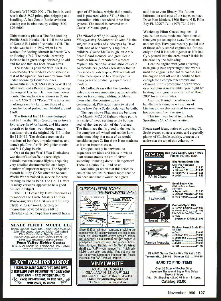 CONTROL LINE SCALE RECENT MAIL included letter Barry Murill Chandler AZ just read June column Model Aviation regarding Scale documentation wanted let us know some sources found very useful Barry said currently interested Free Flight FF Scale Radio Control RC sailplanes working /5scale model P-40C Jerry Bates plans also builds /72-scale smaller plastic models has yet tried Control Line CL Barry reads Model Aviation columns valuable information provide hope Barry will try hand CL Scale flying experience joy Control Line Fliers find building directly controlling flight models Barry suggests Scale Aviation Modeller International magazine published United Kingdom source documentation color schemes line drawings issue contains several pages color artwork line drawings featuring particular aircraft latest issue Volume 5 Number 4 contains artwork Macchi MC202 article building 42-scale model P-40C Flying Tigers colors interior five color schemes A-26 Invader Barry picks up monthly copy local grocery store $595 full subscription other fine foreign modeling magazines can obtained through Wise Owl Worldwide Publications 4314 West 238th St Torrance CA 90505-4509 Tel 310 375-6258 full subscription $56 surface transportation $72 air valuable source marking information plasticmodel company AeroMaster wwwaeromastercom decals outstanding color instruction sheets really stand out would found useful Scale modelers source Barry finds fun Champlain Fighter Aircraft Museum Mesa AZ has volunteer docent several years has opportunity photograph great detail aircraft collection Barry also suggests encourages readers living near aircraft museum should look idea joining result winwin situation museums get people interested willing help modelers get great documentation source Barry mentioned building 4-scale P-40 done Flying Tigers color scheme brought mind book P-40 that great source information Written Frederick Johnson P-40 WARHAWK Warbird History provides great detail history chronology use Curtiss P-40 theaters operation during World War II book 120 pages contains black-andwhite photos has eight pages color showing several color schemes also couple good photos cockpit instrument panel few construction books appendix contains listing information aircrafts used fighters bombardment reconnaissance lists pursuit groups countries aircraft served table United States Army/Air Force USAAF Serial Numbers comparison data selected aircraft also used Allison V-1710 Merlin engines must-have book P-40 lovers book has International Standard Book Number ISBN 0-7603-0253-7 can obtained local bookstores well Zenith Books 729 Prospect Ave Box 1 126 Model Aviation ld Laird brother Donalds CASA 2111 Pedro Spanish Air Force markings power two K&B 19 Greenheads Dave Copeman 1911 Cessna Wingspan 57 inches 65 pounds ST 45 power Standard three-line bellcrank system Osceola WI 54020-0001 book well worth $1995 price plus shipping handling free Zenith Books aviation catalog can obtained calling 800 826-6600 months photos fine-looking Profile Scale Heinkel 11 lH work Donald E Laird Ashtabula OH model built 1967 Laird worked Boeing Aircraft Seattle WA Boeings 747 model certainly looks great shape being old has flown often model powered K&B 19 Greenheads models color scheme Spanish Air Force version built under license Construcciones Aeronauticas SA CASA after WW II fitted Rolls Royce engines replacing original German Daimler-Benz power plants airplane known Spain CASA 2111 Pedro color markings used Laird plane found parked near Madrid around 1960 Heinkel 11 designed built 1930s according Janes Encyclopedia Aviation like aircraft its time went through versionsfrom original Ill 11 1H-16 airplane took missions bomber torpedo bomber launch platform Hs 293 glider bombs V-i flying-bombs pre-World War II missions Luftwaffes secret highaltitude reconnaissance flights acquiring very detailed documentation large number important targets Spanish aircraft built CASA after Second World War remained service crew training late 1970 ill its versions appears good full-scale subject 1911 Cessna Dave Copeman member Circle Masters Club Wisconsin first aircraft built Clyde V Cessnaa Blriot-type monoplane powered 60 hp Elbridge engine Copemans model has span 57 inches weighs 65 pounds powered ST 45 controlled standard three-line system model covered CoverireTM epoxy Black Art Building Fibergiassing Techniques Volume subject series videotapes Dave Platt countrys top Scale builders Claude McCullough AMA Scale Board member great Scale modeler himself reported recent Replica National Association Scale Aeromodelers NASA newsletter series videotapes Platt reveals techniques has developed years producing superb Scale models McCullough says two-hour video shows innovative approach after another solving building problems construction conventional Platt adds new twist shows fast Scale model can built tape shows Platt start building Macchi MC200 fighter part strip wood serving bottom keel rear portion fuselage first piece glued keel complete tail wheel rudder horn unit something us would consider part Z no madness soon becomes clear Dropped neatly between sequences hints kinks Platt demonstrates art silversoldering Planking doesnt fit together quick fixand McCullough noted series best instructional tapes has seen would great CUSTOM LETTER TODAY. THE VINYL WRITE WAY t.LLFFTEjRRFRTnPE Since 1987 mail order company providing modeler EZ apply custom lettering logos stars etc choices type styles & colors decall custom cut pre-aligned & pre-spaced premium vinyl planes boats trains toys etc Heights 1/4 12 Priced right eg AMA er 1 high $250 . color style0 Find out what can youl Sample infopack tree Please include #10 SASE inquires 16043 TULSA STREET GRANADA HiLLS CA 91344 818-363-7131 - Mon Thur 10-4pm PST E-Mail vinyirl@reiaypointnet Plus $2 P/H Ca res add fox PflOTEOTIVERflc$ addition library further information cost rapes contact Dave Platt Models 1306 Havre NE Palm Bay FL 32907 