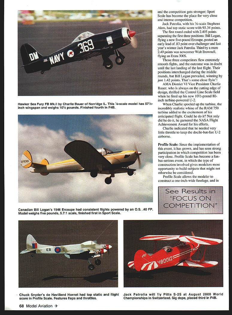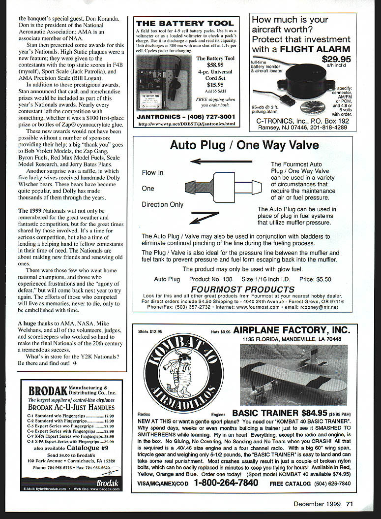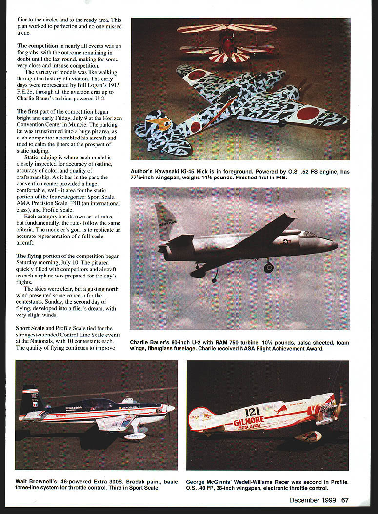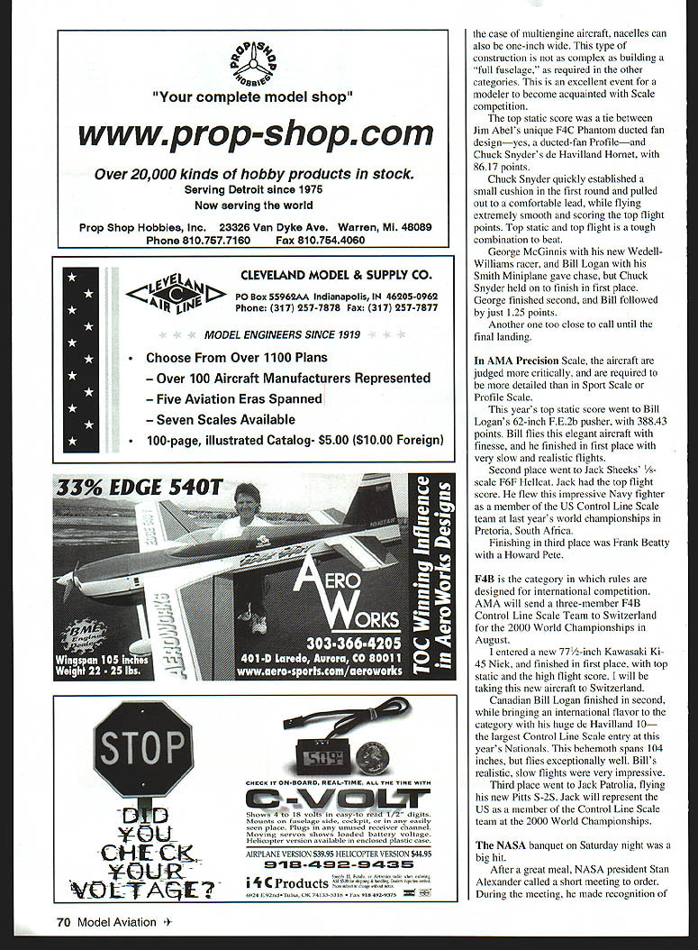 CONTROL LINE SCALE HE INTERNATIONAL Aeromodeling Center happenin place 1999 Control Line Scale National Championships hosted National Association Scale Aeromodelers NASA beautiful 1000-acre flying facility provided Academy Model Aeronautics Muncie Indiana meticulously groomed well-prepared centrally located L-shaped flying site otherwise known L-pad provided extremely smooth flying surface offering model small large opportunity smooth takeoff greased landing year National Championships grows numbers excitement well quality efficiency Mike Welshans NASA vice president provided expert experienced leadership event director Mike has guided CL Scale three years row four last eight years competitors beneficiaries invaluable experience corps capable well-versed volunteers order accommodate number contestants years Nationals four categories flown two circles increased efficiency over last years use circle easing workload flying judges competitor assigned fly circle circle B flying judges rotating switching circles after first two rounds offered contestants opportunity fly front two sets judges Mike directed both flying circles precision movie director calling 66 Model Aviation Patrolias 4-pound 1k-scale Stephen Akro takes off powered ST 40 Used Sig dope Top static score Sport Scale second-place finish Jack Sheeks Indianapolis IN guides F6F Hellcat soft touch go Scratchbuilt Brian Taylor plans powered 0S 90 FS spans 64 inches Jim Abels unique F4C Phantom ducted fan Profile Scale tied top static score K&B 75 48-inch wingspan 76 pounds flier circles ready area plan worked perfection no missed cue competition nearly events up grabs outcome remaining doubt until last round making some very close intense competition variety models like walking through history aviation early days represented Bill Logans 1915 FE2b through aviation eras up Charlie Bauers turbine-powered U-2 first part competition began bright early Friday July 9 Horizon Convention Center Muncie parking lot transformed huge pit area competitor assembled aircraft tried calm jitters prospect static judging Static judging model closely inspected accuracy outline accuracy color quality craftsmanship As has past convention center provided huge comfortable well-lit area static portion four categories Sport Scale AMA Precision Scale F4B international class Profile Scale category has its own set rules fundamentally rules follow same criteria modelers goal replicate accurate representation full-scale aircraft flying portion competition began Saturday morning July 10 pit area quickly filled competitors aircraft airplane prepared days flights skies clear gusting north wind presented some concern contestants Sunday second day flying developed fliers dream very slight winds Sport Scale Profile Scale tied strongest-attended Control Line Scale events Nationals 10 contestants quality flying continues improve December 1999 67 Authors Kawasaki Ki-45 Nick foreground Powered OS 52 FS engine has 77-inch wingspan weighs 14 pounds Finished first F4B Charlie Bauers 80-inch U-2 RAM 750 turbine 10 pounds balsa sheeted foam wings fiberglass fuselage Charlie received NASA Flight Achievement Award Walt Brownells 46-powered Extra 300S Brodak paint basic George McGinnis Wedell-Willams Racer second Profile three-line system throttle control Third Sport Scale OS 40 FP 38-inch wingspan electronic throttle control competition gets stronger Sport Scale has become place very close intense competition Jack Patrolia /6-scale Stephens Akro top static score 9334 points first round ended 2495 points separating first three positions Bill Logan flying new five-pound Ercoupe posted early lead 83 point over challenger last years winner Jack Patrolla Third mere 249 points newcomer Walt Brownell flying Extra 300S three competitors flew extremely smooth fights outcome doubt until last landing last flight positions interchanged during middle rounds Bill Logan prevailed winning just 142 points Thats some close flyin AIVIA District VI Vice President Charlie Bauer always cutting edge design thrilled Control Line Scale field fired up new l0/2-pound 80inch turbine-powered U-2 Charlie spooled up turbine incredibly realistic whine RAM 750 turbine added excitement anticipated flight Could did garnered NASA flight Achievement Award efforts Charlie indicated needed very little throttle keep docile-but-fast U-2 airborne Profile Scale Since implementation event has grown has seen strong participation competition has very close Profile Scale has become funbut-serious event type construction involved gives modelers opportunity build subjects might otherwise considered Profile Scale allows modeler construct one-inch-wide fuselage 68 Model Aviation er Sea Fury FB Mkll Charlie Bauer Norridge IL k-scale model has 57/2inch wingspan weighs 10 pounds Finished fourth F4B Canadian Bill Logans 1946 Ercoupe consistent flights powered 05 40 FP Model weighs five pounds 571 scale finished first Sport Scale Chuck Snyders de Havilland Hornet top static flight Jack Patrolia will fly Pitts S-2S August 2000 World score Profile Scale Features flaps throttles Championships Switzerland Sig dope placed third F4B CHECK TONA LTUETMEWYH 080flea y o ead 12 dg Mounts fuselage side cockpit easily seen place Plugs unused receiver channel Moving servos shows loaded battery voltage Helicopter version available enclosed plastic case AIRPLANE VERSION $3995 HELICOPTER VERSION $4495 I3422-34-3 iiCproducts C4 6924 C 92edTI5a OK 741338 9 case multiengine aircraft nacelles can also one-inch wide type construction complex building full fuselage required other categories excellent event modeler become acquainted Scale competition top static score tie between Jim Abels unique F4C Phantom ducted fan designyes ducted-fan Profileand Chuck Snyders de Havilland Hornet 8617 points Chuck Snyder quickly established small cushion first round pulled out comfortable lead flying extremely smooth scoring top flight points Top static top flight tough combi
