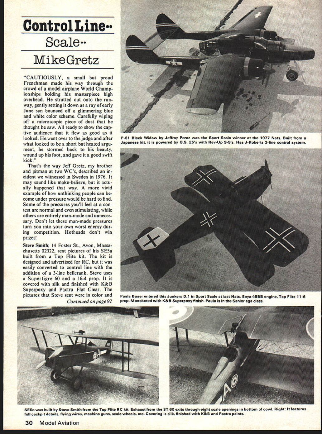 Control Line. Scale Mike Gretz CAUTIOUSLY small proud Frenchman made way through crowd model airplane World Champ ionships holding masterpiece high overhead strutted out onto run way gently setting down ray early June sun bounced off glimmering blue white color scheme Carefully wiping off microscopic piece dust thought saw ready show cap tive audience flew good looked went over judge after what looked short heated argu ment stormed back beauty wound up foot gave good swift kick Thats way Jeff Gretz brother pitman two WCs described cident witnessed Sweden 1976 may sound like make-believe actu ally happened way vivid example unthinking people can come under pressure would hard find Some pressures youll feel con test normal stimulating others entirely man-made unneces sary Dont let man-made pressures turn own worst enemy dur ing competition Hotheads dont win prizes Steve Smith 14 Foster St Avon Massa chusetts 02322 sent pictures SE5a built Top Flite kit kit designed advertised RC easily converted control line addition 3-line bellcrank Steve uses Supertigre 60 16-4 prop covered silk finished K&B Superpoxy Pactra Flat Clear pictures Steve sent color Continued page 92 SE5a built Steve Smith Top Flite RC kit Exhaust ST 60 exits through eight scale openings bottom cowl Right features full cockpit details flying wires machine guns scale wheels etc Covering silk finished K&B Pactra paints 30 Model Aviation P61 Black Widow Jeffrey Perez Sport Scale winner 1977 Nats Built Japanese kit powered OS 25s Rev-Up 9-Ss Has J-Roberts 3-line control system Paula Bauer entered Junkers 01 Sport Scale last Nats Enya 45BB engine Top Flite 11-6 prop Monokoted K&B Superpoxy finish Paula Senior age class uses Cox 15 Prop 9 X 3 8 lon gas tank mounted very easily using two screweyes opened up rubberbands centered behind engine Check CG adding weight required plane flown 52 lines 015 dia Flying first flights use outer hole control horn since planes reactions will milder inner ones used Since frontal area profile plane small model really moves out under power After start engine run ning satisfaction move out center circle double check controls ready give part ner signal release plane As speeds along ground slowly feed small amount up takes off reaches about 10 feet altitude level off Move handle gently get feel plane before start violent maneuvers As know model has different characteristics rates re sponse Know model first before ex perimenting motor stops grad ually feed up get close ground perfect three-point landing Im sure will thrilled have fly historic powerful looking model Fully decorated looks great CL Scale/Gretz continued page 30 rephotographed black white thus loosing some sharpness process hope what see magazine adequately conveys ex cellence Steves workmanship scale details part what Steve wrote letter first tough fly 4 oz extra nose weight correct deflec tion ailerons flies great use Tatone expansion chamber exhausting down chamber under motor mounts exhaust leaves plane eight openings bottom pan has full cockpit guns Williams Brothers plan enter few contests planeits fun competing whether win lose Test Flying Problem Ab thrill test flying new scale masterpiece first timebut what something goes wrong As recent case Last Sun day day guess what couldnt get off ground Ryan weighs 8 pounds Fox 60 Perry carb 14-6 proplots power plane almost wants stand its tail held vertically engine running Wheels roll freely Balance UC per plans plane released take-off controls elevator/flaps neutral plane noses over immediately breaks prop Incidentally flying field close-cut grass smooth enough 15-size planes up dont want add weight tail keep down because 8Y4 plus pounds balance basically OK Id never experienced before talked experienced friend last night RC field solution give full up elevator would also mean flaps down keep tail down taxi-takeoff until flying speed almost obtained neutralize somewhat come off up fly have thoughts suggestions youve flown taildragger type scale model before probably recognize problem Nine times out ten nothing wrong model itself tendency taildraggers nose over start takeoff run also landing Ive done both Zlin Akrobat What needed pilot retrained full-scale-like flying techniques scale model has too much weight its wheels too high thrust line CG take off non-scale controlline models attempt normal control line style takeoff full power high throttle quick release scale model will almost invariably end up nosing over engine trying pull model forward point high above wheels long lever model thus starts rotate around wheels because lack airflow over tail surfaces paved hard surface run way wheels can move freely problem lessened 92 Modet Aviation 7060 HOLLYWOOD BLVD LOS ANGELES CA 90028 * U liii EC PER MENTAL KDH propeller decal sheet #1147 provides authentic insignia put crowning oucn scale propeller decal sheet accurately reproduced full color Available Hobby Lobby International 3 Franklin Pike Circle Brentwood TN 37027 $345 plus $1 postage EU 5155 E M EN TA L eliminated Non-scale CL models can get away full power takeoff because usually very light thrust line CG low landing gear can moved forward regard whether scale full-scale type takeoff easier safer scale model well being much impressive Thus doubly important CL scale model equipped throttlable engine throttle just added gim mick get contest points another responsive critical control requiring equal attention along elevator Nose-over takeoff can often elimi nated 1 Applying power slowly smoothly Note full-size high-pow ered Mustangs etc have known nose over throttle advanced too quickly 2 Hold full up elevator start takeoff roll Flaps down usually wont hurt point Gradu ally let off up plane gathers speed lift-off should hardly holding up elevator Try slow realistic climb-out 3 Dont takeoff wind directly back Start takeoff down circle slightly wind coming over left shoulder During landing scale model can have nose-over problem similar seen 