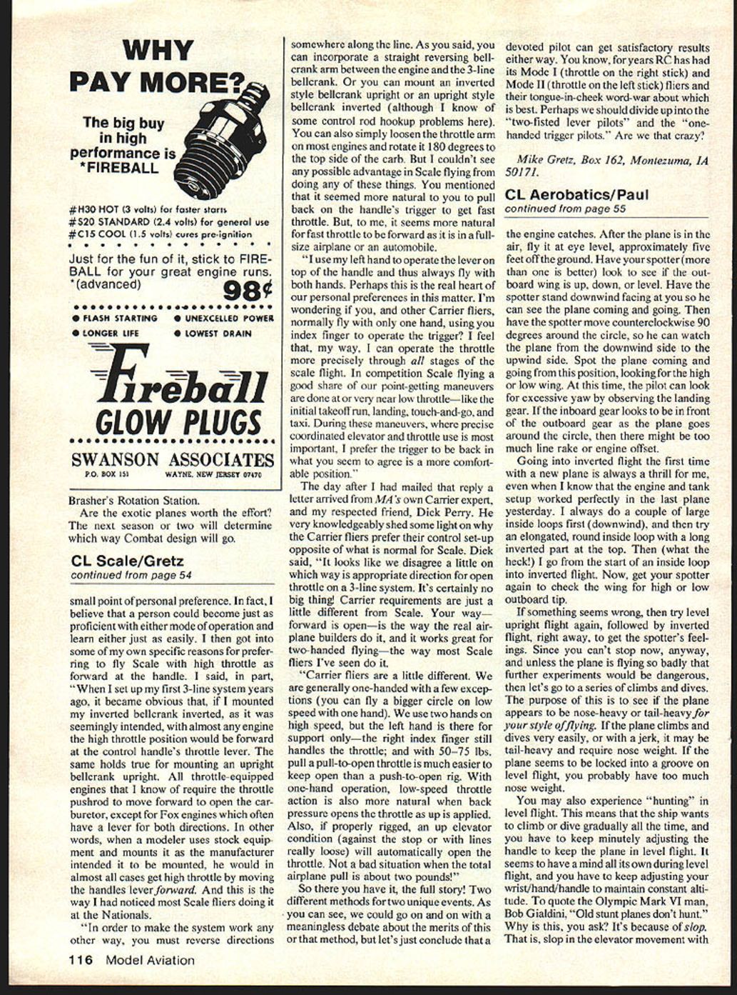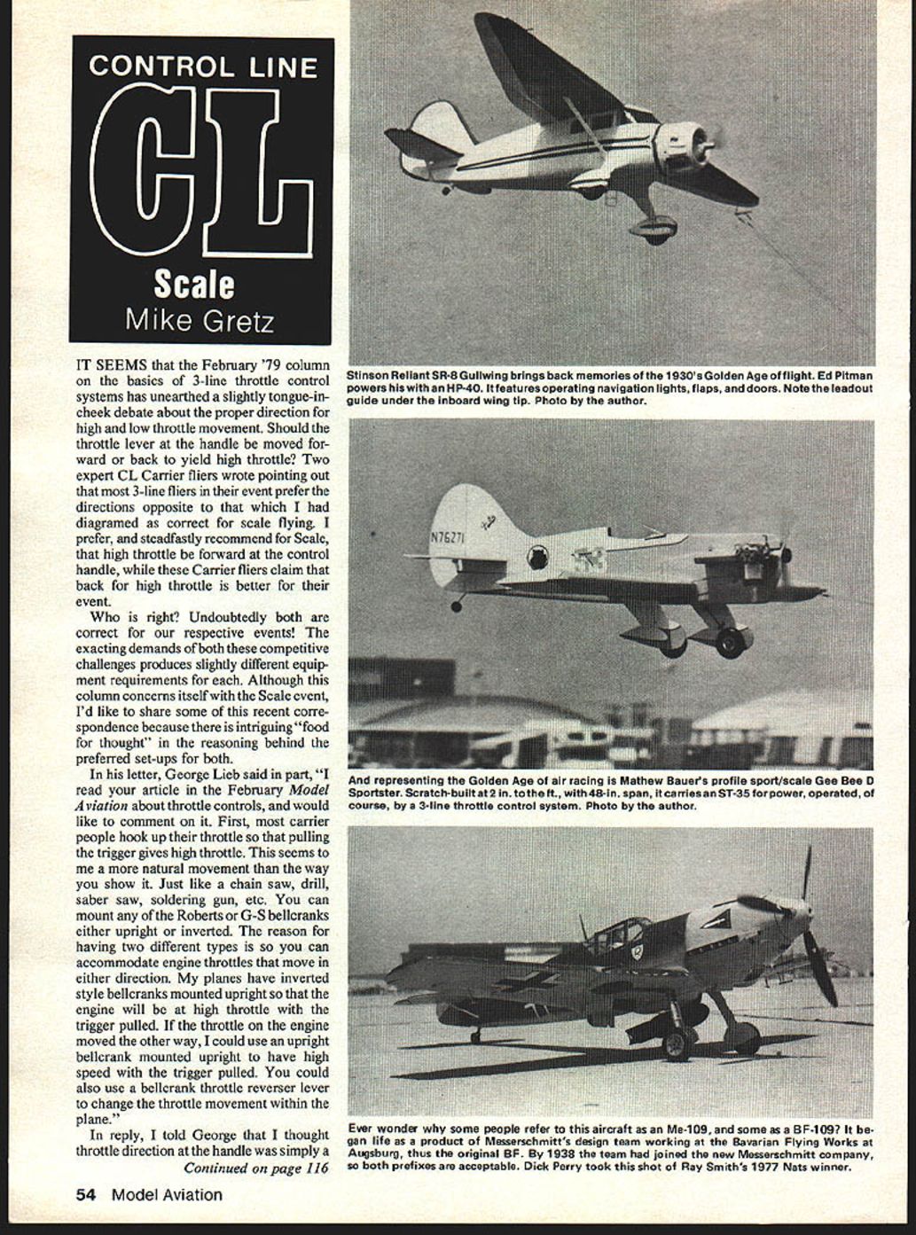 IT SEEMS February 79 column basics 3-line throttle control systems has unearthed slightly tongue-incheek debate about proper direction high low throttle movement Should throttle lever handle moved ward back yield high throttle Two expert CL Carrier fliers wrote pointing out 3-line fliers event prefer directions opposite diagramed correct scale flying prefer steadfastly recommend Scale high throttle forward control handle Carrier fliers claim back high throttle better event right Undoubtedly both correct respective events exacting demands both competitive challenges produces slightly different equip ment requirements Although column concerns itself Scale event Id like share some recent corre spondence because intriguingfood thought reasoning behind preferred set-ups both letter George Lieb said part read article February Model Aviation about throttle controls would like comment First carrier people hook up throttle pulling trigger gives high throttle seems natural movement way show Just like chain saw drill saber saw soldering gun etc can mount Roberts G-S bellcranks either upright inverted reason having two different types can accommodate engine throttles move either direction planes have inverted style bellcranks mounted upright engine will high throttle trigger pulled throttle engine moved other way could use upright bellcrank mounted upright have high speed trigger pulled could also use bellcrank throttle reverser lever change throttle movement within plane reply told George thought throttle direction handle simply Continued page 116 54 Model Aviation Stinson Reliant SR-B Guliwing brings back memories 1930s Golden Age flight Ed Pitman powers HP-40 Itfeatures operating navigation lights flaps doors Note leadout guide under Inboard wing tip Photo author representing ioIaen A90 0 air racing Matnew auers proriie sporriscaic uee ee U Sportster Scratch-bulltat2 totheft with48-in span itcarriesanST-35forpower operated course 3-line throttle control system Photo author Ever wonder some people refer aircraft Me-i 09 some BF-1 09 gan life product Messerschmitts design team working Bavarian Flying Works Augsburg thus original BF 1938 team joined new Masserschmitt company both prefixes acceptable Dick Perry took shot Ray Smiths 1977 Nats winner 0 LOWEST DRAIN WHY PAY big buy high performance *FIREBALL #H30 HOT 3 volts faster starts #S20 STANDARD 24 volts general use #C15 COOL 15 volts cures pre-ignition Just fun stick FIRE BALL great engine runs *advanced98 ............ FLASH STARTING 0 UNEXCELLED POWER LONGER LIFE cr11 1 GLOW PLUGS SWANSON ASSOCIATES P0 BOX 151WAYNE NEW JE35EY 07470 Brashers Rotation Station Are exotic planes worth effort next season two will determine way Combat design will go CL Scale/Gretz continued page 54 small point personal preference fact believe person could become just proficient either mode operation learn either just easily got some own specific reasons prefer ring fly Scale high throttle forward handle said part set up first 3-line system years ago became obvious mounted inverted bellcrank inverted seemingly intended almost engine high throttle position would forward control handles throttle lever same holds true mounting upright bellcrank upright throttle-equipped engines know require throttle pushrod move forward open car buretor except Fox engines often have lever both directions other words modeler uses stock equip ment mounts manufacturer intended mounted would almost cases get high throttle moving handles lever forward way noticed Scale fliers doing Nationals order make system work other way must reverse directions somewhere along line As said can incorporate straight reversing bellcrank arm between engine 3-line bellcrank can mount inverted style bellcrank upright upright style bellcrank inverted although know some control rod hookup problems can also simply loosen throttle arm engines rotate 180 degrees top side carb couldnt see possible advantage Scale flying doing things mentioned seemed natural pull back handles trigger get fast throttle seems natural fast throttle forward fullsize airplane automobile use left hand operate lever top handle thus always fly both hands Perhaps real heart personal preferences matter Im wondering other Carrier fliers normally fly hand using index finger operate trigger feel way can operate throttle precisely through stages scale flight competition Scale flying good share point-getting maneuvers done very near low throttlelike initial takeoff run landing touch-and-go taxi During maneuvers precise coordinated elevator throttle use important prefer trigger back what seem agree comfort able position day after mailed reply letter arrived MA sown Carrier expert respected friend Dick Perry very knowledgeably shed some light Carrier fliers prefer control set-up opposite what normal Scale Dick said looks like disagree little way appropriate direction open throttle 3-line system Its certainly no big thing Carrier requirements just little different Scale way forward openis way real air plane builders it works great two-handed flyingthe way Scale fliers Ive seen Carrier fliers little different generally one-handed few excep tions can fly bigger circle low speed hand use two hands high speed left hand support onlythe right index finger still handles throttle 5075 lbs pull pull-to-open throttle much easier keep open push-to-open rig one-hand operation low-speed throttle action also natural back pressure opens throttle up applied Also properly rigged up elevator condition against stop lines really loose will automatically open throttle bad situation total airplane pull about two pounds So have full story Two different methods two unique events As can see could go on meaningless debate about merits method lets just conclude devoted pilot can get satisfactory results either way know years RC has its Mode throttle right stick Mode II throttle left stick fliers tongue-in-cheek word-war about best Perhaps should divide up two-fisted lever pilots 