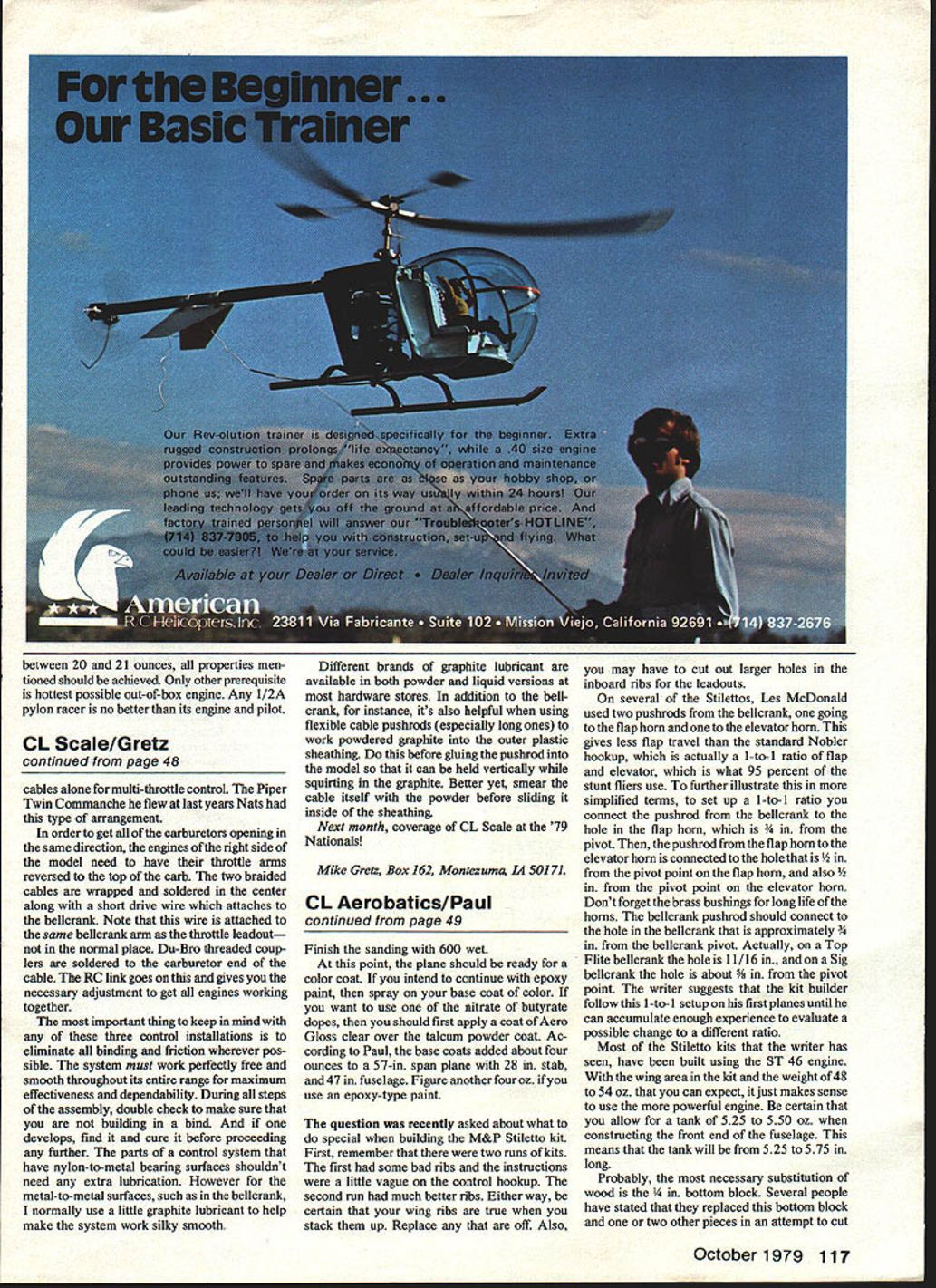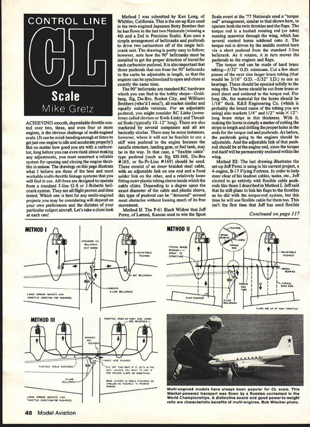 ACHIEVING smooth dependable throttle con trol over two three four engines obvious challenge multi-engined scale can mind-bending enough times get just engine idle accelerate properly no matter good carbure tor long before can think about making adjustments must construct reliable system opening closing engine throt ties unison drawings page illustrate what believe three best workable multi-throttle linkage systems will find use three designed operate standard 3-line G-S J-Roberts bellcrank system flight proven time tested Which best multi-engined projects may considering will depend own preferences dictates particular subject aircraft Lets take close look Method submitted Ken Long Whittier California set-up Ken used twin-engined Japanese Betty Bomber has flown last two Nationals winning 4th 2nd Precision Scale Ken uses simple arrangement bellcranks pushrods drive two carburetors off single bellcrank unit drawing pretty easy follow however note 900 bellcranks must installed get proper direction travel carburetor pushrod also important pushrods run 900 bellcranks carbs adjustable length engines can synchronized open close exactly same time 900 bellcranks standard RC hardware can find hobby shopsGold berg Sig Du-Bro Rocket City Williams Brothers whod miss market similar equally suitable versions adjustable pushrod might consider RC Links some times called devises Kwik-Links Thread ed Rods typically 1012 long also marketed several companies basically similar may some instances however will feasible use stiff wire pushrod engine because nacelle structure landing gear fuel tank may way case flexible cable type pushrod such Sig SH-560 Du-Bro *165 Su-Pr-Line *169 should used consist inner braided steel cable adjustable link end fixed solder link other relatively loose fitting outer plastic tubing sleeve inside cable slides Depending degree upon exact diameter cable plastic sleeve type pushrod can detoured around obstacles loosing much its free movement Method II P-61 Black Widow Jeff Perez Lamed Kansas used win Sport Scale event 77 Nationals used torque rod arrangement similar shown operate both twin throttles flaps torque rod bushed rotating rod tube running spanwise through wing has several control horns soldered onto torque rod driven middle control horn via short pushrod standard 3-line bellcrank As rotates turn moves pushrods engines flaps torque rod can made hard brass tubing5/32 OD minimum Cut few short pieces next size larger brass tubing would 3/16 OD 5/32 ID use bearings should epoxied solidly wing ribs horns should cut brass steel sheet soldered torque rod long life material horns should 1/16 thick K&S Engineering Co probably brand name tubing using also markets 1/4 1/2 wide X 12long brass strips thickness making horns simply matter cutting strips length drilling proper holes ends torque rod pushrods As before pushrods going engines should adjustable adjustable link pushrod should engine end since torque rod itself will permanently enclosed within wing Method III last drawing illustrates set-up Jeff Perez using current project 4-engine B-I 7 Flying Fortress order help steer clear leadout cables tanks etc Jeff elected go entirely flexible cable pushrods like described Method Jeff said still plans link flaps throttles did torque-rod system time will use flexible cable too isnt first time Jeff has used flexible Continued page 117 METHOD t LARGE ARROWS INBICATE 11108 TOROTTLE DIRECTION FOR PASOROOG METHOD III FLEGIGLE CABLE PUSUROOS 3LINE BELLCRANX LARGE ARROWS INOICATE 01011 THROTTLE OIRECTIVNB FOR P0000000 STANOARO CL BELLE RANK 0 SOWN S 27K AND vi AG JA S TA RLE PASO ROB 400 BELLERANO JROBEBTG 3-LINE BELLERANE THROTTLE ARMS ON 010110 SHOE CARDS BUSIC WIRE P000000 CUT OFF THIS PART IF 0 GETS IN TUE WAY UNLESS yOU WANT TO USE IT FOB DRIVING FLAPS OR SOMETRING MAKE CURVES IN CABLE PUSORODS AS SRALLGW AG POSSIBLE TV MINIMIZE IN DING METHOD II TYPICAL BRASS BEARING EPOBO TO OTRAC TAR K -r FLAP P000000 48 Model Aviation BRASS BEAR NA HORN OROGE ROB / A OJ S TA BL E PA SB ROD BRASS BEARING BE TAR 0 TI OpTYPICAL WING RIBS BEL LCR N K FLAPS ARE AP AT 111011 TOBOTTLE Multi-engined models have always popular CL scale Wankel-powered transport flown Russian contestant World Championships distinctive sound good power-to-weight ratio characteristic benefits multi-engines Bob Wischer photo between 20 21 ounces properties men- Different brands graphite lubricant tioned should achieved Only other prerequisite available both powder liquid versions hottest possible out-of-box engine Any l/2A hardware stores addition bellpylon racer no better its engine pilot crank instance its also helpful using flexible cable pushrods especially long ones work powdered graphite outer plastic sheathing before gluing pushrod ____________________________________ model can held vertically squirting graphite Better yet smear cable itself powder before sliding inside sheathing Next month coverage CL Scale 79 Nationals cables alone multi-throttle control Piper Twin Comnianche flew last years Nats type arrangement order get carburetors opening same direction engines right side model need have throttle arms reversed top carb two braided cables wrapped soldered center along short drive wire attaches bellcrank Note wire attached same bellcrank arm throttle leadout normal place Du-Bro threaded coup lers soldered carburetor end cable RC link goes gives necessary adjustment get engines working together important thing keep mind three control installations eliminate binding friction wherever pos sible system must work perfectly free smooth throughout its entire range maximum effectiveness dependability During steps assembly double check make sure building bind develops find cure before proceeding further parts control system have nylon-to-metal bearing surfaces shouldnt need extra lubrication However metal-to-metal surfaces such bellcrank normally use little graphite lubricant help make system work silky smooth Mike Gre*z Box 162 Monte