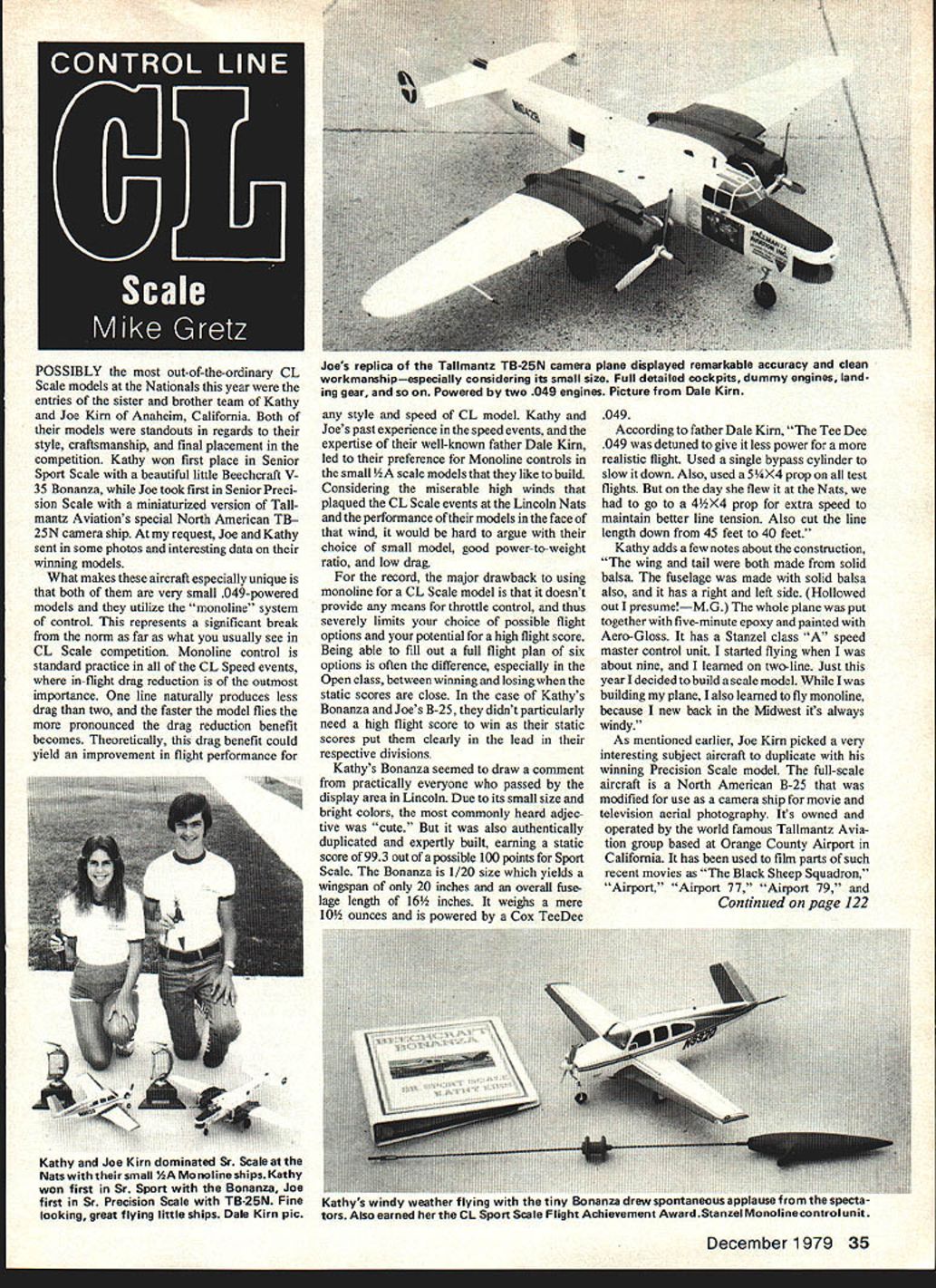 POSSIBLY out-of-the-ordinary CL Scale models Nationals year entries sister brother team Kathy Joe Kim Anaheim California Both models standouts regards style craftsmanship final placement competition Kathy won first place Senior Sport Scale beautiful little Beechcraft V 35 Bonanza Joe took first Senior Preci sion Scale miniaturized version Tall mantz Aviations special North American TB 25N camera ship request Joe Kathy sent some photos interesting data winning models What makes aircraft especially unique both very small 049-powered models utilize monoline system control represents significant break norm far what usually see CL Scale competition Monoline control standard practice CL Speed events in-flight drag reduction outmost importance line naturally produces less drag two faster model flies pronounced drag reduction benefit becomes Theoretically drag benefit could yield improvement flight performance Joes replica Tallmantz TB-25N camera plane displayed remarkable accuracy clean workmanshipespecially considering its small size Full detailed cockpits dummy engines land ing gear Powered two 049 engines Picture Dale Kim style speed CL model Kathy Joes past experience speed events expertise well-known father Dale Kim led preference Monoline controls small scale models like build Considering miserable high winds plaqued CL Scale events Lincoin Nats performance models face wind would hard argue choice small model good power-to-weight ratio low drag record major drawback using monoline CL Scale model doesnt provide means throttle control thus severely limits choice possible flight options potential high flight score Being able fill Out full flight plan six options often difference especially Open class between winning losing static scores close case Kathys Bonanza Joes B-25 didnt particularly need high flight score win static scores put clearly lead respective divisions Kathys Bonanza seemed draw comment practically everyone passed display area Lincoln Due its small size bright colors commonly heard adjec tive cute also authentically duplicated expertly built earning static score 993 out possible 100 points Sport Scale Bonanza 1/20 size yields wingspan 20 inches overall fuse lage length 16 inches weighs mere 10 ounces powered Cox TeeDee 049 According father Dale Kim Tee Dee 049 detuned give less power realistic flight Used single bypass cylinder slow down Also used 5X4 prop test flights day flew Nats go 4X4 prop extra speed maintain better line tension Also cut line length down 45 feet 40 feet Kathy adds few notes about construction wing tail both made solid balsa fuselage made solid balsa also has right left side Hollowed out presumeMG whole plane put together five-minute epoxy painted Aero-Gloss has Stanzel class speed master control unit started flying about nine learned two-line Just year decided build scale model building plane also learned fly monoline because new back Midwest its always windy As mentioned earlier Joe Kim picked very interesting subject aircraft duplicate winning Precision Scale model full-scale aircraft North American B-25 modified use camera ship movie television aerial photography Its owned operated world famous Tallmantz Avia tion group based Orange County Airport California has used film parts such recent movies Black Sheep Squadron Airport Airport 77 Airport 79 Continued page 122 December 1979 35 Kathy Joe Kim dominated Sr Scale Nats small AA Monol ships Kathy won first Sr Sport Bonanza Joe first Sr Precision Scale TB-25N Fine Kathys windy weather tlying tiny nanza arew spontaneous looking great flying little ships Dale Kim pic tors Also earned CL Sport Scale Flight Achievement Award Stanzei Ivlonollnecansrol unit planform alignment Install large nylon control horn Kwik Link wire pushrod guide omit pushrod guide because aerodynamic force stab during outside maneuvers will cause pushrod bowing less effective control outside maneuvers Slow Combat version uses same wing has standard balsa fuselage standard type nose Two pushrod guides required along long fuselage plane should balance motor prop installed 185% chord 1 -in rear leading edge bladder tube placed exactly along line prevent change center gravity fuel runs out center gravity second hole top control horn good starting point Fast Combat version should weigh 8 9 oz engine FAT version 8 8 oz Select slightly lighter wood FAT version Power Fast Slow Rongeurs MK III Fox Combat Special 25% nitro head clearance set 019 Power FAT version favorite high perforniance 151 like Fox 15 Take test flight check warps thrust misalignment usually minimal care taken during construction Rongeur will provide durable cheap easy build easy repair combat plane stable enough fly eyes-off yet tight turning enough competition hundreds others too numerous mention Joes impressive model faithfully duplicates unique features kind aircraft scored 258 static points tops Senior class Past wins include five first places second including first Junior Preci sion Scale 75 77 Nats B-25 scratch-built ves wingspan 25 5/16 inches overall length 21 inches According Joe model weighs pound half two mufflerized Cox 049 Space Hoppers flies 45 feet line flies either engine controlled Stanzel Stunt Master Monoline control unit entire model made balsa solid wings tail rudders hollowed-out fuselage used Aero-Gloss finish entire plane blue-tone white blue nacelle areas Dale adds interesting story relating Joes B-25 5X4 3-bladed props necessary extend flying time miscalculated tank sizes would fly about eight laps 50X016 line 5X3 props So slowed engine down 4-in pitch cut flying line down 45 feet runs about 12 14 laps both engines configuration Inclosing Im thrilled able feature up-close look two young competitors outstanding models because believe characteristic CL Scale modelings greatest strengths continued partici pation Junior Senior age modelers CL Scale degree seen other mode Scale flying Nationals have attended Junior Senior age contestants accounted betw