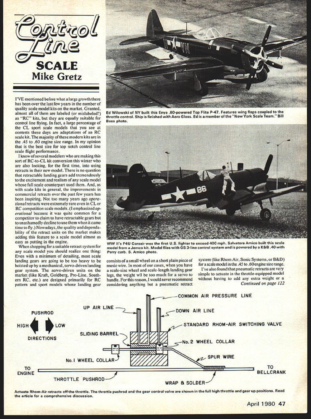 B SCALE Mike Gretz IVE mentioned before what large growth has over last few years number quality scale model kits market Granted almost labeled mislabeled RC kits equally suitable control line flying fact large percentage CL sport scale models see contests days adaptations RC scale kit majority modern kits 45 60 engine size range opinion best size top notch control line scale flight performance know several modelers making sort RC-to-CL kit conversion winter also looking first time using retracts new model no question retractable landing gears add tremendously excitement realism scale model full scale counterpart used scale kits general improvements commercial retracts over past few years has inspiring too years ago opera tionalretracts extremely rare CL RC competition scale models emphasized op erational because quite common competitor claim have retractable gears unashamedly decline use came time fly Nowadays quality dependa bility retract units market makes adding feature scale model almost easy putting engine shopping suitable retract system scale model should realize thing minimum detailing scale landing gears going too heavy hoisted up mechanical servo-driven landing gear system servo-driven units market like Kraft Goldberg Pro-Line South ern RC etc designed primarily RC pattern sport models landing gear PUSH ROD HIGH DIRECTIONS consists small wheel short plain piece music wire cases have scale-size wheel scale-length landing gear legs weight wll too much servo handle reason would never recommend considering anything pneumatic retract UP AIR LINE SLIDING BARREL/ No1 WHEEL COLLAi TO ENGINE system like Rhom Air Sonic Systems B&D scale model 45 60 engine size range Ive also found pneumatic retracts very simple actuate throttle-equipped model having add extra weight Continued page 122 ~----COMMON AIR PRESSURE LINE DOWN AIR LINE STANDARD RHOM-AIR INo2 WHEEL COLLAR SPUR WIRE SWITCHING VALVE TO BELLC RANK THROTTLE PUSHROD~~2 WRAP B SOLDER Actuate Rhom-Air retracts off throttle throttle pushrod gear control valve shown full high throttle gear up positions Read article comprehensive discussion April 1 980 47 Ed Wilowski NY built Enya 60-powered Top Flite P47 Features wing flaps coupled throttle control Ship finished Aero Gloss Ed member New York Scale Team Bill Boss photoI WW IIs F4U Corsair first US fighter exceed 400 mph Salvatore Amico built scale model Jemco kit Model flies GS 3-line control system powered K&B 40 Perry carb S Amico photo EU 330EU WV PROPS FOR BIGGIES Now can experience full thrust potential chain saw engine prop-drive new durable efficient glass-filled nylon pY NATNrati props Platt Seen QSAA Fun Flys Louisville Las Vegas Look us up WRAMS TOLEDO Direct Factory Introductory Prices New items biggies coming DYNAHUB easist safest way start big engines DYNATI-IRUST Prop Balancer Accurate Easy-to-use & inespensive Add 50 PER PROP shipping USA pay shipping charges orders 6 s Send CHECK MO VISA MC COD mounts place Cut holes bladder tube fuelproof its interior pouring about two ounces thinned white glue sloshing around pouring out excess Fuel-proof motor mount slow-curing epoxy glue last step before engine mounting check warps also im portant steps position full soft drink can four corners wing flat surface Put straight pins tip leading edge trailing edge four pins rest cans wing straight now time mount engine go flying yours fly good hope dont meet contest CL Scale/Gretz Continued page 47 fourth control line first Zlin Akrobat used standard G-S 3-line bellcrank system throttle control An inverted style bellcrank mounted fuselage solid music wire pushrod going Fox Eagle carburetor Rhom Air retract system am familiar IN STOCK NOW 186 188 208 2010 $700 700 900 900 COMING EARLY 1980 156$500 16550 166500 Dynathrust Props Inc 2541 NE 11th Court Pompano Beach FL 33062 Raymond Colelli 305 941 9119 having used since 1973 has 4-way switching valve actuate up down movements landing gears presume other pneumatic systems have similar valve valve basically junction box systems up down pressure air hoses valve has grooved sliding barrel inside routes pressurized air appropriate up down hose end barrels travel RC applications standard servo drives inner barrel end valve other Zlin use throttle pushrod same job As can see accompanying drawing spur wire wrapped soldered throttle pushrod spur wire two wheel collars small enough slide valve push barrel valve body itself securely fastened fuselage structure throttle pushrod moves forward open carburetor number 2 collar pushes barrel front valve thus connecting up air hose pressure hose bringing landing gear up Conversely throttle pushrod closes carb number 1 collar pushes barrel rear valve completes down circuit lowers landing gear use wheel collars spur wire makes exact timing retraction ex tension gears adjustable within power range engine number 2 collar adjusted gears came up absolute full high throttle Obviously makes necessary take offwith just slightly less full power avoid prematurely retracting gear ground doesnt present problem model adequately powered number 1 collar adjusted gear came down throttled back about /s-/z power setting Im sure sort actuating arrangement would work equally well model size wing loading range Zlin years flew particular model including two Nationals never reason wish could operate retracts independently throttle fact might consider using extra pneumatic air cylinder operate flaps tailhook etc conjunction retracts throttle could simply plug extra cylinder retract system same way done retractable tailwheel nose gear Mike Gretz Box 162 Montezuma IA 501 71 CL Aerobatics/Paul Con finued page 48 ears Lastly Bob said engine offset called plans might try some shims under front engine see helps line tension might also have move leadouts back forward change amount line tension Most profile kits built leadouts position Bob may have move around see helps summary good order trouble shooting case would 1 wing alignment includin