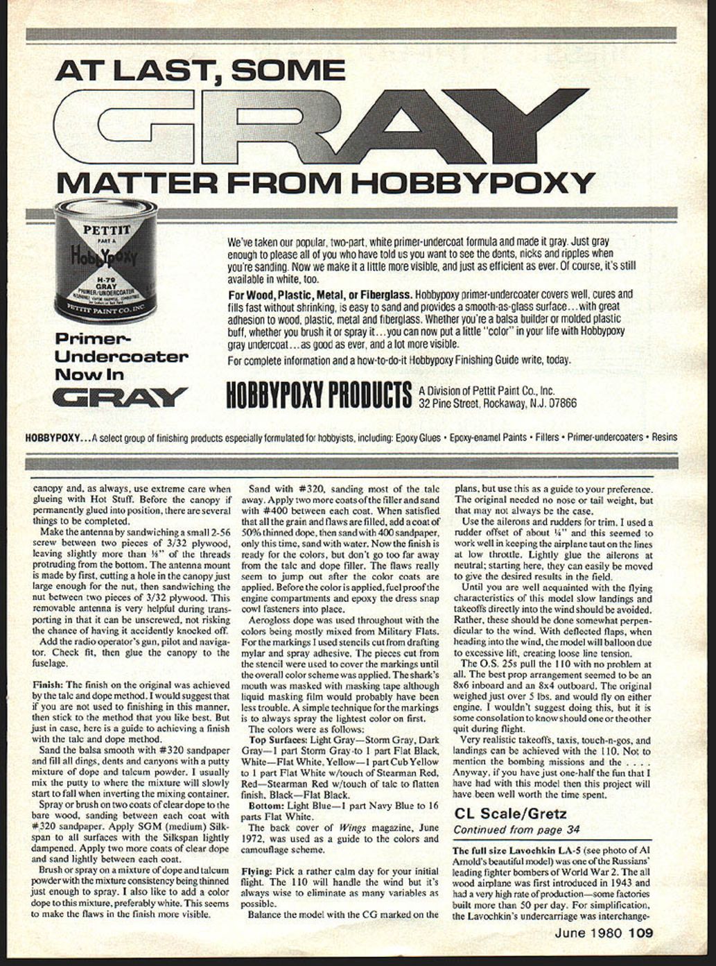 C SCALE Mike Gretz IN case havent heard 1980 CL Scale World Championships have heen cancelled deadline contest organizers set final entry commitment interested coun tries recently passed getting sufficient number signed up CL Scale As mentioned March 80 column five coun tries needed stage World Championships time wrote column Dec 79 four countries firmly committed felt fairly confident nation would sign up time didnt work out way Perhaps intense political situations have developed around world since including talk Olympic boycott may have something reluctance new countries sign up Its hard say second time row WC CL Scale event cancelled due political problems apparent lack interest enough FAI participating countries first time 1978 has wonder now what kind mammoth effort might take some future years get CL Scale back WC schedule Just look uphill battle FF Scale enthusiasts country having trying get event World Champion ship status sincerest hope second cancellation will lead similar struggle CL Scale competitors United States have expressed hope someday participating Scale World Championships Al Arnold modeler New Orleans flies unique style CL Scale model might recall have pictured some models before column photo Als Gotha bomber August 79 ModelAviation Albatros D-IIa shown January 80 issue models reflect strong FF Scale influence both size construction style Most small 28 42 wingspan recently sent photos other interesting CL Scale aircraft way Al president Louisiana Scale Squadron club includes FF CL RC scale modelers lumped group has scale common denominator part Al Arnolds letter cut teeth kid rubber FF scale several years thats built first got CL construction techniques knew keep light simple Now find CL models really beefed up FFjobs glow engine control lines Because light over powered model seems fly better heavy underpowered have shown up contests competitive models other guys cant understand Albatros good example 28 wingspan biplane drag flies well 049 Gotha GIV excellent example philosophy applied large model Im telling because people seem think ukie scale ship has heavy good dont Ive mentioned occasions like build CL Scale models larger 40 70 inch wingspan range Now wouldnt want anyone assume therefore disagree Al Arnolds style building came conclusion youve probably missed main point Als own reasoning fact total agreement what makes CL Scale model fly really well build light overpowered Al keeps wing loading down ultra-light construction whereas prefer larger model Someday Im going build small ultra-light ukie scale like Als give arm rest looks like fun Continued page 109 34 Model Aviation Didnt know WW2 DeHavilland Mosquito bombers needle valves Rolls-Royce engines Bill Boss New Hyde Park NY built Precision Scale model took pictures too Mosquito Britains version all-wood fighter-bomber although markings 654th Bomber Squadron USAAF July 1944 models wingspan 62 weighs just under 14 lbs Power two Webra 40s Check out expert landing gear detailing Model features operating flaps bomb bay doors droppable bombs fuel tanks years Nationals competition should see well other magnificent CL scale models flight line Al Arnold uses small engines models uses light built-up Another Al Arnold rendition Soviet airplane Ko construction keep flyable rendition WW2 rean War Red Chinese Mig 15 locally built experimental ductad Russian Lavochkin LA-S fighter-bomber 33 wingspan model fan propels model craft weighs 1/2 lbs has 28 inwingspan has features theoriginalsplit flapsoperational leading edge powered 15 engine Finished Silkspan dope Landry slats bomb drop Photo Frank Landry pic AT LAST SOME PrimerU ndercoater Nowin Weve taken popular two-part white primer-undercoat formula made gray Just gray enough please have told us want see dents nicks ripples re sanding Now make little visible just efficient ever course its still available white too Wood Plastic Metal Fiberglass Hobbypoxy primer-undercoater covers well cures fills fast shrinking easy sand provides smooth-as-glass surface. great adhesion wood plastic metal fiberglass Whether youre balsa builder molded plastic buff whether brush spray it. can now put little color life Hobbypoxy gray undercoat. good ever lot visible complete information how-to-do-it Hobbypoxy Finishing Guide write today AflflhIflAVUA Division Pettit Paint Co Inc H unniruAt PRODUCTS 32 Pine Street Rockaway NJ 07866 HOBBYPOXY ct group finishing products especially formulated hobbyists including Epoxy Glues Epoxy-enamel Paints Fillers Primer-undercoaters Resins canopy always use extreme care glueing Hot Stuff Before canopy permanently glued position several things completed Make antenna sandwiching small 2-56 screw between two pieces 3/32 plywood leaving slightly ads protruding bottom antenna mount made first cutting hole canopy just large enough nut sandwiching nut between two pieces 3/32 plywood removable antenna very helpful during trans porting can unscrewed risking chance having accidently knocked off Add radio operators gun pilot naviga tor Check fit glue canopy fuselage Finish The finish original achieved talc dope method would suggest used finishing manner stick method like best just case guide achieving finish talc dope method Sand balsa smooth #320 sandpaper fill dings dents canyons putty mixture dope talcum powder usually mix putty mixture will slowly start fall inverting mixing container Spray brush two coats clear dope bare wood sanding between coat #320 sandpaper Apply SGM medium Silkspan surfaces Silkspan lightly dampened Apply two coats clear dope sand lightly between coat Brush spray mixture dope talcum powder mixture consistency being thinned just enough spray also like add color dope mixture preferably white seems make flaws finish visible Sand #320 sanding talc away Apply two coats filler sand #400 between coat satisfied grain flaws filled add coat 50% thinned dope sand 400 sandpaper time sand water Now finish ready colors dont go too far away talc dope filler