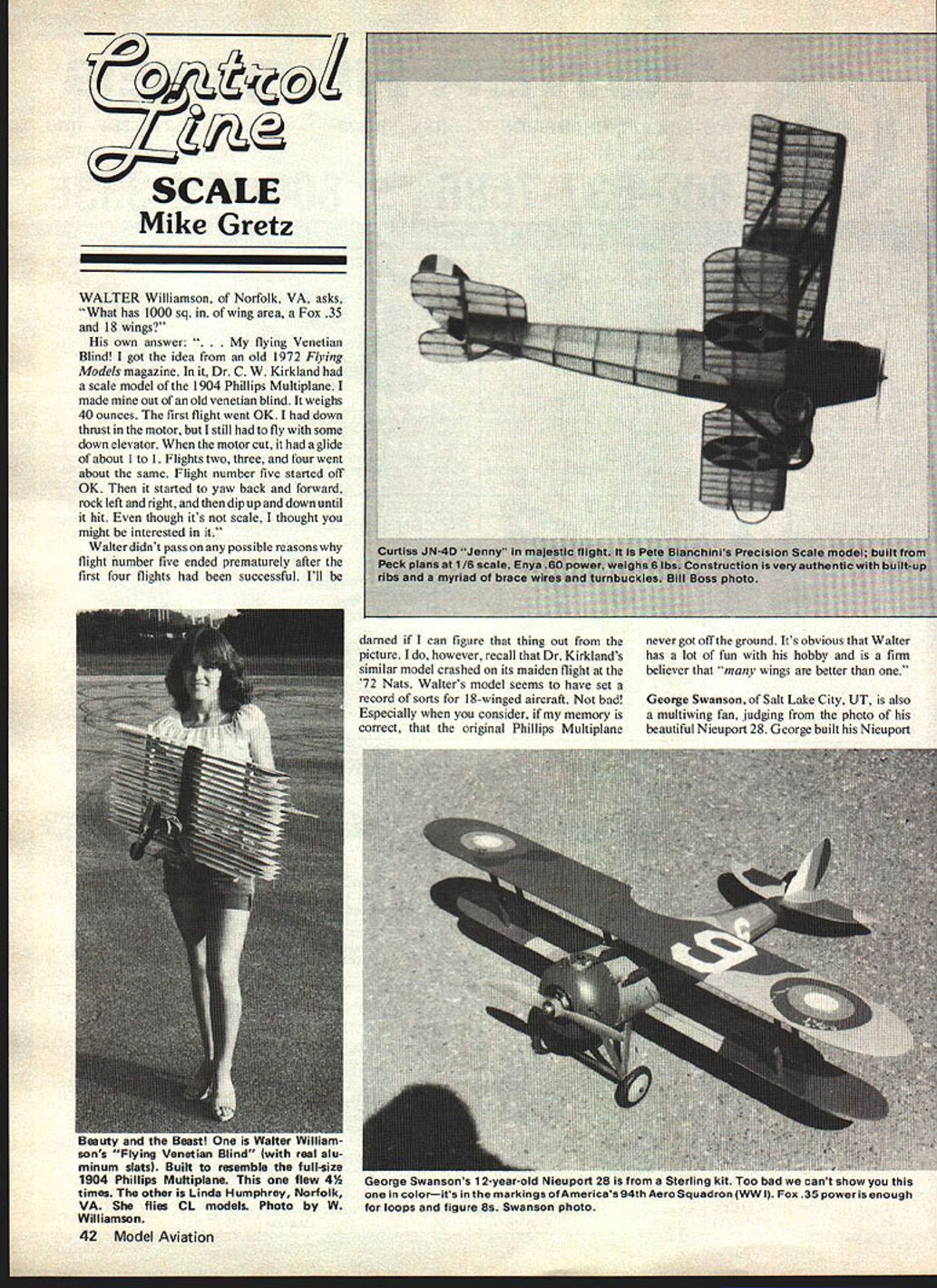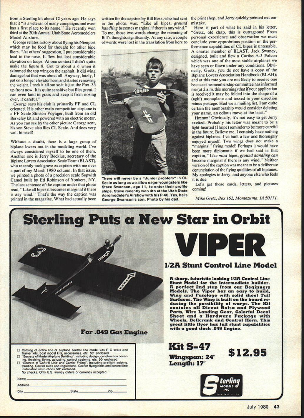 C SCALE Mike Gretz WALTER Williamson Norfolk VA asks What has 1000 sq wing area Fox 35 18 wings own answer ying Venetian Blind got idea old 1972 Flying Models magazine Dr C W Kirkland scale model 1904 Phillips Multiplane made out old venetian blind weighs 40 ounces first flight went OK down thrust motor still fly some down elevator motor cut glide about 1 1 Flights two three four went about same Flight number five started off OK started yaw back forward rock left right dip up down until hit though its scale thought might interested Walter didnt pass possible reasons flight number five ended prematurely after first four flights successful Ill darned can figure thing Out picture however recall Dr Kirklands similar model crashed its maiden flight 72 Nats Walters model seems have set record sorts 18-winged aircraft bad Especially consider memory correct original Phillips Multiplane never got off ground Its obvious Walter has lot fun hobby firm believer wings better George Swanson Salt Lake City UT also multiwing fan judging photo beautiful Nieuport 28 George built Nieuport Beauty Beastl sons Flying Venetian Blind real alu minum slats Built resemble full-size 1904 Phillips Multiplane flew 4 times other Linda Humphrey Norfolk VA flies CL models Photo W Williamson 42 Model Aviation George Swansons 12-year-old Nieuport 28 Sterling kit Too bad cant show colorits markings Americas 94th Aero Squadron WW Fox 35 poweris enough loops figure Ba Swanson photo Sterling kit about 12 years ago says veteran campaigns has first place its name recently won third 20th Annual Utah State Aeromodelers Model Airshow George relates story about flying Nieuport may food thought other bipe fliers others suggestion put considerable lead nose flew lost considerable elevation loops contest didnt quite make figure 8 Got about 6 skimmed top wing asphalt did wing damage about Anyway lately put longer elevator horn started removing weight took out just Fox 35 up front now quite sensitive flies great can land grass keep nosing over careful George says club primarily FF CL oriented other main competition airplane FF Scale Stinson Voyager built old Berkeley kit powered electric motor As can see other picture George sent son Steve also flies CL Scale does very well himselfl Without doubt large group biplane lovers out modeling world Ive always considered myself Another Jerry Bockius secretary Biplane Lovers Association Scale Team BLAST recently took grave exception over part March 1980 column issue printed photo precision scale Sopwith Camel built Ed Robinson Yonkers NY last sentence caption under photo read Like bipes becomes marginal wind Thats way caption printed magazine What actually written caption Bill Boss sent photo Like bipes ground handling becomes marginal wind two words change meaning Bills thoughts significantly rate couple words lost translation print shop Jerry quickly pointed out mistake part what said letter Gretz old chap outrageous personal experience observation must conclude opprobrious position per formance capabilities CL bipes untenable charter member BLAST Jack Swaney designed built flew Curtiss A-3 Falcon stable airplanes have seen flown under conditions Obvi ously Gretz have copy Biplane Lovers Association Handbook BLAH rate likely receive because membership committee has informed 2 am moming ifyour application received may folded shape ugh monoplane tossed direction minus postage mailing list am quite certain membership would consider deleting name odious move least Hmmm Obviously its easy get Jerry excited Probably letter meant light-hearted hope reminder careful future Believe certainly have nothing against biplanes Ive built few thoroughly enjoyed myself Two wings does make marginal flying model Perhaps would have diplomatic said caption Like bipes ground handling can become marginal wind Neither version caption meant deliberate denunciation flying qualities biplanes apologies Jerry anyone else feels due Lets get cards letters pictures coming Mike Gretz Box 162 Montezuma IA 50171 E Catalog entire line ot airplane control line model kita 8 C scale Trainer kits boat model kits accessories etc 50 enclosed L Secrets Model Airplane Building Including design construction cover ing finishing Ilying adjusting control systems etc 50 enclosed fl Secrets Control Line Carrier Flying Including pretlight soloing stunting Carrier rules regulations Carrier Ilying hints control line installation instructions 50 enclosed No checks Only us money orders currency accepted Name City Star Orbit VIPER l/2A Stunt Control Line Model sharp futuristic looking l/2A Control Line Stunt Model intermediate builder perfect 2nd step Beginners Models Viper has easy build Wing Fuselage solid sheet Tail Surfaces Wing built board re ducing possibility warps Kit contains Diecut Balsa Plywood Parts Wire Landing Gear Colorful Decal Sheet Hardware Package Wheels Bellcrank Control Horn great little flyer has full stunt capabilities good stock 049 Engine Kit S-47 Wingspan24 $1295 Length 17 July 1980 43 will never Junior problem CL Scale long allow eageryoungsters like Steve Swanson age 11 enter profile ships Steve recently won 4th Utah State Aeromodelers Airshow P-40 Yes George Swansons son Photo dad
