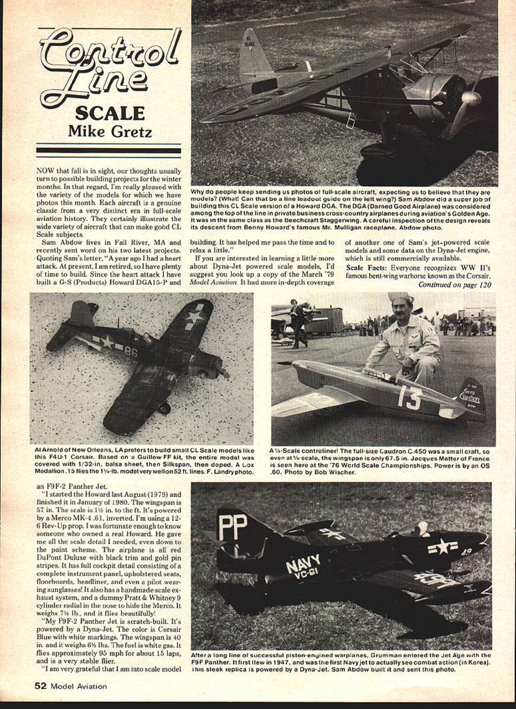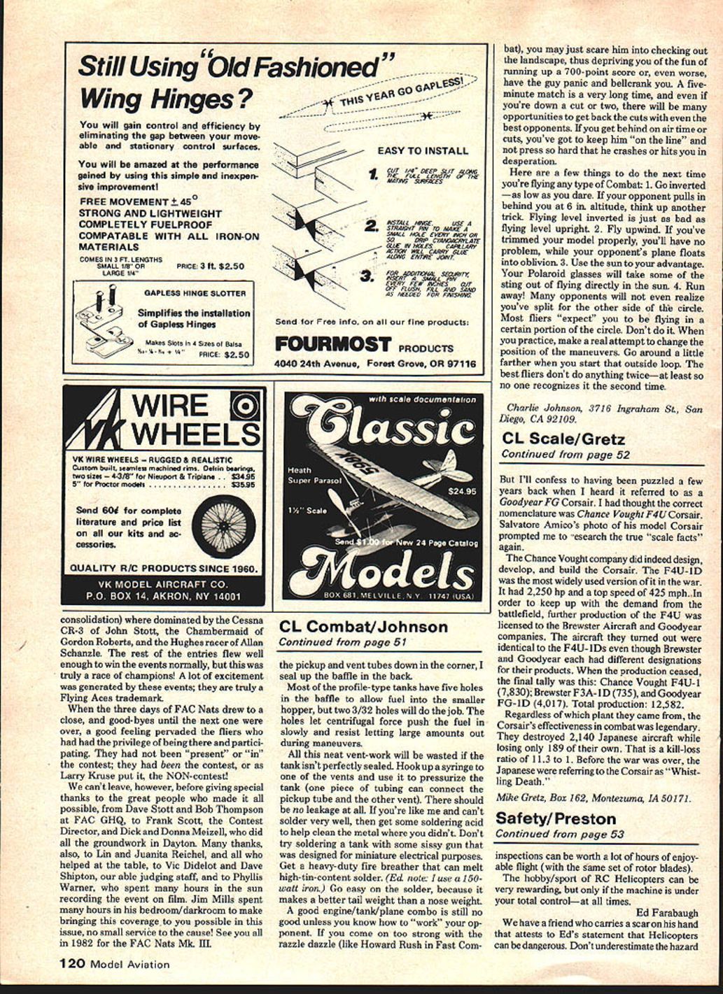 C SCALE Mike Gretz NOW fall sight thoughts usually turn possible building projects winter months regard Im really pleased variety models have photos month aircraft genuine classic very distinct era full-scale aviation history certainly illustrate wide variety aircraft can make gobd CL Scale subjects Sam Abdow lives Fall River MA recently sent word two latest projects Quoting Sams letter year ago heart attack present am retired sol have plenty time build Since heart attack have built G-S Products Howard DGA15-P building has helped pass time relax little interested learning little about Dyna-Jet powered scale models Id suggest look up copy March 79 Model Aviotion in-depth coverage another Sams jet-powered scale models some data Dyna-Jet engine still commercially available Scale Facts Everyone recognizes WW IIs famous bent-wing warhorse known Corsair Continued page 120 F9F-2 Panther Jet started Howard last August 1979 finished January 1980 wingspan 57 scale 1 ft Its powered Merco MK-4 61 inverted Im using 126 Rev-Up prop fortunate enough know someone owned real Howard gave scale detail needed down paint scheme airplane red DuPont Duluxe black trim gold pin stripes has full cockpit detail consisting complete instrument panel upholstered seats floorboards headliner pilot wear ing sunglasses also has handmade scale ex haust system dummy Pratt & Whitney 9 cylinder radial nose hide Merco weighs 7 lb flies beautifully F9F-2 Panther Jet scratch-built s powered Dyna-Jet color Corsair Blue white markings wingspan 40 weighs 6 lbs fuel white gas flies approximately 95 mph about 15 laps very stable flier am very grateful am scale model 52 Model Aviation people keep sending us photos full-scale aircraft expecting us believe models What Can line leadout guide Left wing Sam Abdow did super job building CL Scale version Howard DGA DGA Darned Good Airplane considered among top line private business cross-countryairplanes during aviations Golden Age same class Beechcraft Staggerwing careful inspection design reveals its descent Benny Howards famous Mr Mulligan raceplane Abdow photo Al EdW UIb LU UUIIU blildil ULOCdI0 muueis ike thiv i Corsair Based Guillow FF kit entire model coveu 1/32-in balsa sheet Silkspan doped Lox Medallion 15 flies 1 /4-lb model very well on52 ft lines F Landry photo 4 /4-ocale controliner ne ruil-size uauaron L small at/4-scale wingspan 675 Jacques Matter France seen 76 World Scale Championships Power OS 60 Photo Bob Wischer After long line successful piston-engined warplanes Grumman entered Jet Age F9F Panther first flew 1 g47 first Navy jetto actually see combat action Korea sleek replica powered Dyna-Jet Sam Abdow built sent photo Still Using bid Fashioned Wing Hinges will gain control efficiency eliminating gap between moveable stationary control surfaces will amazed performance gained using simple inexpen sive improvement FREE MOVEMENT450 STRONG AND LIGHTWEIGHT COMPLETELY FUELPROOF COMPATABLE WITH ALL IRON-ON MATERIALS COMES IN 3 PT LENGTHS SMALL 1/8 OR LARGE 114 PRICE 3 ft $250 WIRE LS VK WIRE WHEELS ED & REALISTIC Custom built seamless machined rims Delrin beerings two sizes 8 Nieuport & Triplane 95 5 Proctor models63595 Send 50d complete literature price list kits ac cessories QUALITY R/C PRODUCTS SINCE 1960 em 0 0 ZS B33 consolidation dominated Cessna CR-3 John Stott Chambermaid Gordon Roberts Hughes racer Allan Schanzle rest entries flew well enough win events normally truly race champions lot excitement generated events truly Flying Aces trademark three days FAC Nats drew close good-byes until next over good feeling pervaded fliers had privilege being partici pating present contest contest Larry Kruse put NON-contest cant leave however before giving special thanks great people made possible Dave Stott Bob Thompson FAC GHQ Frank Scott Contest Director Dick Donna Meizell did groundwork Dayton thanks also Lin Juanita Reichel helped table Vic Didelot Dave Shipton able judging staff Phyllis Warner spent hours sun recording event film Jim Mills spent hours bedroom/darkroom make bringing coverageto possible issue no small service cause See 1982 FAC Nats Mk 111 AFLGOG EASY TO INSTALL CUT 1/4 DEEP SLIT ALONG 5 TNG FLILL LEA/Gre UE TAS MATING 6YRFACES ASt4LL Hat/GE USE SONAIGHT HIM 10 MAKE S444LL hOLE EVERY At/CC OR SODRIP CYAAONGqI-LAYE NiLE 45/ hOLESCAPILAKY ACOLW VRLL CARRY GLUE A/ORG PA/TIME JORT EVERY FEW RiCHES 017 OFF FLUSH FILL ANG SANG AS ArEOPO FOR FINISHING Send Free info fine products FOURMOST PRODUCTS 4040 24th Avenue Forest Grove OR 97116 pickup vent tubes down corner seal up baffle back Most profile-type tanks have five holes baffle allow fuel smaller hopper two 3/32 holes will job holes let centrifugal force push fuel slowly resist letting large amounts out during maneuvers neat vent-work will wasted tank isnt perfectly sealed Hookup syringe vents use pressurize tank piece tubing can connect pickup tube other vent should no leakage youre like cant solder very well get some soldering acid help clean metal didnt Dont try soldering tank some sissy gun designed miniature electrical purposes Get heavy-duty fire breather can melt high-tin-content solder Ed note use 150watt iron Go easy solder because makes better tail weight nose weight good engine/tank/plane combo still no good unless know work op ponent come too strong razzle dazzle like Howard Rush Fast Cornbat may just scare him checking out landscape thus depriving fun running up 700-point score worse have guy panic bellcrank fiveminute match very long time youre down cut two will opportunities get back cuts best opponents get behind air time cuts youve got keep him line press hard crashes hits desperation few things next time youre flying type Combat 1 Go inverted low dare opponent pulls behind 6 altitude think up another trick Flying level inverted just bad flying level upright 2 Fly upwind youve trimmed model properly youll have no problem opponents plane floats oblivion 3 Use sun advantage Polaroid glasses will ta