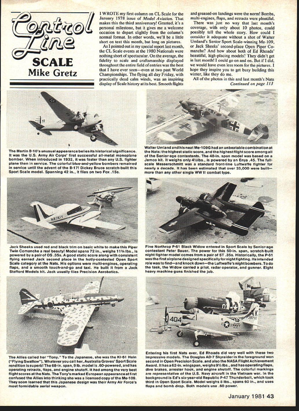 I WROTE first column CL Scale January 1978 issue Model Aviation makes third anniversary Granted its personal milestone gives welcome occasion depart slightly column s normal format other words well little short text month long pictures As pointed out special report last month CL Scale events 1980 Nationals nothing short spectacular average fidelity scale craftsmanship displayed throughout entire field entries best have ever seeneven two past World Championships flying day Friday practically dead calm winds inspiring display Scale history its best Smooth flights greased-on landings norm Bombs multi-engines flaps retracts plentiful just no way last months coverage about 10 photos could possibly tell whole story could consider adequate shot Walter Umlands Senior Sport Scale-winning Me-109 Jack Sheeks second-place Open Piper Co manche about both Ed Rhoads beautiful high-placing models didnt get last month could go on did would have less room pictures hope inspire get busy building winter like photos last months Nats Continued page 113 January 1981 43 SCALE Mike Gretz waiter umiano ana nis flea Me-i OU unbeatable combination Martin B-i 0s unusual appearance beie its historical significance Nats highest static score highestflight score among US Army Air Corps first successful all-metal monoplane Senior-age contestants 48-in span model based bomber introduced 1932 faster US fighter Jemco kit weighs 41/tlbs powered Enya 45 fullplane service colorful blue-and-yellow bombers remained scale Messerschmitt standard front-line Luftwaffe fighter service until advent 8-17 Dickey Bruce scratch-built nearly decade has estimated over 33000 built Sport Scale model Spanning 42 flies two Fox 15s other single WW II combat type ,ack Sheeks ued red black trim basic white make Piper Fine --u uri euu Dy oenIur-age Twin Comanche real beauty Model spans 72 weighs 11 lbs r Bauer Th power 50-in span scratch-built powered pair OS 35s good static score along consistent night fighter model comes pair ST 35s Historically P-61 flying earned Jack second place hotly-contested Open Sport wasthefirstairplanedesignedspecificallyfornightfighting Its intended Scale category Nats options multi-engines operating role findand knock downthe Luftwaffes night bombers flaps smooth touch-and-go tsxi built Jack task Widow carried pilot radar operator gunner Eight Stafford Models kit Jack usually flies Precision Aerobatics heavy machine guns finished job Entering first Nats ever Ed Rhoads did very well tnese two Allies called Tony Japanese KI-61 Hem impressive models Douglas AD-7 Skyraider foreground won Flying Swallow Whatever call Australia Graves Sport Scale second Open Precision Scale also NASA Flight Achievement rendition superb 68-in span 9 lb model 60-powered has Award hasa 62-in wingspan weighs91/z lbs hasoperating flaps operating retracts flaps engine shutoff among very best dive brakes arrester hook engine shutoff colorful markings flightscoresattheNatsTheTonysmarkedEuropeanappearanceatfir[v32][b12302995162725530]]are representative US Navy aircraft Vietnam war confused Allies thinking licensed copy Me-i 09 background Eds six-year-old Republic P-47 Thunderbolt took soon learned Japanese design Army Air Forces third Open Sport Scale Model weighs 8 lbs spans 60 uses formidable aerial weapon flaps bomb drop Both models use 60 power AMAMJ MAS ENTERPRISESN NATIONAL CHAMPION LISTS IN 1979-1980 SPE M I&k Proudly HeadsRC HELICOPTERS MJ MAS ENTERPRISES now offering totally new seroice helicopter enthasiast Oct-stop shopping veer R/C Helicopter needs regardless what yovre flying discoutt prices also offering free set-up flying inasraction yours askistg have bails flown analyzed major brand Helicopter aneil able Ovr staff qoalified answer questions ranging installing train ing gear flying yovr ship invertod j Custom-built Helicopters leclade year choice Helicopter Eng Radio Test Flown Limited Oasis AMERICAN R/C HELICOPTERS PINE LINE OP HELICOPTERS COMMANDER Engine-off Landing LIST $38005 SPECIAL $32500 AMERICAN RIC HELICOPTER REVOLUTION II 60 SIZE LIST $33005 SPECIAL $27995 MANTIS 40 POWERED HELICOPTER LIST $14005CALL FOR PACKAGE DEAL 0HDQUARTERs SCHLUTER HELl BOY 60 Size Reg $39005ONLY $34995 Schluger Helicopter Puns Stock Including Pipes Puselages Etc HELl-BOY MAIN ROTOR BLADES Pare oc 881Only $1985 151tj ,System 80 CARRYING THE Nrshs LINE OF FINE HELICOPTERS MODEL 505 MODEL 707 CALL FOR OUR LOW PRICES INSTRUCTIONAL TAPES NOW AVAILABLE Ouilding Trimming Plying Contest Flying Nosice Expert Autorotations seaup/Practice Aerobatics/lnverted Plight NEW PROM WORLD ENGINES. ZENITH 40 POWERED HELICOPTER 5 HOUR CONSTRUCTION List $23005 SPECIAL Only $16995 Price Includes Extra Set Main Rotor Tail Rotor Blades provided Poland 1980 judge went far say Could judge recorder find difficult believe must have marvelous memory FM Sporting Code section 4213 states judge will provided secretary What call athletics home cooking prevailed Championships time Jury ruled no secretaries recorders provided lets remem ber World Championships Ill bet judges RC Pattern World Championships recorders last least come rule USA has trying get removed years Section 4211 must signal start maneuver raising arm least circuit rule goes back years judges really certain what maneuver what controlled crashing just no need signal before maneuver competence competitors Precision Aerobatics such everyone can perform complete pattern probably 20 25 competitors could qualify arm signals just needed conclude order make finals fair 15 competitors no qualifying scores should carried over finals should consist best two scores out three official flights ClAM should make certain country hosts World Championships lip service given rule adequate practice area being allotted competitors Judges should have recorders difficult FAI-type scoring hand signal before maneuver should dropped information Precision Aerobatics PAMPA write Wynn Paul 1640 Maywick Drive Lexington KY 40504 CL Scale/Gretz Conti