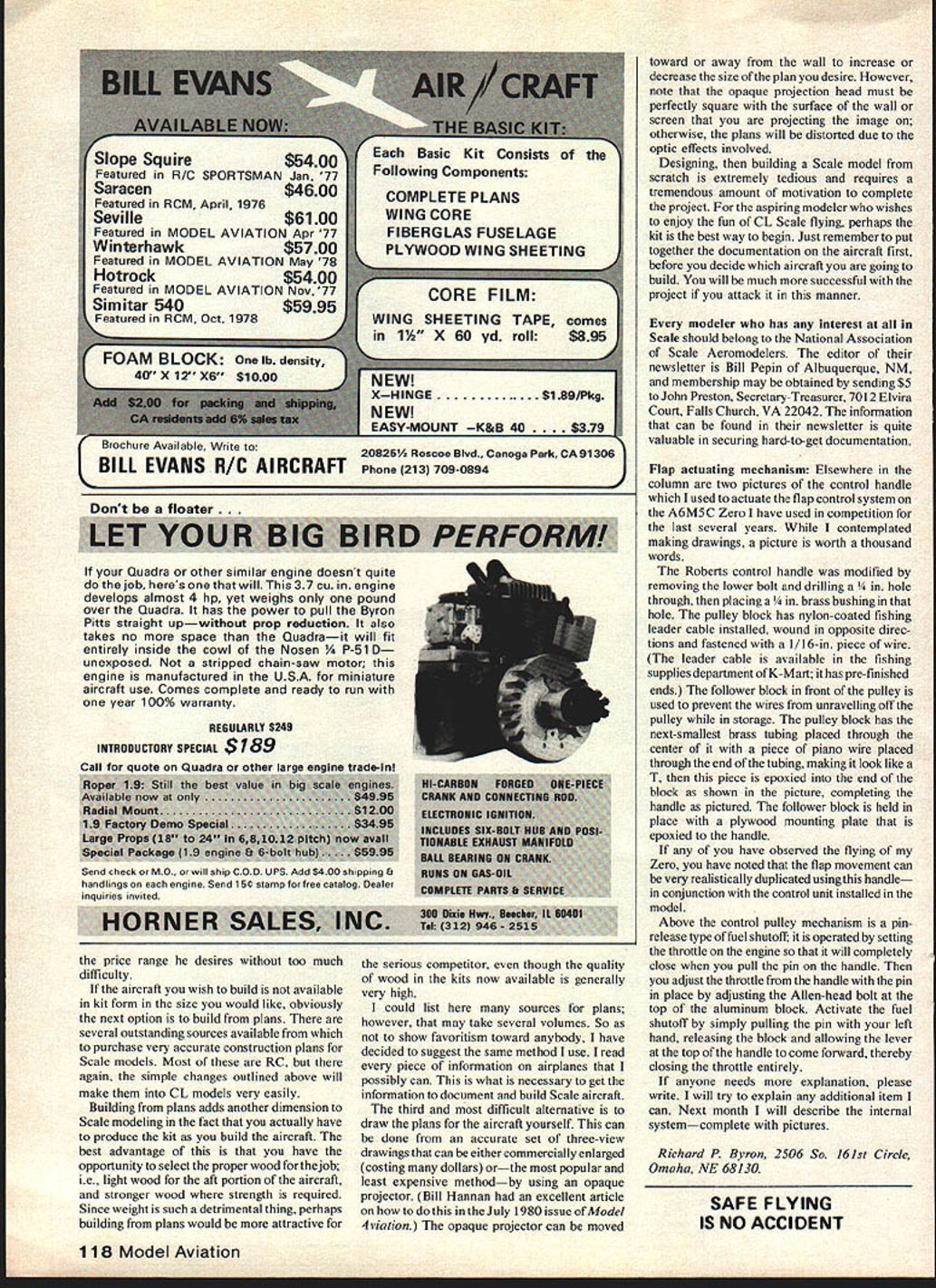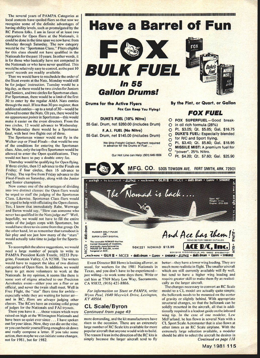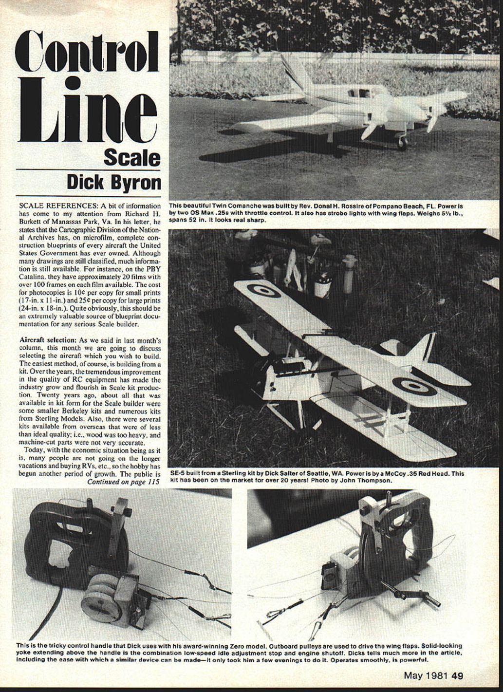 Control S iIM Scale Dick Byron SCALE REFERENCES bit information has come attention Richard H Burkett Manassas Park Va letter states Cartographic Division Nation al Archives has microfilm complete con struction blueprints aircraft United States Government has ever owned Although drawings still classified much informa tion still available instance PBY Catalina have approximately 20 films over 100 frames film available cost photocopies 10t per copy small prints 17-in x 11-in 25 copy large prints 24-in x 1 8-in Quite obviously should extremely valuable source blueprint docu mentation serious Scale builder Aircraft selection As said last months column month going discuss selecting aircraft wish build easiest method course building kit Over years tremendous improvement quality RC equipment has made industry grow flourish Scale kit produc tion Twenty years ago about available kit form Scale builder some smaller Berkeley kits numerous kits Sterling Models Also several kits available overseas less ideal quality ie wood too heavy machine-cut parts very accurate Today economic situation being people going longer vacations buying RVs etc hobby has begun another period growth public Continued vase 115 beautiful Twin Comanche built Rev Donal nossire Pompano Beach FL Power two OS Max 25s throttle control also has strobe lights wing flaps Weighs 5 lb spans 52 looks real sharp SE-5 built Sterling kit Dick Salter Seattle WA Power McCoy 35 Red Head kit has market over 20 years Photo John Thompson F tricky control handle E is award-winning Zero model Outboard pulleys used drive wing flaps Solidlooking yoke extending above handle combination low-speed idle adjustment stop engine shutoff Dicks tells much article including ease similar device can madeit took him few evenings Operates smoothly powerful several years PAMPA Categories local contests have spoiled fliers now recognize some definite advantages having ability levels such promulgated RC Pattern folks am favor least two categories Open fliers Nationals could done time span now have Monday through Saturday new category would Sportsman Class Fliers eligible class should have qualified Nationals past 10 years other words basically have competed Nationals have never qualified would relatively easy control past 10 years records readily available would have reschedule order Stunt events Nats Monday would still judges instruction Tuesday would big day would two circles Juniors Seniors two circles Sportsman class Sportsman would limit first 30 enter regular AMA Nats entries through mail less 30 pre-register additional entriesup total 30would allowed enter Nats Oh yes would no appearance points Sportsmanthis would make easier event directors two circles 12 would advance Wednesday Wednesday would Sportsman final best two flights Out three Sportsman winner would fly Walker cup Final-Finalsthat would conditions entering Sportsman class Also top five Sportsmen would allowed enter Open qualifications would have pay double entry fee Thursday would qualifying Open flying three circles 15 advance Finals Friday four circles 16 advance Friday top five Friday advance Final-Finals Saturday along Junior Senior champions Now comes advantages dividing two distinct classes Open fliers would urged staff judging Sportsman Class Likewise Sportsman Class fliers would urged help officiating Open classes Yes know immediately Rabe Werwage Baron would say can someone never has qualified Nats judge Well hopefully would have fill entire ranks judges corps Sportsmen would have three six come group other hand let us remember turnabout fair play see just stars would actually take time judge Sports men accomplish above suggestions would need large number people write PAMPA President Keith Trostle 10233 Pere grine Fountain Valley CA 92708 writers would have support idea two distinct categories Open fliers addition would have get volunteers work Nationals opinion seems like some sort ofstigma attached Precision Aerobatics eventeither flier official never twain shall meet Well Free Flight star fliers time awhile especially waiting better air RC fliers always judging other classes RCers have existing solid group judges Nationals FAI tryouts have ces raised high Wilmington Nationals have quiet ever since ve spoken out ideas Now can die vine can bestir yourself long enough sit down really compose letter take some action maybe can initiate some changes 1981 1982 Have Barrel Fun BULK FUEL 1n55 Gallon Drums Drums Active Flyers Fox Can Keep Flying DuKES FUEL 10% Nltro 55 Gal Drum net $26000 includes Drum FAI FUEL No Nitro 55 Gal Drum net $14500 includes Drum Ship Freight Collect Payment required advance Drums Fuel . Hot Line can Help 501 6461656 50K221 NOMAD dick dream o Gum Event Director Bill Howe looking over usual workers 1981 Nationals Texas dont have experienced just willingto work some days Write call him 7769 Mary Lou Way Sacramento CA 95832 916 421-8866 information Stunt PAMPA write Wynn Paul 1640 Maywick Drive Lexington KY 40504 CL Scale/Byron Continued page 49 demanding kit manufacturers have risen occasion extremely large number RC Scale kits available popular aircraft anyone would wish build reason lean direction RC kits simply because larger aircraft tend fly o FOX SUPERFUELGood breako in oil rich formula 28/e o Pt $305 Qt $505 Gal $1675 o DUKES FUEL Especially blended R/O Sport flying Pt $340 Ot $560 Gal $1895 MISSILE MIST premium fuel 0 power 250/s Nitro o Pt $420 Qt $760 Gal $2590 betterthey have lower wing loading much realistic flight smaller aircraft still currently available will fly well tend have higher wing loading require greater skill make fly realisti cally larger aircraft changes necessary convert RC Scale model CL model actually quite simple belicrank needs mounted center gravity slightly behind appropriate structural changes belicrank can solidly mounted aircraft addi tionally required leadous guide inboard wing tip case modeler Lew McFarland has flown several Nats CL Sp