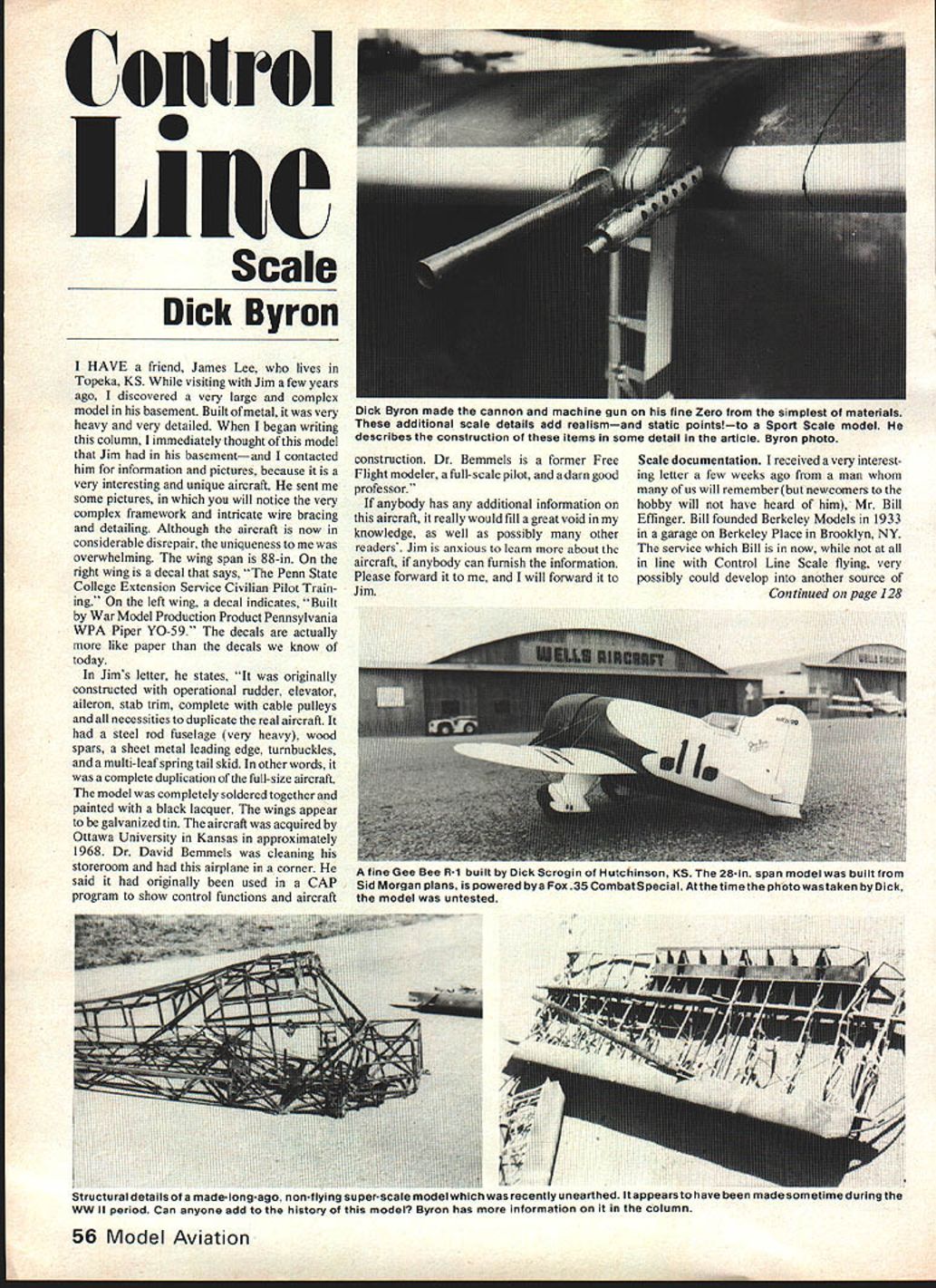 C out rot iIM Scale Dick Byron HAVE friend James Lee lives Topeka KS visiting Jima few years ago discovered very large complex model basement Built metal very heavy very detailed began writing column immediately thought model Jim basement contacted him information pictures because very interesting unique aircraft sent some pictures will notice very complex framework intricate wire bracing detailing Although aircraft now considerable disrepair uniqueness overwhelming wing span 88-in right wing decal says Penn State College Extension Service Civilian Pilot Train ing left wing decal indicates Built War Model Production Product Pennsylvania WPA Piper YO-5 9 decals actually like paper decals know today Jims letter states originally constructed operational rudder elevator aileron stab trim complete cable pulleys necessities duplicate real aircraft steel rod fuselage very heavy wood spars sheet metal leading edge turnbuckles multi-leaf spring tail skid other words complete duplication full-size aircraft model completely soldered together painted black lacquer wings appear galvanized tin aircraft acquired Ottawa University Kansas approximately 1968 Dr David Bemmels cleaning storeroom airplane corner said originally used CAP program show control functions aircraft construction Dr Bemmels former Free Flight modeler full-scale pilot darn good professor anybody has additional information aircraft really would till great void knowledge well possibly other readers Jim anxious learn about aircraft anybody can furnish information Please forward will forward Jim Scale documentation received very interest ing letter few weeks ago man us will rememberbut newcomers hobby will have heard him Mr Bill Effinger Bill founded Berkeley Models 1933 garage Berkeley Place Brooklyn NY service Bill now line Control Line Scale flying very possibly could develop another source Continued page 128 56 Model Aviation Dick Byron made cannon machine gun fine Zero simplest materials additional scale details add realismand static pointsto Sport Scale model describes construction items some detail article Byron photo fine Gee Bee R-1 built Dick Scrogin Hutchinson KS 28-in span model built Sid Morgan plans powered bya Fox 35 CombatSpecial Atthe timethe photo wastaken byDick model untested Structural details ofa made-long-ago non-flying super-scale model recently unearthed Itappearsto have made sometime during WW II period Can anyone add history model Byron has information column available Write Doug 8345 Delhi Road Charleston Heights SC 29405 further infor mation prices FAI Team tryouts 1981 tryouts 1982 FAI Precision Aerobatics team will held Dayton OH over Labor Day week end AMA President Grigg reversed decision upon learning much detail history behind FAI tryouts National Contests think good move information stunt PAMPA write Wynn Pau 1640 Maywick Dr Lexington KY 40504 AMAzerHarmangruber Continued page 53 crude worked wheels back gym test flights now could touch-and-go just like real plane made some happy boys following Saturday beautiful day Robert Champine went Boys Club assembled kids flying model engine An instruction period held first engine operations about what expect model released flew model first sure trim handled very well although takeoff very fast required bit down elevator level off plane fast takeoff caused boys trouble would get plane air give control handle boys worked very well boys could fly until plane ran out fuel Later able manager takeoffs much trouble Much interest has shown program some boys continuing build other types models Brainbusters MAC has ongoing year-round program Penin sula Boys Club Newport News VA exposes boys ages model building As said past article Juniors find have keep showing young people about model building though few Continued page 56 Scale information Bill has formed WE Tech nical Services Inc address 526 Lorell Terrace Atlanta GA 30238 phone 404 25528 88 will remember over years Bill literally over hundred CL Scale designs Berkeley Models personally have built kits feel Bill has given us great amount enjoyment through efforts letter Bill states As Scale documen tation thing important scale dimen sions three-viewswhich often drawn graphics department personnel rather engineering Also photos often distorted special lenses use paint shop drawings usually close enough giving marking details well am sure Bill would glad answer interested modelers services available modeler feel duty inform readers information whether Control Line RC anythingthat happen come across assist model ing enjoyment what about enjoyment Volunteers 81 Nats note John Preston NASA secretary-treasurer states time drawing close firm up help run Scale Nats As competitor always Spirit St Louis love sky. 3/41 5al ReeSe 0 Enoln.Pal. R/C 340/S WIngpn iny Aleneoft eeally f II. Deal rIbtator Welcomed Thleplrose 055 57-205d Seed 500 oar Plyirne Catalog Possibly historically recognized aircraft 0 toe world presented ho Flylioe acoarate tlyiog replica 01 Charles Liod- Jflg1p1g Flyline bergs t927 NY Paris winner appealiog lit loclodes Willraots Bros cylinders decals & tine qoality materials2820 Dorr Ave lB-I 1 Fairfax Virginia 2*031 128 Model Aviation addqs ro GET ORGANIZED SCALE DRAWINOTOS BOOKLETSHere s net 014 stirdy Ides hous en 4 yeas year taaeree 8e azlrresCL Scale/Byron 4 MAG FILES $495 OREGON seed $406 plan 51 00 REPLA-TECH1W p0018g hatrIbra INOUSTRES 1931~~NATI0NAL ox 388-K CATALOGS $20049500MC KENZIE HtA/y DOVER N H 97489 start keep up interest IN STOCK FOR IMMEDIATE SHIPMENT New SUPER QUADRA $8995 wIth BRISIGHELLA FLYWHEEL $10695 QUADRA REPAIR$1000 s KIORITZ engIne 244 culn $18995 Jim Messers ERCOUPE KIT$21995 Jim Messers TOMAHAWK KIT$23995 Concepts BIG FLEET KIT $17995 P&W RADIAL ENGINES Fleet $2995 FIBERGLASS COWL Fleet$1995 BALSA & BASSWOOD sizes 40% OFF Ia SCALE plans QUADRA ERCOUPE TOMAHAWK SKYBOLT$2195 SUPER STEARMAN Godfrey $2495 STARDUSTER TOO lghella $2995 COCKPIT KITS Ercoupe THawk $1500 Stearman Fleet F4U