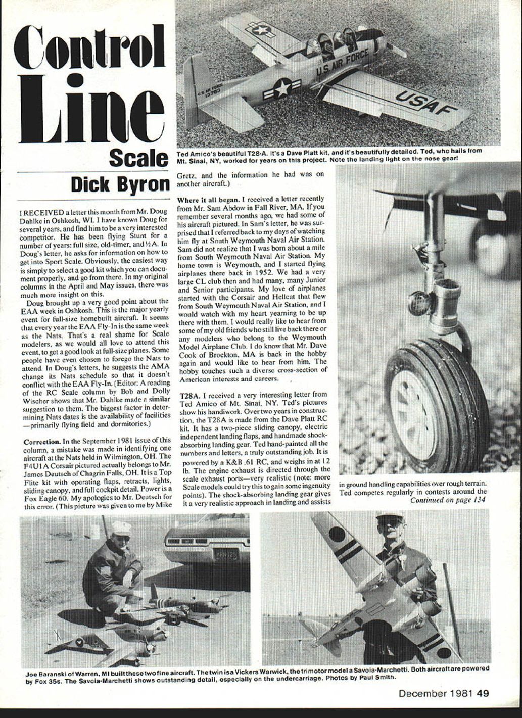 Control 0 Re Scale Dick Byron RECEIVED letter month Mr Doug Dahike Oshkosh WI have known Doug several years find him very interested competitor has flying Stunt number years full size old-timer Dougs letter asks information get Sport Scale Obviously easiest way simply select good kit can docu ment properly go original columns April May issues much insight Doug brought up very good point about EAA week Oshkosh major yearly event full-size homebuilt aircraft seems year EAA Fly-In same week Nats Thats real shame Scale modelers would love attend event get good look full-size planes Some people have chosen forego Nats attend Dougs letters suggests AMA change its Nats schedule doesnt conflict EAA Fly-In Editor reading RC Scale column Bob Dolly Wischer shows Mr Dahlke made similar suggestion biggest factor deter mining Nats dates availability facilities primarily flying field dormitories Correction September 1981 issue column mistake made identifying aircraft Nats held Wilmington OH F4U 1 Corsair pictured actually belongs Mr James Deutsch Chagrin Falls OH Top Flite kit operating flaps retracts lights sliding canopy full cockpit detail Power Fox Eagle 60 apologies Mr Deutsch error picture given Mike Gretz information another aircraft began received letter recently Mr Sam Abdow Fall River MA remember several months ago some aircraft pictured Sams letter sur prised referred back days watching him fly South Weymouth Naval Air Station Sam did realize born about mile South Weymouth Naval Air Station home town Weymouth started flying airplanes back 1952 very large CL club many Junior Senior participants love airplanes started Corsair Hellcat flew South Weymouth Naval Air Station would watch heart yearning up would really like hear some old friends still live back modelers belong Weymouth Model Airplane Club know Mr Dave Cook Brockton MA back hobby again would like hear him hobby touches such diverse cross-section American interests careers T28A received very interesting letter Ted Amico Mt Sinai NY Teds pictures show handiwork Over two years construc tion T28A made Dave Platt RC kit has two-piece sliding canopy electric independent landing flaps handmade shockabsorbing landing gear Ted hand-painted numbers letters truly outstanding job powered K&B 61 RC weighs 12 lb engine exhaust directed through scale exhaust portsvery realistic note Scale models could try gain some ingenuity points shock-absorbing landing gear gives very realistic approach landing assists ground handling capabilities over rough terrain Ted competes regularly contests around Continued page 134 Joe Baranaki Warren Ml builtthesetwotine aircrart i netwin isa vickers Warwick thetrimotor model Savois-MarcIlettl Uotn aircrartare poweu Fox 35s Savoia-Marchetti shows outstanding detail especially undercarriage Photos Paul Smith December 1981 49 lea IAmIcos Deaulliul to- Its Dave Platt kit its beautifull aiIed - -Mt Sinai NY worked years project N k IIin nn th Year Limited nty Pre-Dnhled Props Avail Ask About Custom- Built KIORITZ Engines Deep Fins Optimum Cooling 21/4 Flywheel Small Magneto 1 5/am Six Bolt Aluminum Hub Carb Needles &Throttle Accessible Engine Running Godfrey Points Sealed Rear Housing $19995 pay shIp pre-paid orders Mufflers Now Availablel DEALERS WELCOME 242 cc 397ccSPECIFICATIONS 32HP 8000 rpmWoibto Pomp CarbBall Bearmngs Crank ght B b3 Riog PistonCaged Rollers Rod ond Foton Finn GIBBS HOBBY & RESEARCH 6195 HIlifleld St NW N CANTON OHIO 44720 Phone 21 6 499-8854 after 600 PM C ELECTRONIC SERVICENTER FACTORY AUTHORIZED WARRANTY SERVICE FOR KRAFT over 35 other manufacturers Tired wasting money radio service os per formance too important jeopardized inexperien ced uncaring technician company just person re pairs RC equipment RCer cares about radio ME 24 HOUR SERVICE NEAL WARREN 3 South 21St Street erPh iladelphia PA 19103 Tel 215 564-0800 24 HOUR SERVICE Mon-Fri 9AM-53OPM AO Wed night till 8PM Sat 9AM Noon spacing important capability flying high winds An airplane aerodynamically detuned through addition nose weight will have no reserve turn available conditions demand conclusion Excitation merely another Nobler new cosmetics truly better mousetrap designed fill mans demands capability adapt variety flying styles Simply because has way performance available ever called win todays Precision Aerobatics arena properly trimmed Excitation can adjusted suit Precision Aerobatics flier about CL Scale/Byron Continued page 49 East Coast am sure several people familiar aircraft also excel lent photographer pictures reflect An out standing aircraft Profile Publications has come atten tion Profile Publications being put back print again outstanding modeling assistance Scale modelers am looking forward acquiring entire series now have about 70 something Scale modeler should have because value 5-views come publication probably will expensive past will worth penny serious Scale modeler historian Look advertised upcoming issues of model magazines Dont let slide through hands like once did Richard P Byron 2506 So 16 1st Circle Omaha NE 68130 CL Racing/Lee Continued page 50 ing Racing headed us has own opinion since have pencil hand heres Ther will probably always core avid AMA Racing enthusiasts likelihood ones will always found Nats sad part year after year hard-nosed group seems little smaller year before isnt new infusion interest provide numbers used exist have Racers gone What needs done get interest back lot has written about various Racing events types events column other publications generally accepted term inology coined Jim Thomerson True Sport TS Just Another Racing JAR event Basically TS event extremely specific its rules effort allow sport flier use sport flying equipment competitive TS event should capable being flown equipment available local hobby shop dominated nonavailable equipment various TS events have heard recently generally specify engine brand model plane configuration etc JAR event usually limited version normal AMA 