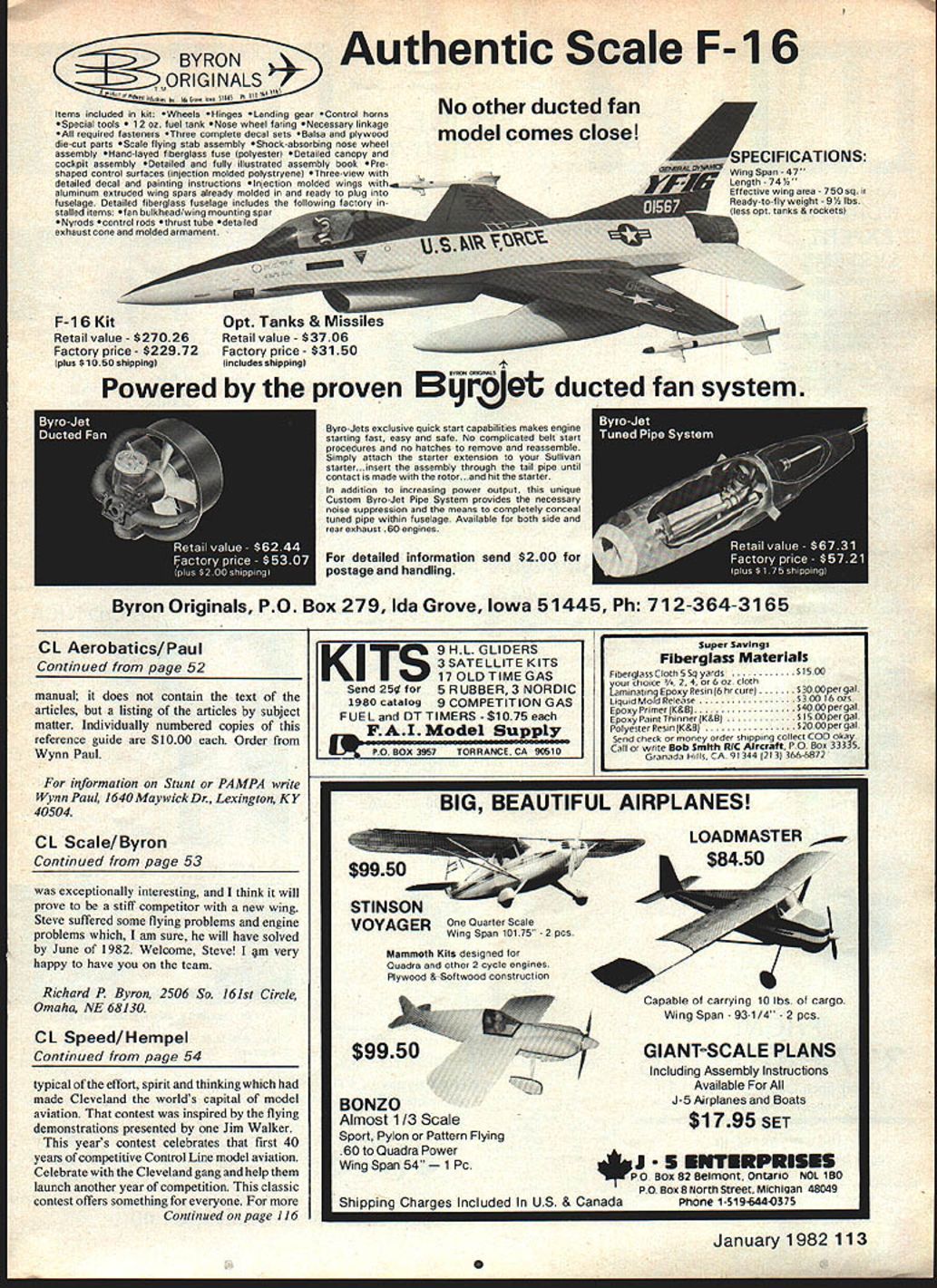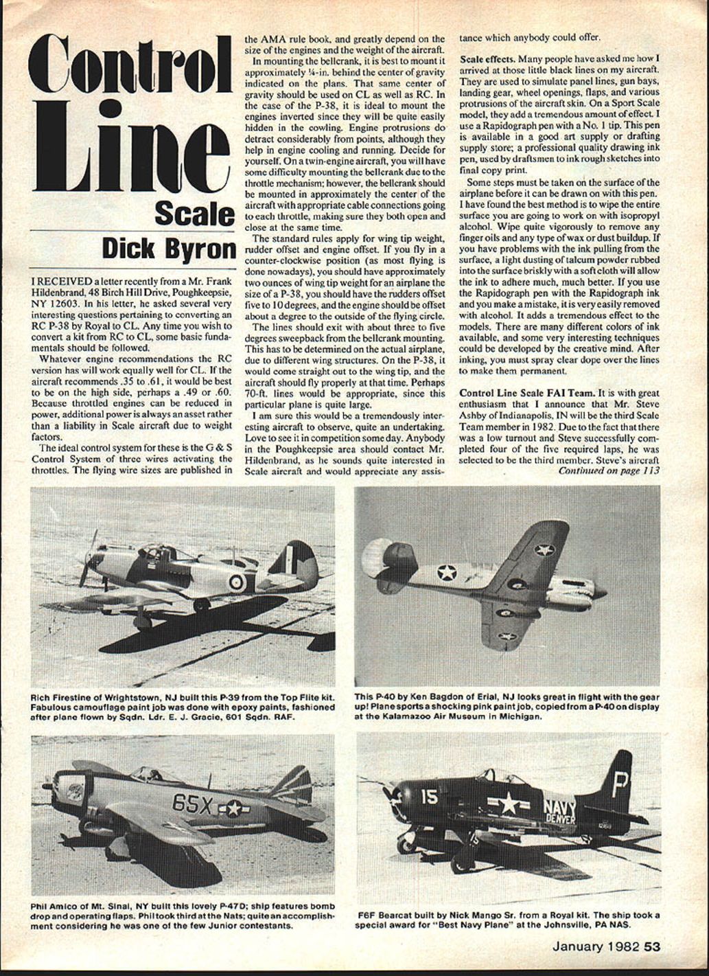 Control Scale Dick Byron RECEIVED letter recently Mr Frank Hildenbrand 48 Birch Hill Drive Poughkeepsie NY 12603 letter asked several very interesting questions pertaining converting RC P-38 Royal CL Any time wish convert kit RC CL some basic funda mentals should followed Whatever engine recommendations RC version has will work equally well CL aircraft recommends 35 61 would best high side perhaps 49 60 Because throttled engines can reduced power additional power always asset rather liability Scale aircraft due weight factors ideal control system G & S Control System three wires activating throttles flying wire sizes published AMA rule book greatly depend size engines weight aircraft mounting bellcrank best mount approximately -in behind center gravity indicated plans same center gravity should used CL well RC case P-38 ideal mount engines inverted since will quite easily hidden cowling Engine protrusions detract considerably points although help engine cooling running Decide yourself twin-engine aircraft will have some difficulty mounting bellcrank due throttle mechanism however bellcrank should mounted approximately center aircraft appropriate cable connections going throttle making sure both open close same time standard rules apply wing tip weight rudder offset engine offset fly counter-clockwise position flying done nowadays should have approximately two ounces wing tip weight airplane size P-38 should have rudders offset five 10 degrees engine should offset about degree outside flying circle lines should exit about three five degrees sweepback bellcrank mounting has determined actual airplane due different wing structures P-38 would come straight Out wing tip aircraft should fly properly time Perhaps 70-ft lines would appropriate since particular plane quite large am sure would tremendously inter esting aircraft observe quite undertaking Love see competition some day Anybody Poughkeepsie area should contact Mr Hildenbrand sounds quite interested Scale aircraft would appreciate assis tance anybody could offer Scale effects people have asked howl arrived little black lines aircraft used simulate panel lines gun bays landing gear wheel openings flaps various protrusions aircraft skin Sport Scale model add tremendous amount effect use Rapidograph pen No 1 tip pen available good art supply drafting supply store professional quality drawing ink pen used draftsmen ink rough sketches final copy print Some steps must taken surface airplane before can drawn pen have found best method wipe entire surface going work isopropyl alcohol Wipe quite vigorously remove finger oils type wax dust buildup have problems ink pulling surface light dusting talcum powder rubbed surface briskly soft cloth will allow ink adhere much much better use Rapidograph pen Rapidograph ink make mistake very easily removed alcohol adds tremendous effect models different colors ink available some very interesting techniques could developed creative mind After inking must spray clear dope over lines make permanent Control Line Scale FAI Team great enthusiasm announce Mr Steve Ashby Indianapolis IN will third Scale Team member 1982 Due fact low turnout Steve successfully com pleted four five required laps selected third member Steves aircraft Continued page 113 January 1982 53 Rich Firestine Wrightstown NJ built P39 Top Flite kit P-40 Ken Bagdon Erial NJ looks great flight gear Fabulous camouflage paint job done epoxy paints fashioned up Plane sports shocking pink paint job copied P40 display after plane flown Sqdn Ldr E J Gracie 601 Sqdn RAP Kalamazoo Air Museum Michigan Phil Amico Mt Sinai NV built lovely P-47D ship features bomb drop operating flaps Phil took third atthe Nats quite accomplish F6F Bearcat built Nick Mango Sr Royal kit ship took ment considering few Junior contestants special award Best Navy Plane Johnsville PA NAS ~ORKNALS &d Items included kit Wheels Hinges Landing gear Control horns Special tools z fuel tank Nose wheel faring Necessary linkage AII required fasteners Three complete decal sets Balsa plywood die-cut parts Scale flying stab assembly Shock-absorbing nose wheel assembly Hand-layed fiberglass fuse Ipolynsterl Detailed canopy cockpit assembly Detailed fully illustrated assembly book Pre shaped control surfaces injection molded polystrysnel Three-view detailed decal painting instructions lnjection molded wings aluminum extruded wing spars already molded ' fuselage Detailed fiberglass fuselage includes the v stalled items fan bulkhead/wing mounting spar Nyrods control rods thrust tube detailed exhaust cone molded armament F-i 6 Kit Retail value $27026 Factory price $22972 Iplus $1050 shipping Opt Tanks & Retail value $3706 Factory price- $3150 lincludes shipping Authentic Scale F-i 6 Byro-Jets esciusive quick start capabilities makes engine starting fast easy safe No complicated belt start procedures no hatches remove reassemble Simply attach starter extension Sullivan starter insert assembly through tail pipe until contact made rotor.and hit starter addition increasing power output unique custom Byro-Jet Pipe System provides necessary noise suppression means completely conceal tuned pipe within fuselage Available both side rear exhaust 60 engines detailed information send $200 postage handling Byron Originals PO Box 279 Ida Grove Iowa 51445 Ph 712-364-3165 CL Aerobatics/Paul Continued page 52 manual does contain text articles listing articles subject matter Individually numbered copies reference guide $1000 Order Wynn Paul information Stunt PAMPA write Wynn Paul 1640 Maywick Dr Lexington KY 40504 CL Scale/Byron Continued page 53 exceptionally interesting think will prove stiff competitor new wing Steve suffered some flying problems engine problems am sure will have solved June 1982 Welcome Steve m very happy have team Richard P Byron 2506 So 161st Circle Omaha NE 68130 CL Speed/Hempel Continued page 54 typical effort spirit thinking made Cleveland worlds capital model aviation contest inspired f