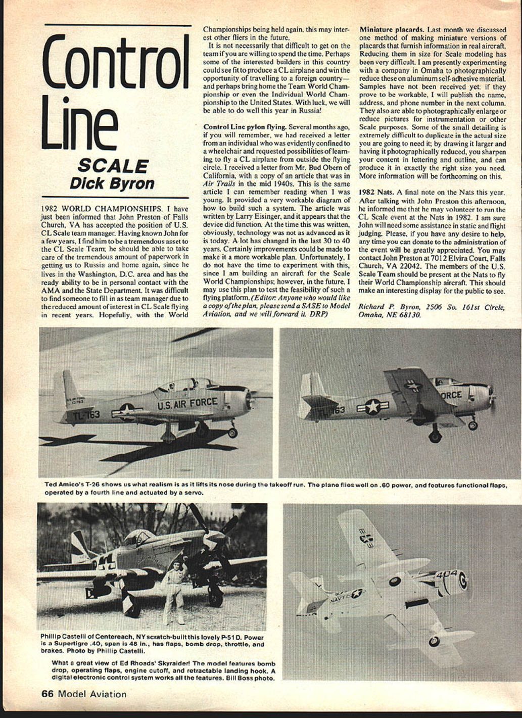 Control Line SCALE Dick Byron 1982 WORLD CHAMPIONSHIPS have Just informed John Preston Falls Church VA has accepted position US CL Scale team manager Having known John few years find him tremendous asset CL Scale Team should able take care tremendous amount paperwork getting us Russia home again since lives Washington DC area has ready ability personal contact AMA State Department difficult find someone fill team manager due reduced amount interest CL Scale flying recent years Hopefully World Championships being held again may inter est other fliers future necessarily difficult get team willing spend time Perhaps some interested builders country could see fit produce CL airplane win opportunity travelling foreign country perhaps bring home Team World Cham pionship Individual World Cham pionship United States luck will able well year Russia Control Line pylon flying Several months ago will remember received letter individual evidently confined wheelchair requested possibilities learn ing fly CL airplane outside flying circle received letter Mr Bud Obern California copy article Air Trails mid 1940s same article can remember reading young provided very workable diagram build such system article written Larry Eisinger appears device did function time written obviously technology advanced today lot has changed last 30 40 years Certainly improvements could made make workable plan Unfortunately have time experiment since am building aircraft Scale World Championships however future may use plan test feasibility such flying platform Editor Anyone would like copy ofthe plan please send SASE Model Aviatio will forward DRP Miniature placards Last month discussed method making miniature versions placards furnish information real aircraft Reducing size Scale modeling has very difficult am presently experimenting company Omaha photographically reduce aluminum self-adhesive materiaL Samples have received yet prove workable will publish name address phone number next column also able photographically enlarge reduce pictures instrumentation other Scale purposes Some small detailing extremely difficult duplicate actual size going need drawing larger having photographically reduced sharpen content lettering outline can produce exactly right size need information will forthcoming 1982 Nats final note Nats year After talking John Preston afternoon informed may volunteer run CL Scale event Nats 1982 am sure John will need some assistance static flight judging Please have desire help time can donate administration event will greatly appreciated may contact John Preston 7012 Elvira Court Falls Church VA 22042 members US Scale Team should present Nats fly World Championship aircraft should make interesting display public see Richard P Byron 2506 So 161st Circle Omaha NE 68130 Ted Amicos T-26 snows us what realism liSts its nose during takeott run plane tiles well 60 power teatures tunctional tiaps operated fourth line actuated servo What great view Ed Rhoads Skyraider model features bomb drop operating flaps engine cutoff retractable landing hook digital electronic control system works features Bill Boss photo 66 Model Aviation PhillipCastelli Centereach NYscratch-ouiixtnis lovely i1 D Power Supertigre 40 span 48 has flaps bomb drop throttle brakes Photo Phillip Castelli