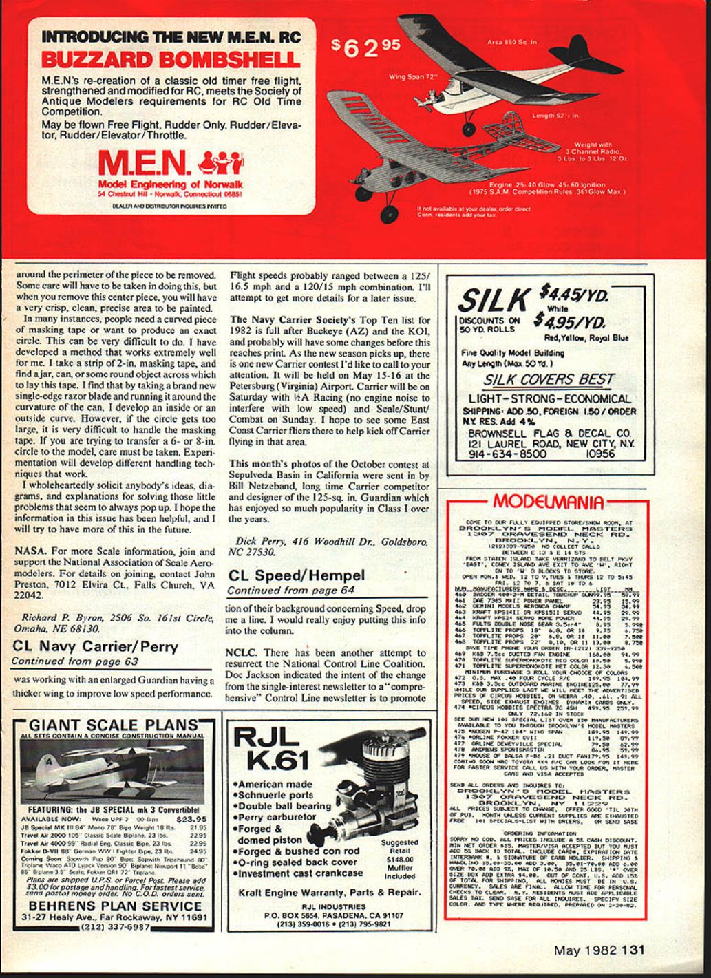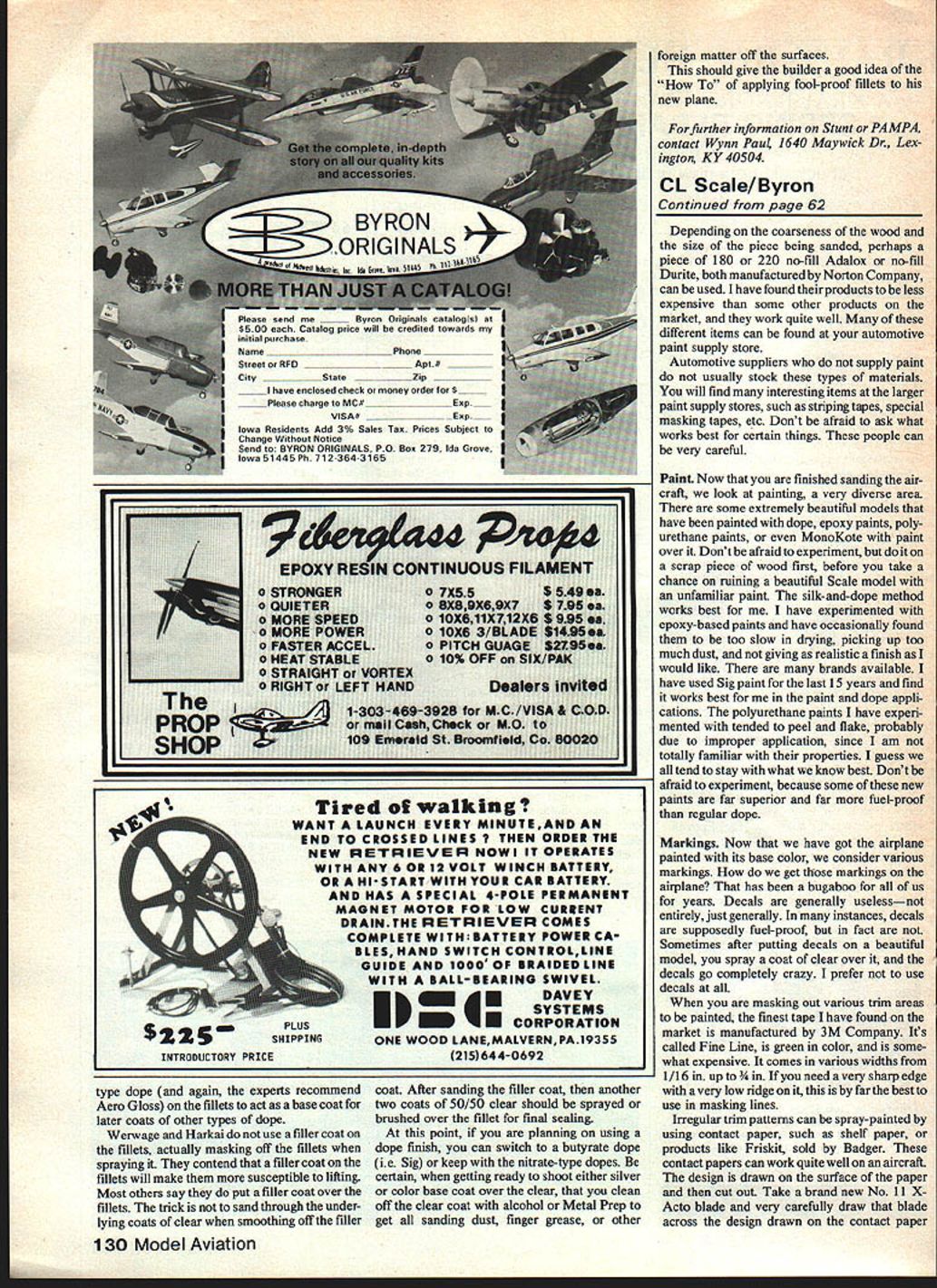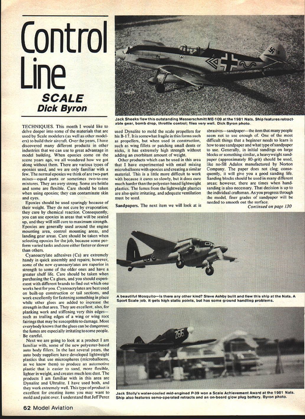 Control Line SCALE Dick Byron TECHNIQUES month would like delve deeper some materials used Scale modelers well other model ers build aircraft Over years have discovered different products other industries can use great advantage model building epoxies come scene years ago wondered got along various types epoxies used familiar few normal epoxies think two-part mixesequal parts sometimes two-to-one mixtures very strong Some brittle some flexible Care should taken using epoxies can contaminate skin eyes Epoxies should used sparingly because weight cure evaporation cure chemical reaction Consequently can use epoxies areas will sealed up will still cure maximum strength Epoxies generally used around engine mounting area control mounting areas landing gear areas Care should taken selecting epoxies job because some per form varied tasks cure either faster slower others Cyanoacrylate adhesives Ca extremely handy quick assembly repairs however some new cyanoacrylates superior strength some older ones have greater shelf life Care should taken purchasing Ca glues should experi ment different brands find Out works best Cyanoacrylates best used built-up construction tail sections work excellently fastening something place other glues added increase strength area excellent also planking work stiffening very thin edges such trailing edges wing wing root fairings may susceptible damage Most everybody knows glues can dangerous fumes especially irritating some people careful Next going look product am familiar some new polyester-based auto body fillers last several years auto body suppliers have developed lightweight plastics use microspheres microballoons know produce automotive plastic easier sand flexible lighter weight creates much less dust products am familiar area Dynalite Ultralite have used both work extremely well type product excellent creating items may want mold paint over understand Jeff Perez used Dynalite mold scale propellers B- 17 somewhat fragile thin forms such propellers used construction such wing fillets patching small dents nicks has extremely high strength adding exorbitant amount weight Other products can used area have experimented entail mixing microballoons epoxies creating similar material little difficult work because cures slowly does cure much harder polyester-based lightweight plastics fumes lightweight plastics also quite irritating adequate ventilation must used Sandpapers next item will look abrasivessandpaperthe item people seem use enough difficult things beginner needs leam use sandpaper what type sandpaper use Generally initial sandings large blocks something similar heavyweight sand paper approximately 80-grit should used like no-fill Adalox manufactured Norton Company paper does clog conse quently will give good sanding life Sanding blocks should used different areas however times handsanding also necessary decision up individual craftsman As progress through model finer grades sandpaper will needed smooth out surface Continued page 130 62 Model Aviation Jack Sheeks flew outstanding Messerschmitt ME-i 09 1981 Nats Ship features retract able gear bomb drop throttle control flies very well Dick Byron photo beautiful Mosquitois other kind Steve Ashby built flew ship Nats Sport Scale job gets high static points has some ground handling problems Jack Stollys water-cooled mid-engined P-39 won Scale Achievement Award tne 1 ei Nasa Ship also features servo-operated retracts on-board glow plug battery Byron photo type dope again experts recommend Aero Gloss fillets act base coat later coats other types dope Werwage Harkai use filler coat fillets actually masking off fillets spraying contend filler coat fillets will make susceptible lifting Most others say put filler coat over fillets trick sand through under lying coats clear smoothing off filler coat After sanding filler coat another two coats 50/50 clear should sprayed brushed over fillet final sealing point planning using dope finish can switch butyrate dope ie Sig keep nitrate-type dopes certain getting ready shoot either silver color base coat over clear clean off clear coat alcohol Metal Prep get sanding dust finger grease other foreign matter off surfaces should give builder good idea applying fool-proof fillets new plane further information Stunt orPAMPA contact Wynn Paul 1640 Maywick Dr Lex ington KY 40504 CL Scale/Byron Continued page 62 Depending coarseness wood size piece being sanded perhaps piece 180 220 no-fill Adalox no-fill Durite both manufactured Norton Company can used have found products less expensive some other products market work quite well different items can found automotive paint supply store Automotive suppliers supply paint usually stock types materials will find interesting items larger paint supply stores such striping tapes special masking tapes etc Dont afraid ask what works best certain things people can very careful Paint Now finished sanding air craft look painting very diverse area some extremely beautiful models have painted dope epoxy paints poly urethane paints MonoKote paint over Dont afraid experiment scrap piece wood first before take chance ruining beautiful Scale model unfamiliar paint silk-and-dope method works best have experimented epoxy-based paints have occasionally found too slow drying picking up too much dust giving realistic finish would like brands available have used Sig paint last 15 years find works best paint dope appli cations polyurethane paints have experi mented tended peel flake probably due improper application since am totally familiar properties guess tend stay what know best Dont afraid experiment because some new paints far superior far fuel-proof regular dope Markings Now have got airplane painted its base color consider various markings get markings airplane has bugaboo us years Decals generally uselessnot entirely just generally instances decals supposedly fuel-proof fact Sometimes after putting decals beautiful model spray coat clear over decals go 