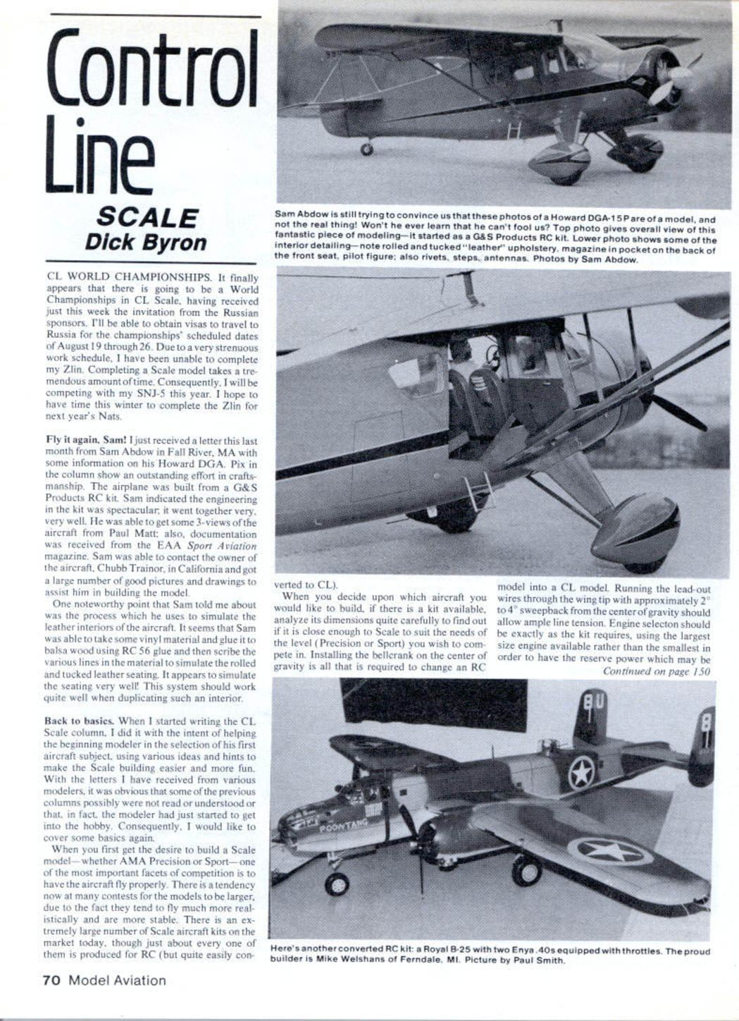 Control Line SCALE Dick Byron CL WORLD CHAMPIONSHIPS finally appears going World Championships CL Scale having received just week invitation Russian sponsors Ill able obtain visas travel Russia championships scheduled dates August 19 through 26 Due very strenuous work schedule have unable complete Zlin Completing Scale model takes tre mendous amount time Consequently will competing SNJ-5 year hope have time winter complete Zlin next years Nats Fly again Sam Ijustreceivedaletterthis last month Sam Abdow Fall River MA some information Howard DGA Pix column show outstanding effort crafts manship airplane built G&S Products RC kit Sam indicated engineering kit spectacular went together very very well able get some 3-views aircraft Paul Matt also documentation received EAA Sport viation magazine Sam able contact owner aircraft Chubb Trainor California got large number good pictures drawings assist him building model noteworthy point Sam told about process uses simulate leather interiors aircraft seems Sam able take some vinyl material glue itto balsa wood using RC 56 glue scribe various lines material simulate rolled tucked leather seating appears simulate seating very well system should work quite well duplicating such interior Back basics started writing CL Scale column did intent helping beginning modeler selection first aircraft subject using various ideas hints make Scale building easier fun letters have received various modelers obvious some previous columns possibly read understood fact modeler just started get hobby Consequently would like cover some basics again first get desire build Scale model whether AMA Precisionor Sport important facets competition have aircraft fly properly tendency now contests models larger due fact tend fly much real istically stable ex tremely large number Scale aircraft kits market today though just about produced RC quite easily con70 Model Aviation Sam Abdow still trying convince us photos Howard DGA-1 5 Pare model real thing Wont ever learn cant fool us Top photo gives overall view fantastic piece modelingit started G&S Products RC kit Lower photo shows some interior detailingnote rolled tucked leathe upholstery magazine pocket back front seat pilot figure also rivets steps antennas Photos Sam Abdow verted CLmodel CL model Running lead-out decide upon aircraft wires through wing tip approximately 20 would like build kit available to40 sweepback centerof gravity should analyze its dimensions quite carefully find out allow ample line tension Engine selecton should close enough Scale suit needs exactly kit requires using largest level Precision Sport wish com- size engine available rather smallest pete Installing bellcrank center order have reserve power may gravity required change RC Continued vaze iSO Heres anotherconverted RC kit Royal B-25 two Enva 40s equipped throttles proud builder Mike Weishans Ferndale Ml Picture Paul Smith 1 LIiIj7 MINI R/C & SPORT ENGINES U/CONTROL ENGINES PROVIDE HIGH RPMS FOR TOP PERFORMANCE THROTTLED R/C ENGINES COMBINE DEPENDABLE IDI F WITH TRANSITION TO CONSISTENT HIGH SPEEDS ALL START EASILY MU 03 U/C03 RIG061 18000 RPM061 R/GC GLOW $3895 HEAD & PROP WITH 035~7 FOR CARS & BOATS1 95GLOWPLUGS 4500 21000 RPM 14000- 18000 RPMNOT INCLUDED Calif add Sales Tax Shipping $300 na CODs VIS4 Brachure 6 US $170 Foreign Add 41/2% far Visa ar Master Card Std Dealer Distributor Discaunts 13400-26 Saticoy StreetNorth Hollywood Calif 916052latiae-I.ooJ for\ fine instruments small craft & aircraft design comprehensive catalog return x 1534 Sauthold NY -waterlines mci 1971 516 765-1960 items Fox too Dick mentioned recent letter hasnt gotten feedback modelers products Could squawk something doesnt work experience tank inserts remote needle assembly sent worked expected Let Dick know things work out last thing long venturiinboard tanks large venturts cause critical needle settings forewarned otherpicture GregHills Fast Combat model powered 58 K&B having case tumed around exhaust goes forwardL seems no measurable loss power though exhaust flows over venturi sure helps getting engine back wing good balance simplified construc tion because dont have route exhaust through around wing An added benefit launcher because noise level much GET ORGANIZED 5 set 01 4 sturdy ItteS trOldS over 4 years favotrte 5 rragarnes 4 MAG FILES $495 Seed $495 Plus Si 00 postage handlere DON INOIJITRIES P0 BOX 388-K DOVER NH 03820 less rear-engine exhaust conventional side-exhaust new Hoffelt carbon fiber props also place motor props will cost arm leg about SI 2whichever prefer higher-than-normal cost because prop will come finished ready install motor majority fiberglass carbon fiber props hacked up much dont per form well stock wood prop Only handful people able work up props correctly rest us never see perform ance gain offered such prop chalk up usual 5 or6 dollars weve paid experience Maybe next column Ill able give date props will ready distribution said last column Well time flies Charlie Johnson 3716 Ingraham St San Diego CA 92109 FREE FLIGHT FLYING SITES DONT GROW ON TREES CL Scale/Byron Continued page 70 necessary keep out tight situation important factors flying CL model have ample power very dependable engine good throttle response Become very familiar engines operation break quite well Engine cooling perhaps diffi cult things average Scale model due presence enclosed cowlings lack air ducts out rear cowling have small air outlet should also have small air inlet directed exactly engine cooling fins rather just complete open cowl has problems SNJ-5 will cured year through dif ferent ducting arrangements cowling will direct cool air through top center cowling strictly engine cooling fins thereby allowing engine run cooler Scale model building has tremendous amount enjoyment other people well spectators however requires tremendous amount time pa tience dedication build fly lack time due business reasons has made decide resign writing CL Scale column effective i