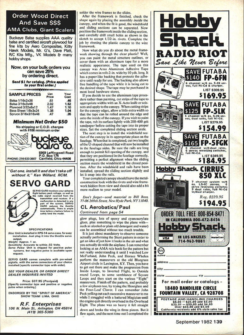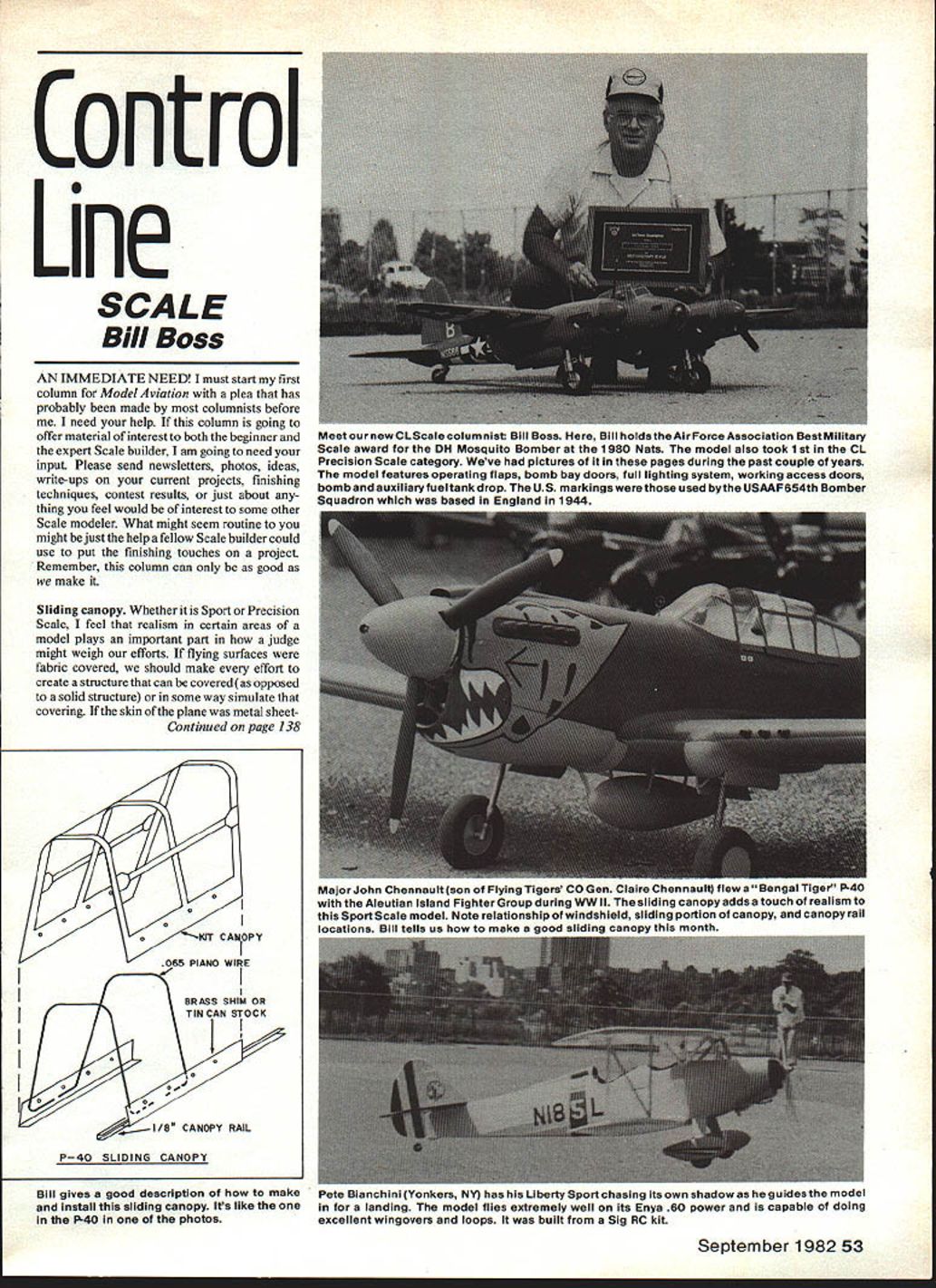 Control Line SCALE Bill Boss IMMEDIATE NEED must start first column Model Aviation plea has probably made columnists before need help column going offer material interest both beginner expert Scale builder am going need input Please send newsletters photos ideas write-ups current projects finishing techniques contest results just about thing feel would interest some other Scale modeler What might seem routine might just help fellow Scale builder could use put finishing touches project Remember column can good make Sliding canopy Whether Sport Precision Scale feel realism certain areas model plays important part judge might weigh efforts flying surfaces fabric covered should make effort create structure can coveredas opposed solid structure some way simulate covering skin plane metal sheetContinued page 138 -KIT CANOPY 065 PIANO WIRE BRASS SHIM Oft TIN CAN STOCK oUC0IC CANOPY RAIL P40 SLIDING CANOPY Bill gives good description make rene Dlancnun nonIers N nj nas Liberty Sport chasing its own shadow guides model install sliding canopy Its like landing model flies extremely well its Enya 60 power capable doing P-40 photos excellent wingovers loops built Sig RC kit September 198253 Meet new CL Scale columnist Bill Boss Bill holds Air Force Association Best Military Scale award DH Mosquito Bomber 1980 Nats model also took 1 st CL Precision Scale category Weve pictures pages during past couple years model features operating flaps bomb bay doors full lighting system working access doors bomb auxiliaryfuel tank drop US markings werethose used bythe USAAF654th Bomber Squadron based England 1944 Major John hennault son oil-lying igers LU uen LIaIre nennauiij new DerigeE IIUI tian Island FighterGroup during WW II sliding canopy adds touch realism Sport Scale model Note relationship windshield alidina nortion canopy canopy rail In,tiinC Rill tIIs hnw tn mskn n dnn th SAILPLANE ENTHUSIASTS ENJOY TROUBLE-FREE FLYING WITH THE NEW POWRWINCH AND THE RETRIEVER DESIGNED FOR EASE OF HANDLING AND THOROUGHLY TESTED BY MODELERS IN THE FIELD THE POWR WINCH WILL LAUNCH ANY SIZE SAILPLANE TO MAXIMUM HEIGHT WITH FAST EASY OPERATION AND FOR THE FIRST TIME LAUNCH-AMINUTE IS POSSIBLE USING THE RETRIEVER NO WAITING-NO WALKING NO NONSENSE Write call information Best Ducted Fans SKYRA Y F4D- Plan Form SKYRAY NAVY F4D-1 ale Oucted Fan RIC RK-20 Fan Unt44 IoegPIan Set RCDF1 $1005 WE TECHNICAL SERVICES Box 76884-A Atlanta Georqio 30328 end December 1937 Hawker Hurricane monoplane began appear first squadron adaptations However months later September 29 1938 Neville Chamberlain signed Munich Agreement air defense England depended almost entirely biplanes still dominated Gauntlets time fully operational established units available first-line strength three Hawker Fury squadrons five Gloster Gladiator squad rons eight Gloster Gauntlet squadrons two Hawker Hurricane squadrons Spitfires operational scene alt Less year later however September 3 1939 home-defense squadron still employed Gauntlets No 616 South York shire careful examination records seems confirm Battle Britain won fighter force came maturity largely Gloster Gauntlet Subsequently employed training aircraft secondary machines some Gladiator mixed-type squadrons last recorded active employment Gloster Gauntlet RAF 1943 East Africa also known two Gauntlets sold Rhodesia two Finland two South Africa Physical description Gloster Gauntlet Land II small differences indicated Type Single-place day night interceptor Dimensions Wingspan 328084 ft 10Om Length 126 ft 2 1126 ft 5 Wing area 315 sq ft Engine Bristol Mercury VI S2 640-hp ninecylinder air-cooled radial two-blade Watts wood en propellerI II three-blade Fairey metal propeller some late us Weight 11 Empty 2775 pounds loaded 3970 pounds Performance land II Top speed 230 mph 15800 ft stalling speed 59 mph service ceiling 33500 ft range 455 miles time 20000 ft 9 mm Armament Two Vickers Mk V synchronized machine guns 600 rounds Wing structure Two steel web strip spars aluminum alloy ribs fabric covered fabric tached main drag ribs GInntr wire-An No COD FOB Englewood Check Chargecard Money Order Only Send FREE Catalog method strut ends bracing wire forkends inside fabric line Fuselage structure Three sections forward engine mount center square tubes wrapped joints tie-rods aft section round tubes squared strut points Warren girder truss side view braced plan tie-rods Fuselage faired oval light metal panels forward fabric covered aft Empennage structure Steel tubes aluminum ribs fabric covered adjustable tail-plane related interest concerning Gloster Aircraft pilot PEG Sayer March 1938 great days Gauntlet Gladiator biplanes Gloster received con tract E 28/39 experimental aircraft became first British jet test flown May 15 1941 Sayer Fury Gauntlet fame general contemplation biplanes op posed monoplane configuration further technical historical interest recall generally unknown now fact aeronautical science Although would seem specific analytical description aerodynamics flight mechanics monoplane should simpler older biplane such case Rather describing biplane mechanism load distribution down wash drag contributions etc possible represent aero-mechanics arrangement vortices providing relatively simple analysis established Prandtl Betz Got tingen later simplified Munk years before satisfactory general theory mono plane established CL Scale/Boss Continued page 53 ing solid structure permissible might also include skin panel outlines rivet heads item would like cover column cockpits canopy convert kit canopy one-piece stationary installation operationaL sliding canopy described installed Top Flite P-40 pleasure flying 1976 Nats several years after details specifically P-40 installation same basic idea can applied almost other form canopy rides rails imbedded fuselage sides first step making sliding canopy construct piano wire framework slides shown sketch Using plastic canopy pattern shape wire fit inside contours canopy front 