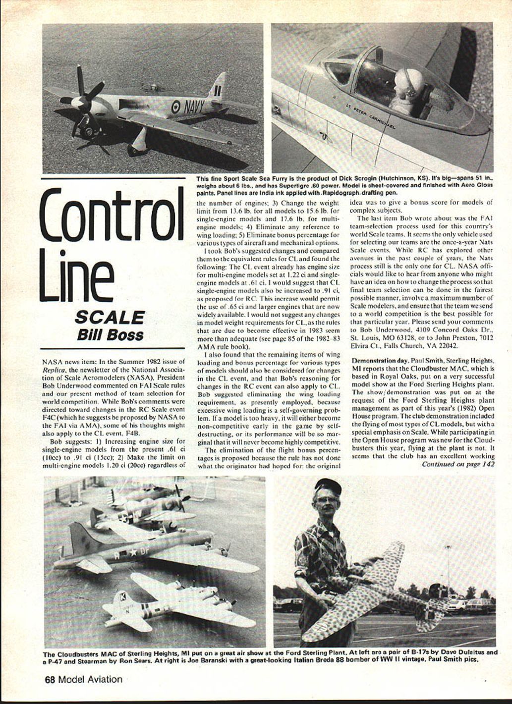 Control Line SCALE Bill Boss NASA news item Summer 1982 issue Replica newsletter National Associa tion Scale Aeromodelers NASA President Bob Underwood commented FAI Scale rules present method team selection world competition Bobs comments directed toward changes RC Scale event F4C suggests proposed NASA FAI via AMA some thoughts might also apply CL event F4B Bob suggests Increasing engine size single-engine models present 61 ci 10cc 91 ci 15cc 2 Make limit multi-engine models 120 ci 20cc regardless number engines 3 Change weight limit 136 lb models 156 lb single-engine models 176 lb multiengine models 4 Eliminate reference wing loading 5 Eliminate bonus percentage various types aircraft mechanical options took Bobs suggested changes compared equivalent rules CL found following CL event already has engine size multi-engine models set 122 ci singleengine models 61 ci would suggest CL single-engine models also increased 91 ci proposed RC increase would permit use 65 ci larger engines now widely available would suggest changes model weight requirements CL rules due become effective 1983 seem adequate see page 85 1982-83 AMA rule book also found remaining items wing loading bonus percentage various types models should also considered changes CL event Bobs reasoning changes RC event can also apply CL Bob suggested eliminating wing loading requirement presently employed because excessive wing loading self-governing prob 1cm model too heavy will either become non-competitive early game self destructing its performance will mar ginal will never become highly competitive elimination flight bonus percen tages proposed because rule has done what originator hoped original idea give bonus score models complex subjects last item Bob wrote about FAI team-selection process used countrys world Scale teams seems vehicle used selecting teams once-a-year Nats Scale events RC has explored other avenues past couple years Nats process still CL NASA offi cials would like hear anyone might have idea change process final team selection can done fairest possible manner involve maximum number Scale modelers ensure team send world competition best possible particular year Please send comments Bob Underwood 4109 Concord Oaks Dr St Louis MO 63128 John Preston 7012 Elvira Ct Falls Church VA 22042 Demonstration day Paul Smith Sterling Heights MI reports Cloudbuster MAC based Royal Oaks put very successful model show Ford Sterling Heights plant show/demonstration put request Ford Sterling Heights plant management part years 1982 Open House program club demonstration included flying types CL models special emphasis Scale participating Open House program new Cloudbusters year flying plant seems club has excellent working Continued page 142 68 Model Aviation nia imne porr came ea iurry ma pruouci Dick Scrogin Hutchinaon KS ha bigapana 51 weighs about 6 lbs haa Supertigre 60 power Model sheet-covered finiahed Aero Gloaa painta Panel linca India ink applied withRapidograph drafting pen Cloudbusters MAC ot Sterling l-lemgEts MI put great air snow sne roro serIung -irnui Oulaitus P47 Stearman Ron Sears right Joe Baranski great-looking Italian Breda 88 bomber WW II vintage Paul Smith pica Continued page 68 relationship plant management have use plants parking lot flying site weekends accompanying photos show few Scale models displayed flown type relationship activity helps promote great hobby/sport clubs out engaging similar activ ities CL Scale theme would like hear about few words pictures about organizations activities column always welcome Turn off charger often buy device specific purpose seldom give thought other possible uses such device autotimer used homeowners turning off lights away home timers programmable thus permitting selection several periods off Well excellent use timer would timing length charge applied rechargeable batteries use connection flying starting models afraid leave battery charging overnight safety reasons long charging periods required such Ni-Cd wet cells timer can programmed go off late evening come back morning normal house hold activities begin again Plastic odds ends Packaging key word item seems almost everything buy local hardware store supermarket toy store hobby shops some way encapsulated plastic little thought applied variety shapes sizes plastic packaging will go long way toward finding use packaging parts building Scale models Some examples usable items lYour wife girl friend buys silk nylon stockings egg-shaped container might used making display spinner medium-size model spinner made manner recom mended flying use 2 Some glow plugs come dome-shaped containers can used tail turrets small bomber models 3 Some pre-curved packages can used windshield parts 4 small square oblong packages get screws washers might used win dows airliners other larger models requiring fuselage window structures Imagination takes ure day might find use item came package Send photos building tips club Scale activities Bill Boss 7 7-06 269th St. New Hyde Park NY 11040 CL Aerobatics/Paul Continued page 66 conversion factory sideport $40-$70 Fac tory front rotors cost another $50 find smaller workable ignition engine Atwood 49/51 really fine engine about $80-$ 130 serious about building light could probably go small O&R 33 red head sparkie Remember however smaller engines must carry same battery coil condenser weighing same large 60 engines Doug continues courage convictions Drone Diesel 29 second model ball bearing has much going Variable compression heads can folks learned dont really need know what doing Drone stout could use hammer beat modern ABC PDP XYZ whatever pieces ready stunt 6200 rpm 11-10 29 Jim Lee engines ignition An engine runs reliably problem OK Super 60 runs great big club prop needs am sure rod will longlived item would recommend giving O&R 60s try still around too expensive comparison some others such excellent Orwick 64 real Cadillac ignition Stunt engines ignition circuit itself used old Aer