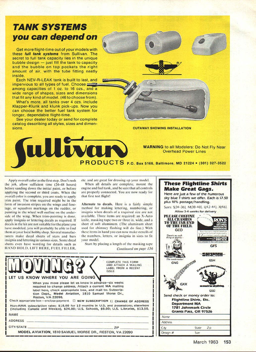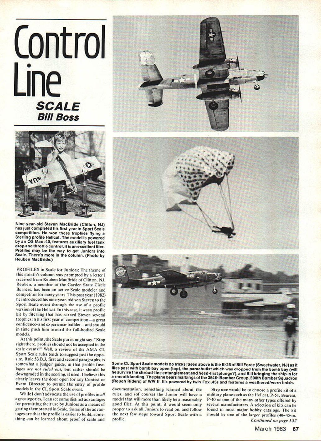 Control Line SCALE Bill Boss PROFILES Scale Juniors theme months column prompted letter received Reuben MacBride Clifton NJ Reuben member Garden State Circle Burners has active Scale modeler competitor years past year 1982 introduced nine-year-old son Steven Sport Scale event through use profile version Hellcat case profile kit Sterling has earned Steven several trophies first year competitiona great confidence- experience-builderand should time push him toward full-bodied Scale models point Scale purist might say Stop right profiles should accepted scale events Well review AMA CL Sport Scale rules tends suggest just oppo site Rule 53B3 first second paragraphs somewhat judges guide profile fuse lages ruled out rather should downgraded scoring used believe clearly leaves door open Contest Event Director permit entry profile models CL Sport Scale event dont advocate use profiles age categories can see some distinct advantages permitting use Juniors means getting started Scale Some advan tages profile easier build some thing can learned about proof scale documentation something learned about rules course Junior will have model will likely reasonably good flier point would seem proper ask Juniors read follow next few steps toward Sport Scale profile Step would choose profile kit military plane such Hellcat P-5 Bearcat P-40 other types offered several manufacturers selection kits can found major hobby catalogs kit should larger profiles 4045-in Continued page 1S2 March 1983 67 Nine-year-old Steven MacBride Clifton NJ has just completed first year Sport Scale competition won trophies flying Sterling profile Hellcat model powered OS Max 40 features auxiliary fuel tank drop throttle control excellent flier Profiles may way get Juniors Scale Theres column Photo Reuben MacBride Some CL Sport Scale models tricks Seen above B-25 Bill Force Sweetwater NJ flies past bomb bay open top parachutist dropped bomb bay will survive shroud-line entanglement head-first plunge Bill bringing ship smooth landing plane bears markings 354th Bomber Group 500th Bomber Squadron Rough Riders WW II Its powered twin Fox 45s features weathered/worn finish Kits Epoxyglass Mr Gs Products & Supply 1010 Gratiot ox 161 Marysville Michigan 80O 1-31 3-36-3875 40 category down eight 10 Now highly specialized few people spend necessary time equip themselves partici pate competitive basis Mouse Racing have received several letters intcrest modelers want good stable airplane Mouse Racing Nass lam sure will recall heavy wind its rather disastrous results Mouse Racers builder-designer colleagues Vie Garner Mouse per formed flawlessly heavy wind turbu lence has produced some drawings design built 13-year-old son plane flies very well Cox Black Widow engine has excellent stability during inclement windy weather has smooth landing takeoff characteristics Mouse Racing goodies such engine modifica tion kits wheels belleranks flying wire etc can purchased Kustom Krafssmanship Laguna Hills CA Ill publish drawings future column Terry Rimert Baldwin FL has written tome concerning activity Mouse Racing indicates Mouse Racing alive well Jacksonville Fl. has sent mean example latest science technology Jacksonville area took third mid summer contest flown John Kramer can tell little speedster would certainly brighten up Racing circles see photo elsewhere column Johi Ballard llO2 KiobleiriiA Dr. Louis ill/c Y 40223 writing advertisers mention read about Model Aviation CL Scale/Boss Continued page 67 wingspan capable handling 35-cuin engine equipped throttle control size profile also has sufficient space within wing mounting three-line bellerank required operation engine throttle control dont understand make type con trol system installation ask dad experienced fellow modeler help Step two would obtain 3-view drawing plane modeled includes some scale detailing such skin panel outlines over color scheme possibly some structural details Three-view drawings would adequate type project can found Profile series publications color drawings have appeared various modeling magazines past Lets now assume have kit match ing three-views other information feel needed first venture Sport Scale Build plane basic filling sanding stopdo proceed painting now time study scale data three-views decide what details added model Does model require wing guns Should model have radio antenna masts Are going dress up landing gear struts Should wheel-well-cover doors added landing gear struts model requires above external additions point should installed After items have completed study color scheme will know markings insignias belong determine color paints will needed now ready proceed painting 152 Model Aviation THE SAILPLANE CADDY Only Lift Money Can Buy Write free brochure SPO transports sailplanes 2M open class superships fantastic tool gets field/slope easy lift Furniture quality parts precut 1/2 maple plywood Dado cuts ensure quick & accurate joints very strong hooks screws & strap supplied kitWHALE SALE Send S 2995 AMA # pay postage via WHALE HOBBlESINCS r good until 1/12/1983 1201 MCOUFFIE NO 104 HOUSTON TEXAS77019 171352fl3152 Lake Buccaneer$26000 Grumman WidgeonS30000 PSI 5 catalinasA0000 Republic Seahee519500 Ducted Fon RK. TOMMYCAT t/ $9950 THE COSMO $900 $8950 Sp.39 434 Sq Sp.57 420Sq KRESS TECHNOLOGY INC 64SM Lloyd Has5o NY 1743 atO e ~- uartrW Di 55531Jt 91scovet tkle 0ffe WU 0iXdteSes e%Cite~jte LI o tYICfeatuteS devoted s ejs~ ~-dep 1dstO a6teit4ed YOV ~watd Gbet $9/yr $250/copy7106-A CampfieldRd Send free secrets Baltimore MD 21207 TANK #VSTEMS can depend Get flight-time out models full tank aystm Sullivan secret full tank capacity lies unique bubble design fill tank capacity bubble top pockets right amount air tube fitting neatly inside NEV-R-LEAK tank built last impervious types fuel Choose g capacities 1 oz 16 ozs wide range shapes sizes dimensions fit kind model 46 choose Whats tanks over 4 ozs include Klapper-Klunk klunk pick-ups Now can choose better fu