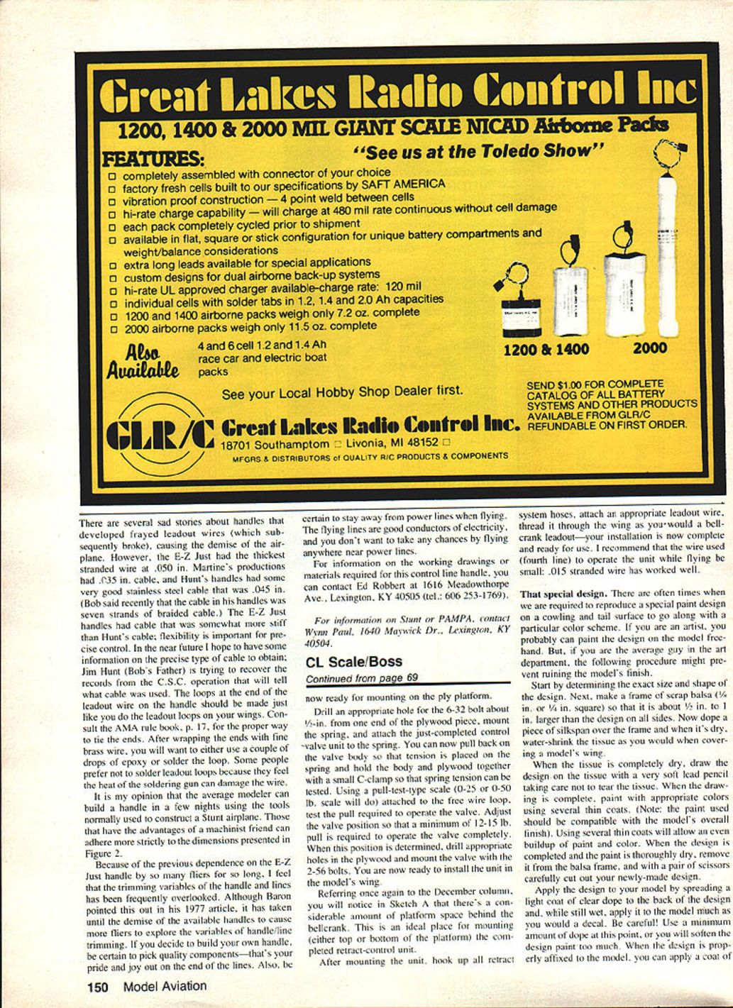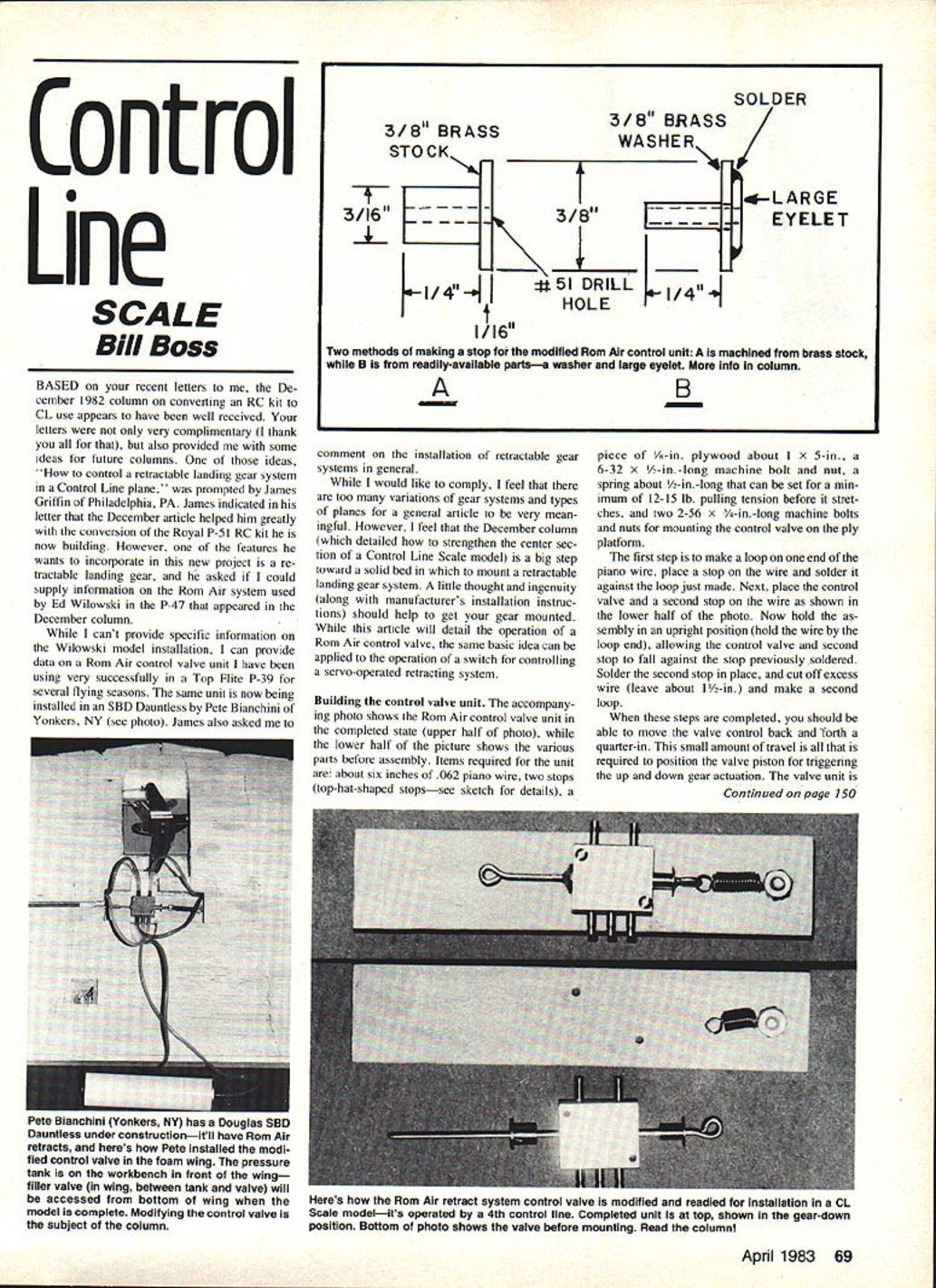 Control Line SCALE Bill Boss BASED recent letters De cember 1982 column convening RC kit CL use appears have well received letters very complimentary thank also provided some ideas future columns ideas control retractable landing gear system Control Line plane prompted James Griffin Philadelphia PA James indicated letter December article helped him greatly conversion Royal P-5 RC kit now building However features wants incorporate new project re tractable landing gear asked could supply information Rom Air system used Ed Wilowski P-47 appeared December column cant provide specific information Wilowski model installation can provide data Rom Air control valve unit have using very successfully Top Flite P-39 several flying seasons same unit now being installed SBD Dauntless Pete Bianchini Yonkers NY see photo James also asked 3/16 ag 3/8 BRASS STO SOLDER 3/8 BRASS WASHER 3/8 LI--EYELET 51 DRILL1/4 HOLE 1/16 Two methods making stop modified Ram Air control unit machined brass stock B readily-available pansa washer large eyelet info column comment installation retractable gear systems general 1 would like comply feel too variations gear systems types planes general article very mean ingful However feel December column detailed strengthen center sec tion Control Line Scale model big step toward solid bed mount retractable landing gear system little thought ingenuity along manufacturers installation instruc tions should help get gear mounted article will detail operation Rom Air control valve same basic idea can applied operation switch controlling servo-operated retracting system Building control valve unit accompany ing photo shows Rom Air control valve unit completed state upper half photo lower half picture shows various parts before assembly Items required unit ar& about six inches 062 piano wire two stops top-hat-shaped stopssee sketch details B piece -in plywood about x 5-in 6-32 x -in -long machine bolt nut spring about -in-long can set min imum 12-15 lb pulling tension before stret ches two 2-56 x 3/4-in-long machine bolts nuts mounting control valve theply platform first step make loop end piano wire place stop wire solder against loop just made Next place control valve second stop wire shown lower half photo Now hold sembly upright position hold wire loop end allowing control valve second stop fall against stop previously soldered Solder second stop place cut off excess wire leave about 1-in make second loop steps completed should able move valve control back forth quarter-in small amount travel required position valve piston triggering up down gear actuation valve unit Continued page 150 April 1983 69 ete uancnini Yonkers NY has Douglas SBD Dauntless under constructionitll have Rom Air retracts heres Pete installed modi fied control valve foam wing pressure tank workbench front wing filler valve wing between tank valve will accessed bottom wing model complete Modifying control valve subject column Heres Rom Air retract system control valve modified readied installation CL Scale modelits operated 4th control line Completed unit top shown gear-down position Bottom photo shows valve before mounting Read column several sad stories about handles developed frayed leadout wires sub sequently broke causing demise air plane However E-Z Just thickest stranded wire 050 Martines productions f35 cable Hunts handles some very good stainless steel cable 045 Bob said recently cable handles seven strands braided cable E-Z Just handles cable somewhat stiff Hunts cable flexibility important pre cise control near future hope have some information precise type cable obtain Jim Hunt Bobs Father trying recover records CSC operation will tell what cable used loops end leadout wire handle should made just like leadout loops wings Con sult AMA rule book p 17 proper way tie ends After wrapping ends fine brass wire will want either use couple drops epoxy solder loop Some people prefer solder leadout loops because feel heat soldering gun can damage wire opinion average modeler can build handle few nights using tools normally used construct Stunt airplane have advantages machinist friend can adhere strictly dimensions presented Figure 2 Because previous dependence E-Z Just handle fliers long feel trimming variables handle lines has frequently overlooked Although Baron pointed out 1977 article has taken until demise available handles cause fliers explore variables handle/line trimming decide build own handle certain pick quality componentsthats pride joy out end lines Also information Stunt PAMPA contact Wynn Paul 1640 Mavwick Dr Lexington KY 40504 CL Scale/Boss Contirtued page 69 now ready mounting ply platform Drill appropriate hole 6-32 bolt about -in end plywood piece mount spring attach just-completed control -valve unit spring can now pull back valve body tension placed spring hold body plywood together small C-clamp spring tension can tested Using pull-test-type scale 0-25 0-50 lb scale will attached free wire loop test pull required operate valve Adjust valve position minimum 12-15 lb pull required operate valve completely position determined drill appropriate holes plywood mount valve 2-56 bolts now ready install unit models wing Referring once again December column will notice Sketch theres con siderable amount platform space behind bellcrank ideal place mounting either tOp bottom platform com pleted retract-control unit After mounting unit hook up retract special design often times required reproduce special paint design cowling tail surface go along particular color scheme artist probably can paint design model free hand average guy art department following procedure might pre vent ruining models finish Start determining exact size shape design Next make frame scrap balsa /x /4 square about er design sides Now dope piece silkspan over frame its dry water-shrink tissue would cover ing models wing tissue completely dry draw design tissue very soft lead pencil taking care tear tissue draw ing complete p