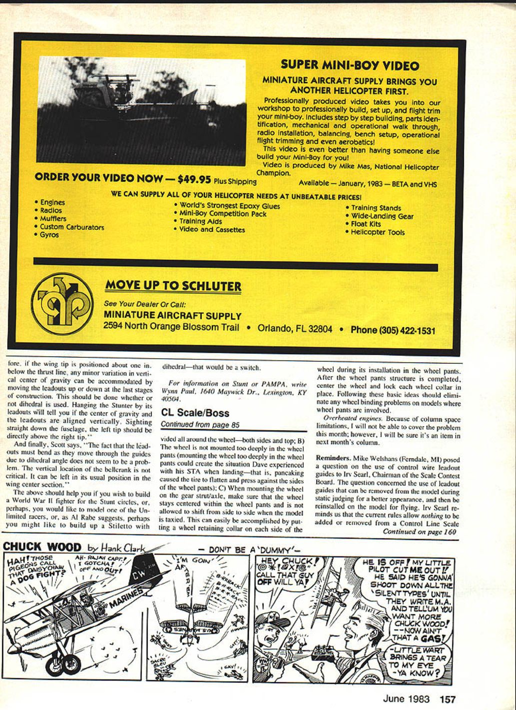 Control Line SCALE Bill Boss BIGGER always betterDave Mullens Seattle WA editor Seattle Skyraiders Newsletter sent report Raiders Round up 1982 Washington State Control Line Championships interest report item shows us still another approach toward Scale competition last years fall meet Skyraiders ran addition regular AMA Scale events local event called Sorta-Scale Dave describes very relaxed form Sport Scale event entries usual large heavy well-powered models have become accustomed seeing local contests Just reverse case heav iest model past years Skyraider Sorta-Scale event 3-lb ME 109 lightest 18-oz P-47 accompanying photos show both planes addition excellent Bucker Jungmeister weighed very heavy 20 oz Flying wires models ranged 35 60 ft Dave pointed out three models shown once again good examples RC kits con verted Control Line use overall object Sorta-Scale event build model apply some outward detail use few operational features make plane fly have fun Back basics tips just happens months tips also came Dave Mullens corresponded about Sorts-Scale event other Seattle Skyraiders activities During ex change letters Dave also told first venture Scale about some problems encountered model Dave chose build Sig Ryan STA rather ambitious project anyone starting Precision Scale Dave said building model presented few problems kit plan details just great plane received high static score its first competition came flying put less sparkling performance Major problems Dave encountered fol low taxiing plane pulled/crabbed outside circle badly inboard wing would dip touch ground eventually cause nose-over 2 landing wheels would pancake lodge against wheel pants would decrease forward motion rather Misalignment wheels landing gear Control Line model can cause poor tracking leads problems during landing takeoff taxiing Theres very good discussion other problems column month rapidly again cause nose-overs 3 Engine would overheat would now like take look problems presented suggest some ways correcting Taxiing problem Dave indicated likely caused problem number setting landing gear model set gear struts such wheels pointed toward outside circle rather straight ahead Doing accented basic problem exists some degree CL models wheels set straight-forward position model leadouts set model properly see December 1982 column bellcrank leadout details wheels pointed dead ahead model should taxiing taking off landing track correctly around circle accompanying sketch illustrates point ing wheels outside circle un necessary Arrow No 1 shows path plane attempts follow wheels straight ahead Arrow No 2 circle path plane actually follows due flying line restric tions As can see wheels set straight ahead very slight amount crabbing will take place isnt enough cause tracking problems will wear tires out wellused model avoid problem sure wheels straight-ahead position gear struts sufficiently strong support models weight Wheel pants order avoid binding wheels models employing wheel pants must make sure following Wheels proper size sufficient clearance proContinued naee 157 June 1983 85 F 2 -p Pete Bergatom built fine P47 House Balsa RC kit Finished model weighed 18 oz TeeDee 051 power flew 35-ft lines though its small has good skin panel outline detail Photo Dave Mullens Max Thues Bucker Jungmeister built Flyline Models kit uses Fuji 09 engine flies 35-ft lines Covering silk Pactra silver dope Throttle control operated via third line spring-loaded second bellcrank Photo Dave Mullens Dan Cronyn built ME-lOg Jemco RC kit Ship weighs 3 lb has 40 engine flies 60-ft lines Finish Pactra dope over silkspan Dave Mullens photo fore wing tip positioned about below thrust line minor variation verti cal center gravity can accommodated moving leadouts up down last stages construction should done whether dihedral used Hanging Stunter its leadouts will tell center gravity leadouts aligned vertically Sighting straight down fuselage left tip should directly above right tip, finally Scott says fact lad outs must bend move through guides due dihedral angle does seem prob lem vertical location bellerank ritical can left its usual position Aling center section above should help you wish build World War II fighter Stunt circles erhaps would like model Un imited racers Al Rabe suggests perhaps ou might like build up Stiletto CL Scale/Boss Continued page 85 vided around wheelboth sides top B wheel mounted too deeply wheel pants mounting wheel too deeply wheel pants could create situation Dave experienced STA landingthat pancaking caused tire flatten press against sides wheel pants C mounting wheel gear strutlaxle make sure wheel stays centered within wheel pants allowed shift side side model taxied can easily accomplished put ting wheel retaining collar side wheel during its installation wheel pants After wheel pants structure completed center wheel lock wheel collar place Following basic ideas should elimi nate wheel binding problems models wheel pants involved Overheated engines Because column space limitations will able cover problem month however will sure its item next months column Reminders Mike Welshans Ferudale MI posed question use control wire leadout guides Irv Searl Chairman Scale Contest Board question concemed use leadout guides can removed model during static judging better appearance reinstalled model flying Irv SearI re minds us current rules allow nothing added removed Control Line Scale Continued page 160 NUCK WOOD I-Junk CIar- DONT BE DUMMY iVmOSeAft- R4JAJi CAprp, 1P Go# Y CIUCHE IS OFFMVLITTLA COTCJ-tA -/N fiMF4Xreao DIJ PIJT&AUiIrF oI AND ' 900j\W~74d,,4 WILLYAP DOWNALLThE /HE SAID HES GONAJA /7I ji/SlLEwTiws UNTIL THEY WR~E MA \\\ /4Il/& AWTELLUMYVU .CHUCK wooD 1983 157 dihedralthat would switch information Stunt PAMPA write Wynn Paul 1640 Maywick Dr Lexington KY 40504 The Best Custom Screen Sportswear Latest Designs Tote Bag gs Corsaji See Us NATS just some avaition designs available top quality line sportswear designs d