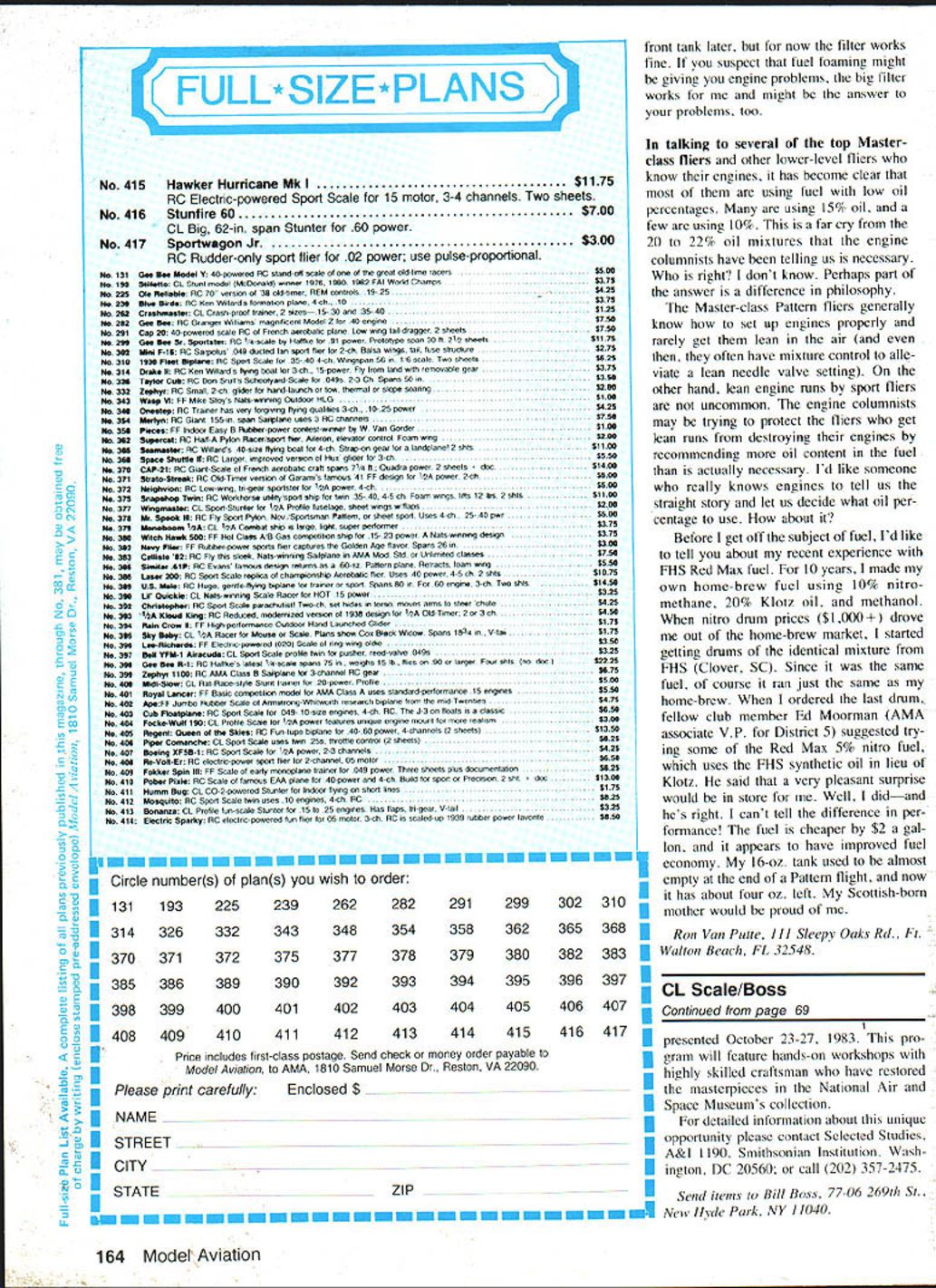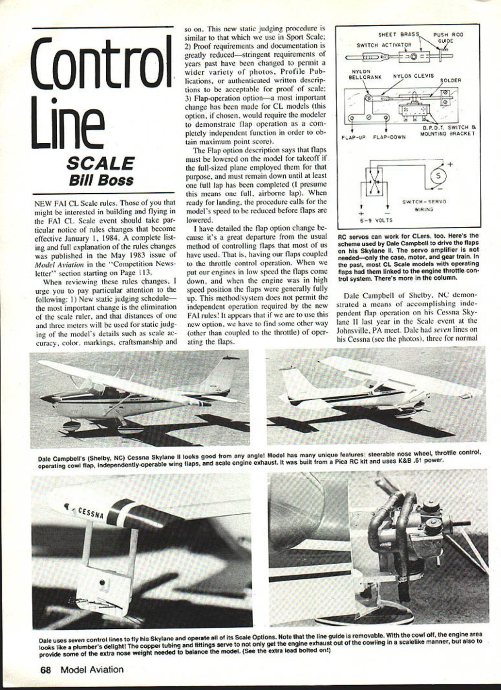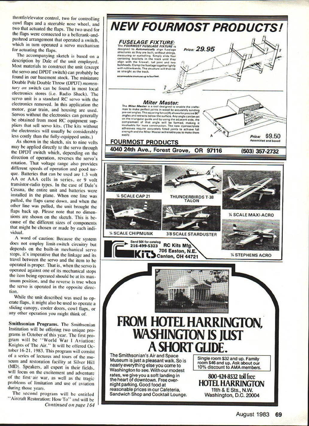 Control Line SCALE Bill Boss NEW FAI CL Scale rules might interested building flying FAI CL Scale event should take par ticular notice rules changes become effective January 1 1984 complete list ing full explanation rules changes published May 1983 issue Model Aviation Competition News letter section starting Page 113 reviewing rules changes urge pay particular attention following 1 New static judging schedule important change elimination scale ruler distances three meters will used static judg ing models details such scale ac curacy color markings craftsmanship new static judging procedure similar use Sport Scale 2 Proof requirements documentation greatly reducedstringent requirements years past have changed permit wider variety photos Profile Pub lications authenticated written descrip tions acceptable proof scale 3 Flap-operation optiona important change has made CL models option chosen would require modeler demonstrate flap operation com pletely independent function order toob tam maximum point score Flap option description says flaps must lowered model takeoff full-sized plane employed purpose must remain down until least full lap has completed presume means full airborne lap ready landing procedure calls models speed reduced before flaps lowered have detailed flap option change cause its great departure usual method controlling flaps us have used having flaps coupled throttle control operation put engines low speed flaps come down engine high speed position flaps generally fully up method/system does permit independent operation required new FAI rules appears use new option have find some other way other coupled throttle oper ating flaps RC servos can work CLers too Heres scheme used Dale Campbell drive flaps Skylane II servo amplifier neededonly case motor gear train past CL Scale models operating flaps linked engine throttlecon trol system Theres column Dale Campbell Shelby NC demon strated means accomplishing inde pendent flap operation Cessna Skylane II last year Scale event Johnsville PA meet Dale seven lines Cessna see photos three normal Dale Campbells Shelby NC Cessna Skylane II looks good angle Model has unique features steerable nose wheel throttle control operating cowl flap independently-Operable wing flaps scale engine exhaust built Pica RC kit uses K&B 61 power Dale uses seven control lines fly Skylane operate its Scale Options Note line guide removable cowl off engine area looks like plumbers delight copper tubing fittings serve get engine exhaust out cowling scalelike manner also provide some extra nose weight needed belance model See extra lead bolted 68 Model Aviation SHEET BRASSPUSH ROD SWITCH ACTIVATORGUIDE flII NYLON BELLCRANKNYLON CLEVIS SOLDER k / 0 0 DPDT SWITCH B FLAP-UPFLAP-DOWNMOUNTING BRACKET ITCH SERVO WIRING 69 VOLTS throttle/elevator control two controlling cowl flaps steerable nose wheel two actuated flaps two used flaps connected bellcrank-and pushrod arrangement operated switch turn operated servo mechanism actuating flaps accompanying sketch based description Dale unit employed Most materials construct unit except servo DPDT switch can probably found basement stock miniature Double Pole Double Throw DPDT momen tary switch can found local electronics stores ie Radio Shack servo unit standard RC servo electronics removed application motor gear train housing used Servos electronics can generally obtained RC equipment sup pliers sell servo kits kits electronics will usually considerably less costly fully-equipped units As shown sketch six nine volts may applied directly servo through DPDT switch depending direction operation reverses servos rotation voltage range also provides different speeds operation good tor que Batteries can used 15 volt AA AAA cells series 9 volt transistor-radio types case Dales Cessna entire unit batteries installed plane line pulled flaps came down other line pulled unit brought flaps back up Please note no dimen sions shown sketch cause different sizes components might chosen made indi vidual word caution Because system does employ limit-switch circuitry depends built-in mechanical servo stops its imperative linkage its travel between servo item operated proper servo operated against its mechanical stops item being operated should its max imum position reverse true servo operated opposite direc tion unit described used op erate flaps might also used operate sliding canopy cooler doors cowl flaps other operation might think Smithsonian Programs Smithsonian Institution will offering two unique pro grams October year first pro gram will 'World War Aviation Knights Air will offered Oc tober 16-21 1983 program will consist series lectures tours mu seum restoration facility Silver Hill MD Speakers expert fields will focus excitement adventure first air war well tragic problems limitation use aviation during years second program will entitled Aircraft Restoration will Continued page 164 PrIce 2995 NEW FOURMOST PRODUCTS V fL / N Miter Master MIter Man, tool designed enable crafts man make perfect joints wood accorately sandiog pro-set angles squaring fenceA allowsforprecisegO angles rotracts below surface Aoy angle can beset triasgolar guide using adjacent side complement angle will formed waking innaloable fo truss construchon new cyanoacrylase adhesines require accurately fitted joints achiene full strength Miter Masterwill eOableyou make easily FOURMOST PRODUCTS 7C Price $950 AssembleS end honed 4040 24th Ave Forest Grove OR 97116503 357-2732 FROM HOTEL HARRINGTON WASHINGTON IS JUST SHORT GLIDE Smithsonians Air Space Museum just pleasant walk So nearly everything else come Washington see modest rates give soft landing heart downtown Free over night parking Good food reasonable prices Cafeteria Sandwich Shop Cocktail Lounge 800-424-8532 toIl fire HOTEL HARRINGTON 11th & E Sts NW Washington DC 20004 FUSELAGE FIXTURE FOURMOST FUSELAGE FIXTURE designed ta AutoonatieIIy align fuselage structures built strings measuring epeballing Simp