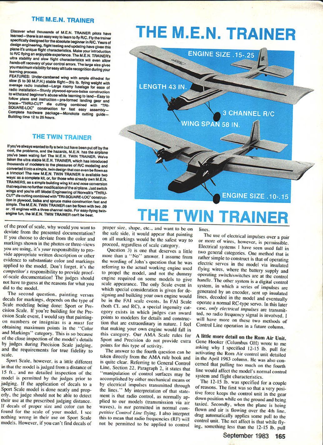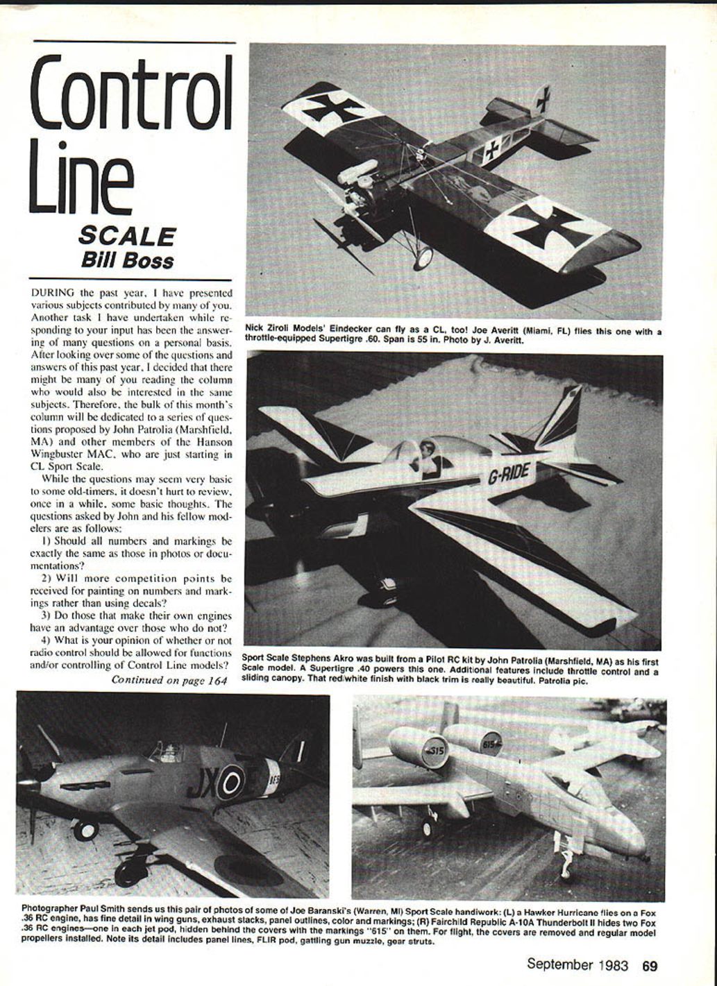 Control Line SCALE Bill Boss DURING past year have presented various subjects contributed Another task have undertaken re sponding input has answer ing questions personal basis After looking over some questions answers past year decided might reading column would also interested same subjects Therefore bulk months column will dedicated series ques tions proposed John Patrolia Marshfield MA other members Hanson Wingbuster MAC just starting CL Sport Scale questions may seem very basic some old-timers doesnt hurt review once some basic thoughts questions asked John fellow mod elers follows I Should numbers markings exactly same photos docu mentations 2 Will competition points received painting numbers mark ings rather using decals 3 Do make own engines have advantage over 4 What opinion whether radio control should allowed functions and/or controlling Control Line models September 1983 69 Nick Ziroli Models Eindecker can fly CL too Joe Averitt Miami FL flies throitle-equipped Supertigre 60 Span 55 Photo J Averitt Sport Scale Stephens Akro built Pilot RC kit John Patrolia Marshfield MA first Scale model Supertigre 40 powers Additional features include throttle control Continued page 164 sliding canopy red/white finish black trim really beautiful Patrolia plc Photographer Paul Smith sends us pair photos some Joe Baranskis Warren Ml Sport Scale handiwork L Hawker Hurricane flies Fox 36 RC engine has fine detail wing guns exhaust stacks panel outlines color markings R Fairchild Republic A-bA Thunderbolt II hides two Fox 36 RC enginesone jet pod hidden behind covers markings 615 flight covers removed regular model propellers installed Note its detail includes panel lines FLIR pod gattling gun muzzle gear struts Designed ZG 74d4ZtA Quik-Ray 500 Designed Quickie 500 events. fast Box-Lok construction . fun fly Wingspan 50 U Engine 19-45 U Wing Area 503 sq U weight 3 lbs ANDREWS AIRCRAFT MODEL COMPANY J% P0 BOX 721 URBANA LLNOS6 80 wx IAiM U sion Great Planes Model Manufacturing Company Aeromaster Tralnermaster Minimaster Sportmaster A-Ray llRay Available local hobby shop would mean one-in tape around outside silver outlines should enough catch overspray save trouble masking off whole plane paint trim says Windy clarification point will have silver airplane color trim letters numbers applied original A-in piece masking tape still silver creates outline trim Windy continues trim dry covered masking tape paper removed one-in tape outside trim borders leaving original A-in tape silver' master Now trim completely masked rest plane silver sprayed final white coat method saved weight double paint surfaces work masking off entire plane spray trim reduced chance tape lifting finish spots Lastly tape removed sanded lightly No 600 paper using Prep-Sol Iso-octane alcohol makes ink lining press-on letter application much easier next trick cover blemishes gas-caps No Steps inkline boxesanything detract flaws Also suggest dark trim finish will perfect dark colors show flaws light colors point used DuPont lmron clear says Windy However some tricks will a9ply regular dope clear finish Windy continues First air brushed trim edges Letrasets build up material avoid rub-through areas buffing After 24 hours ap plied two light wet coats clear dustfree environment let plane sit 48 hours upside down Third Hand handy item manufetured Chuck DeLano 4631 N Mitchner Ave Indianapolis IN 46226 holds plane engine mounts allows turned during painting made dust settle bottom will less noticeable waited month insure full cure wet-sanded entire model flat finish No 600 paper fun began silver polish rubbing compound see much could buffer Finally small delicate areas got done hand ink jogging hand ed exercise Now youre like youll take lots picturesjust caseand show everyone y Executioner about two months finishing pro cess bare wood picture time Windy warns Lets discuss DuPont Im ron some hints anyone using Im ron mixes 3 parts clear part catalyst has pot life 4-8 hours can sprayed easily does get thinned cleans up ordinary lacquer thinner critical factor lmron extremely toxic need wear charcoal respi rator spraying outdoors Spraying charcoal respirator extremely dangerous Wilson DeVillbis both make forced-air respirators use spraying material can use Scott Air Pack avoid inhaling fumes tack time very longup 24 hoursso dust-free environment essential resin-type fin ishes have time start cure feel dry touchthis tack time lmron its usually 24 hours thinner made lmron its neces sary because its viscosity correct spraying buy Third Hand must would unable spray whole plane once found out hard way lmron will go over anything provided surface scuffed No 600 paper first sanding wet Prep-Sol first choice sanding dry wastes too much paper contaminates surface Imron will stick well old dope has cleaned Prep-Sol alcohol wetsanded No 600 paper rough up surface Prep-Sol DuPont generic prod uct No 3919S used auto body work remove silicones finger grease just prior applying paint Iso-octane chemical get Ken Purzycki super degreaser prepping work before applying paint sanding Prep Sol No 600 paper sufficient want scuff up old material better adhesion can run peeling apply three clear coats lmron will come off just like Saran Wrap sheet Two coats Id recommend material heavy goes thick cer tain let coat cure 24 hours before applying something else typical 650-sq-in-wing ship will gain oz clear coat sprayed touch-up gun someone good touch inexperienced could add about 1 /2 oz per coat Wynn Paul would about three oz per coat Thanks Windy discourse painting Windy Urt nowski 9 Union Ave Little Ferry NJ 07643 Tel 201/440-0905 will continue two articles Its great material will big help us information stunt PAMPA con tact Wynn Paul 1640 Maywick Dr Lex ington KY 40504 CL Scale/Boss Continued page 69 Before getting specific questions let state answers am about give based various factors own personal expedriences CL Scale what have observed competitor judge appropr