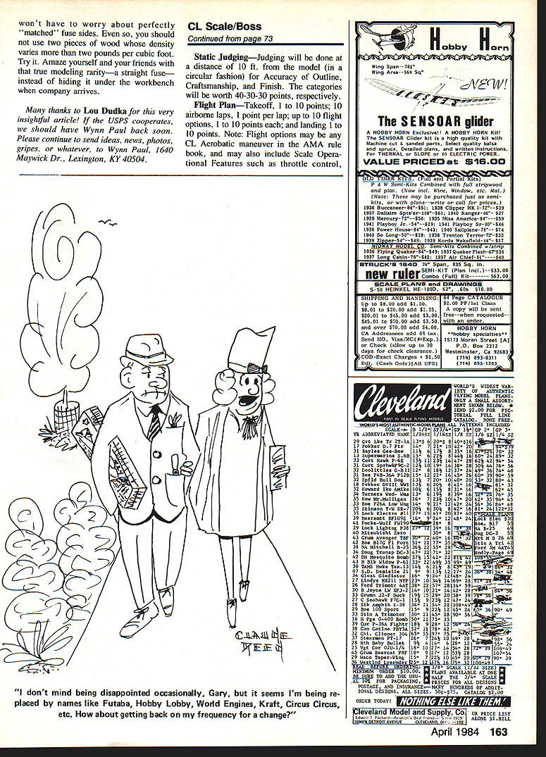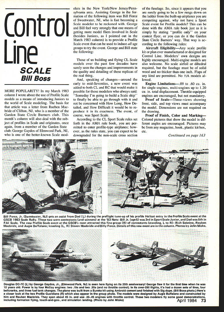 Control Line SCALE Bill Boss MORE POPULARITY March 1983 column wrote about use Profile Scale models means introducing Juniors world Scale modeling basis article letter Rueben Mac bride Clifton NJ member Garden State Circle Burners club months column will also deal sub ject profiles Scale originates once again member Garden State club George Gaydos Elmwood Park NJ better-known Scale modelers New YorklNew Jersey/Penn sylvania area Assisting George mation following item Bill Force Sweetwater NJ fast becoming Scale modeler reckoned George Bill feel very strongly means getting model fliers involved Scale besides Juniors pointed out March 1983 column provide Profile Scale event can used induce age groups try event George Bill state following us building flying CL Scale models over past few decades have surely seen changes improvements quality detailing replicas real thing speaking changesaround early mid-Seventies new event added both CL RC would make possible modelers always said Someday Im going build Scale ship finally able go through concerned Long De tailed Difficult would re produce its exactness event course Sport Scale According CL Sport Scale rules set forth AMA rule book per mitted enter profile-type airplanes ever rules state can expect downgraded non-scale cross section fuselage So since appears surely going few rungs down ladder built-up airplanes competing against have Sport Scale event Profile models can done AMA rule book just simply stating profile contest flyer can Garden State Circle Burners way way ac cording following rules Aircraft EligibilityAny scale profile kit plan ever manufactured designed Control Line Modelers own designs highly encouraged Multi-engine models also welcome No scale airfoil dihedral required fuselage must solid wood no thicker inch Flaps kind permitted No models al lowed Engine Limitations09 60 cu single engines multi-engines up 120 cu total displacement Throttle-equipped engines encouraged mandatory Proof ScaleThree-views showing front side top views must accompany model Dimensions required drawing Proof Finish Color Marking Colored pictures show model dif ferent angles encouraged Pictures may magazine book plastic kit box etc Continued page 163 Bill 1-orce Jr iweetwater NJ gets assist Uad IL during preflight tune-up ot nis profile Hellcat entry Profile Scale event GSCB 1983 Scale Rally two contestants land winners 83 Nats Bill Jr age5 was3rd inSportScaleJuniorandDadwas5thin FAI Scale new Profile Scale event GSCBs meet attracted fine group IR contestants standing L RI Rich Sobrino Reuben Macbride Augie Buffalano kneeling L RI Steven Macbride Billy Force Details new event column Photos John Miske Douglas DC-7C L George Gaydos Jr Elmwood Park NJ seen flying its 25th anniversary George flew first time 12 years old Power four McCoy engines two 195 two 35s no throttle control Its over-250 flights its dozen sets tires four belicranks three fuel tank changes plane built Eureka kit using Ambroid cement finished Sig dope Bill Boss photo Heres closer look two Profile Guardians R also appear group photo models designed Augie Buffalano constructed him Reuben Macbride span about 45 use 35-45 engines throttle control two modelers fly some good demonstrations including formation flying touch-and-gos- simulation landing Photo John Miske April 1 984 73 0-o CD p 0 o _ • m CD 0 o i2 04 rn o m Ou 0 CD- 0 . C CD CD mmCD CD44 04 44j C C 04 04CD Jo00040000044fl044O4444000.00004400440400000000410 0 4400Oboooow0roooowozr0 0row-4 0000004w00 44 wC000.- 404400004 0 00 noooo-o4 r44004141t-nono -0044440L.40oa Qr-00 50o0 0440OWOOfrO 0 04 400nO40 04 004 0 0 00 o44Z4441000a- 4 oar44 on..0300 I443j OOO 00 0t440o-414Ooflt44403000 000to4o--o444 0044.Z-0r-.o0-OooQoro 440 400 4 0400 440 -44440444 04o 0 44o410404r 0 C04-oO..-oo0O- 444 0004-wO 0W44O 4 OS0 I 044-to- 4440400 04104it1404t4r40404.44-0C 00rn 04000404 0040 40000444- 4-400t--44t41C0 004N44-L44o- 0 400440040044 2 4n~S4s4 0N -04.04444 0444444 44oO044444 04044 0344 L0040000 04u00-0w0440 $4440444~t NIt044t4444Jt~ 443 101444444444 0 t44NN44NNt40NONNNN44N Aj44004040404ANNN40010404044 NO40404404 4444404r-4-40040444ow04eeNwcwN4.o N N NO44040400@inNooNowooea44flOoo 4444 A44444044444 4004W-4-$-UI4440-04$-& 044-040 0444 0 ~ 40044N44-J400tn.10404oO Nt0404 0 4 0344-4004004-JNJ -0040404004#000404004 N4444004440 400oon1044-00 4-04NNO044 4444G40Il4\4oZ0~414-414 4-rI040 4004 oOzrZ4 ONWIs 4-44444 11 NO bN4-N EOto 440O1t44144 4-040-J040040J-4400-4 004 44 4- OCCI 444o0N44N4-4-O4N-094-044-400 AI4N LYhPY.-o~4JL4-04444t0 OS p44II~ 4-4-4-4444NW400044-N4-N4*4 00044 444 00 4400-00C0 4 o0~04440 44-440004-040 -44 00004 44444444440 0 4-1 4400 44OOo0ooo z 0 044 0 001 444044N Sr 444 4-4 4404-44 t4440Z 0 000444 000040 0 44o 47 400 z 04 w- 00 0 444444 44044 4O40444 -0 0 44 4 0-44 i 4 040 44 144 r ofli 04 401 m2 4- 03 4440 U ID 4 0 04 4444444-V 0 j44 4 -r 44 1444 oi44 o o 0 000 44444 -40 0 000 L 00 0 44 0044 004 00 4-0 IC 4040444C 0000-4044---0 0 N0tt44004o 0] 444 0000 44044 0 044044 44 400 4 0 440444- 44 444e 4 0444 ~ 0 44440 400 44444 4 00 (4440044410 0 N c-. - o o- 0 -0 o 0 - 0440 0- 0 - 004 0 0 2 2 - 0 0 o 4 0400044 ~ 0- s~o~ 0 j 00- 0 0 00 oQ0 04 4440 0 m440 ID . 14 440 4% ~0444c C4 o 000K 44 0 40 4414 U ~a-m _ o4- 0 0 0 5 Hi Im ART GROSS know some have wondering WHAT IN HELL IS WEDGE LOCK Well will tell hand sanding block made out HIGH IMPACT STYREMEIF IT EVER BREAKS WE WILL REPLACE IT FREE uses belts same size 3x18 Electric Hand Sanders might ask WHY use expensive belts instead using cheaper sandpaper block sanding WHY BECAUSE BELTS ARE MORE DEPENDABLE ECONOMICAL DURABLE AND EASIER TO USE glueing tacking clamping pieces sandpaper other block BELT WILL NOT SLIP WRINKLE OR TEAR CAUSING THE MARKING AND GOUGING OF YOUR FINISHED WORK 1-RESIN BONDED BELT WILL GIVE YOU AT LESS COST MORE TROUBLE FREE SANDING THAN 10 sheets regular sandpaper sandpaper sanding block can waste up 440/0 its sandpaper just fasten itself block BELTS ARE EASILY CHANGED THEY ARE PUT ON