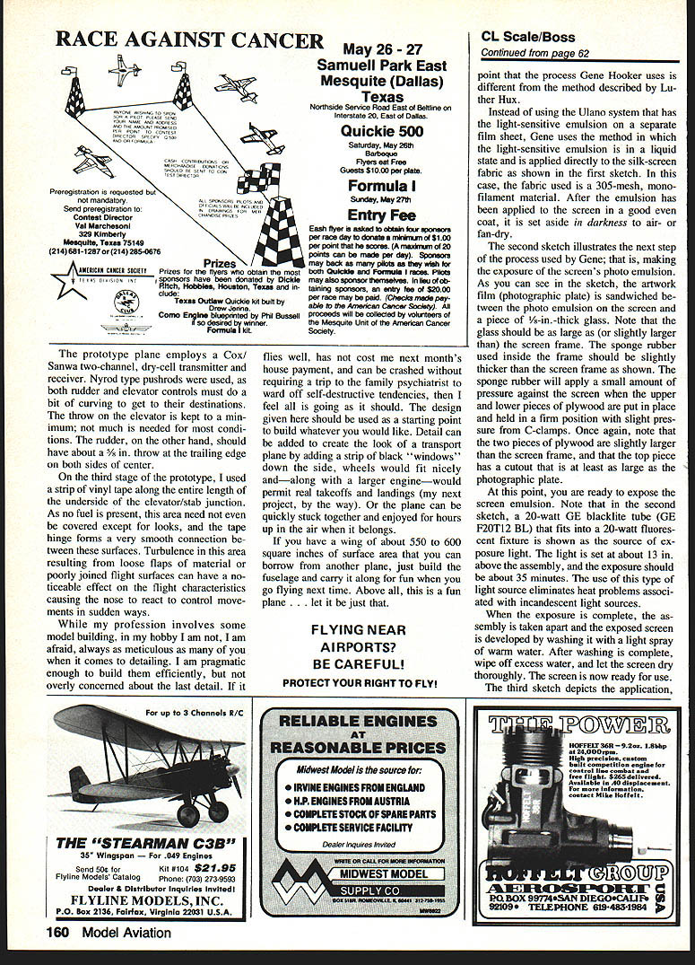 Control Line SCALE Bill Boss DURING past few months have items various MA columns con cerned reproduction placards logos insignias various sizes let tering application Scale model aircraft April issue Model Avi ation feature article Luther Hux de tailed silk-screening process can used making difficult-to-find odd-sized insignias lettering Gene Hooker Columbus OH has making providing special insignia logo decals plastic Scale modelers SKETCH- IRLAtKLITF J past few years also uses silk-screening process make product Gene wrote about process uses thought others might interested because differences between method described Huxs article As silk-screen processes must start basic artwork Gene indi cates obtains suitable printed material also produces much projecting 35mm slides good flat surface tracing images desired latter method will allow make projected images size wish ad justing distance between pro jector image surface satisfied exact size artwork can adjusted having passed through photocopier capable reducing enlarging images artwork completed must converted fullsize black white positive transparency what better known photographic plate reduction enlarging artwork production photo graphic plate can usually done local printing shop fee should very high After photographic plate obtained next step prepare silk screen making frame stretching fabric same manner detailed eralier MA article Remember frame must least couple inches larger sides images reproduced Continued page 160 Y FILM "I SPONGE NUDGER pm' SKETCH 2 SKETCH3 Hems detail Gone Hookers silk-screen technique sketches wont make much sense until read description process months column 62 Model Aviation Lettering insignia decais plastic scale models work Gene Hooker Columbus OH slik-screen process easiiy learned can used produce hard-to-find markings fiying scaic project Theres iota info column Hooker photo z -J C U functional modelits used attention-getter Landing Strip shop Gimbels Department Store New York City sort-of Sopwith Camei spans 16 ft has wing chord 3 ft giving 96 sq ft wing area 12 ft long covering yellow fabric Scale details inciude nine-cylinder rotary engine machine gun Landing Strip sells men aviator leather jackets etc Photo William L Ballinger RACE AGAINST CANCER May 26-27 Samuell Park East Mesquite Dallas Texas Notihaide Seivice Road East Belt line Interstate 20 East Dallas 500 Siry 26th CAS~ CONTR8TONS OR Flyers eat Free Guests $1000 per plate Formula Preregistration requested mandatory0 SOSOR day May 27th Send preregistration Contest DirectorO000OSR RRZRS Entry Fee Eash flyer m asked fa otsain fair qioneors per race day kt donate mlnbman $100 Mesquite Texas 75140per point socres maxkman 20 214681-1287or214286-0676points cert mede per dey Sponsors may bade may plots elalt far ANtIICAN CANCCI Stclttt Prizes ftyers obtain both Qulcate end Foneula ia Pilots oorisors have donated Dickiemsyalsosponeorthamaelvea inheuofob Flitch Hobbles Houston Texas in-taining sponsors 1 enty fee $2000 dudeper race may paid Checks made Par Texas Outlaw Quickie kit built bysbde ican Cancer Society Drew Jermna Como Enaine blueprinted Phil Bussell proceeds will collected volunteers desired bjv winnerthe Mesquite Unit Aniencan Cancer Society prototype plane employs Coxi Sanwa two-channel dry-cell transmitter receiver Nyrod type pushrods used both rudder elevator controls must bit curving get destinations throw elevator kept mm imum much needed condi tions rudder other hand should have about /s throw trailing edge both sides center third stage prototype used strip vinyl tape along entire length underside elevator/stab junction As no fuel present area need covered except looks tape hinge forms very smooth connection tween surfaces Turbulence area resulting loose flaps material poorly joined flight surfaces can have no ticeable effect flight characteristics causing nose react control move ments sudden ways profession involves some model building hobby am am afraid always meticulous comes detailing am pragmatic enough build efficiently overly concerned about last detail ll C flies well has cost next months house payment can crashed requiring trip family psychiatrist ward off self-destructive tendencies feel going should design given should used starting point build whatever would like Detail can added create look transport plane adding strip black windowss down side wheels would fit nicely andalong larger enginewould permit real takeoffs landings next project way plane can quickly stuck together enjoyed hours up air belongs have wing about 550 600 square inches surface area can borrow another plane just build fuselage carry along fun go flying next time Above fun plane t just FLYING NEAR Al RPORTS BE CAREFUL CL Scale/Boss Continued oaae 62 point process Gene Hooker uses different method described Lu ther Hux Instead using Ulano system has light-sensitive emulsion separate film sheet Gene uses method light-sensitive emulsion liquid state applied directly silk-screen fabric shown first sketch case fabric used 305-mesh monofilament material After emulsion has applied screen good coat set aside darkness air- fan-dry second sketch illustrates next step process used Gene making exposure screens photo emulsion As can see sketch artwork film photographic plate sandwiched tween photo emulsion screen piece 1/s-in-thick glass Note glass should large slightly larger screen frame sponge rubber used inside frame should slightly thicker screen frame shown sponge rubber will apply small amount pressure against screen upper lower pieces plywood put place held firm position slight pres sure C-clamps Once again note two pieces plywood slightly larger screen frame top piece has cutout least large photographic plate point ready expose screen emulsion Note second sketch 20-watt GE blacklite tube GE F20T12 BL fits 20-watt fluores cent fixture shown source ex posure light light set about 13 above assembly exposure should about 35 minutes use type light source eliminat