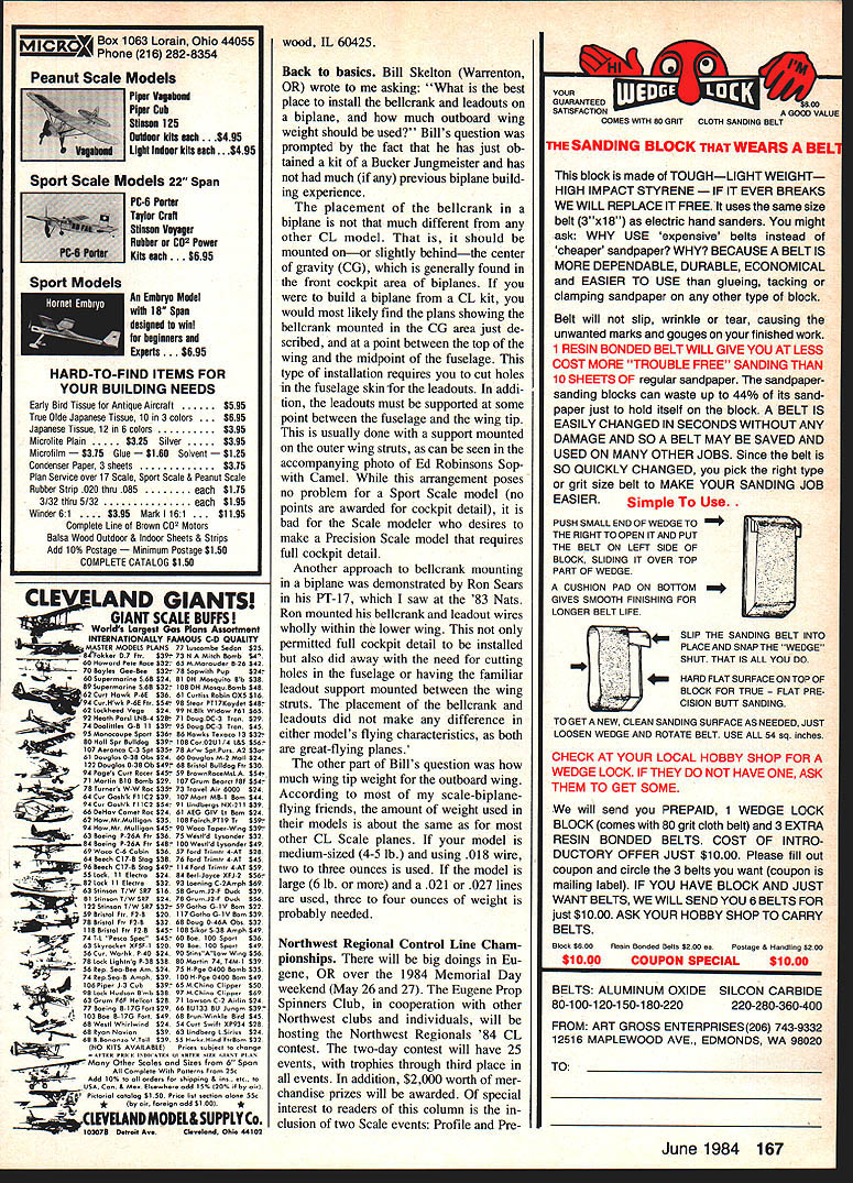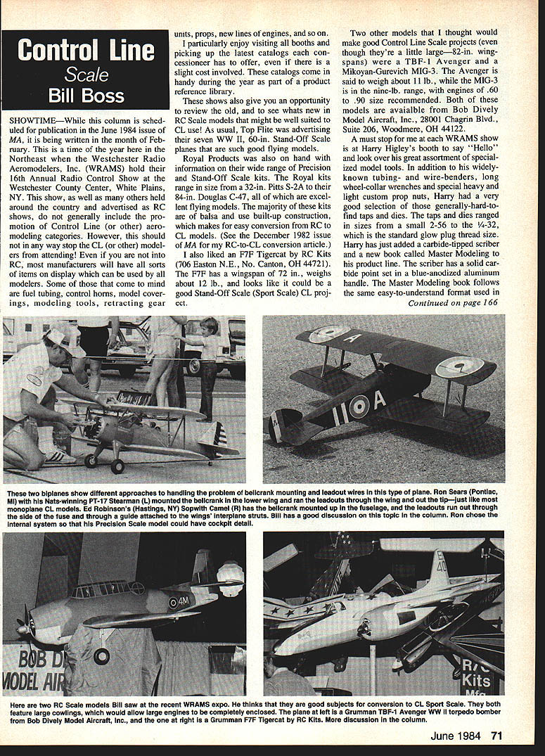 SHOWTIMEWhile column sched uled publication June 1984 issue MA being written month Feb mary time year Northeast Westchester Radio Aeromodelers Inc WRAMS hold 16th Annual Radio Control Show Westchester County Center White Plains NY show well others held around country advertised RC shows generally include pro motion Control Line other aero modeling categories However should way stop CL other model ers attending RC manufacturers will have sorts items display can used modelers Some come mind fuel tubing control horns model cover ings modeling tools retracting gear units props new lines engines particularly enjoy visiting booths picking up latest catalogs con cessioneer has offer slight cost involved catalogs come handy during year part product reference library shows also give opportunity review old see whats new RC Scale models might well suited CL use As usual Top Flite advertising seven WW II 60-in Stand-Off Scale planes such good flying models Royal Products also hand information wide range Precision Stand-Off Scale kits Royal kits range size 32-in Pitts S-2A 84-in Douglas C-47 excel lent flying models majority kits balsa use built-up construction makes easy conversion RC CL models See December 1982 issue MA RC-to-CL conversion article also liked F7F Tigercat RC Kits 706 Easton NE No Canton OH 44721 F7F has wingspan 72 weighs about 12 lb looks like could good Stand-Off Scale Sport Scale CL proj ect Two other models thought would make good Control Line Scale projects though theyre little large82-in wingspans TBF-l Avenger Mikoyan-Gurevich MIG-3 Avenger said weigh about 11 lb MIG-3 nine-lb range engines 60 90 size recommended Both models avaialble Bob Dively Model Aircraft Inc 28001 Chagrin Blvd Suite 206 Woodmere OH 44122 must stop WRAMS show Harry Higleys booth say Hello look over great assortment special ized model tools addition widelyknown tubing- wire-benders long wheel-collar wrenches special heavy light custom prop nuts Harry very good selection generally-hard-tofind taps dies taps dies ranged sizes small 2-56 -32 standard glow plug thread size Harry has just added carbide-tipped scriber new book called Master Modeling product line scriber has solid car bide point set blue-anodized aluminum handle Master Modeling book follows same easy-to-understand format used Continued page 166 two biplanes show different approaches handling problem belicrank mounting leadout wires type plane Ron Sears Pontiac Ml Nats-winning PT-17 Stearman L mounted beiicrank iower wing ran leadouts through wing out tipjust like monopiane CL models Ed Robinsons Hastings NY Sopwith Camel R has bellcrank mounted up fuseisge leadouts run out through side fuse through guide attached wings interpiane struts Bill has good discussion topic column Ron chose internal system Precision Scaie model could have cockpit detail two RC Scale models Bill saw recent WRAMS expo lie thinks good subjects conversion CL Sport Scale both feature large cowlings would allow large engines completely enclosed plane left Grumman TBF-1 Avenger WW II torpedo bomber Bob Dively Model Aircraft Inc right Grumman F7F Tlgercat RC Kits discussion column June 1984 71 THIS FUEL FEATURES ORUST PREVENTION AGENTS ODETERGENTS SLUBRICAllON WITH HIGH FLASH POINTS WETTING AGENTS FOR MORE EFFICIENT AND DEPENDABLE FUEL FLOW eANTI-FOAMING AGENTS TO PREVENT LEAN RUNS KEEPS YOUR ENGINE RUNNING COOL OAN ODORLESS HIGHLY REFINED FUEL CHILDPROOF LIDS Available FAI 5 10 15 25 & 40% Nitro-Methane Contents Formulated synthetic lubricants Also cNailade castor DEALERS WANTED DOMESTIC & OVERSEAS WE EXPORT This competition fuel fast becoming THE CHOICE vMh top protesionals first cash product Contact us price structures ordering information Manufacturers Major Brand Distributors Model Engines Kits Rodos Accessories SUPER K Fuels brand KINGS RADIO CONTROL HOBBIES INTERNATIONAL 3960 West 16 Ave HIalech Florida 33012 305 557-2024 can made example need firewall positioned 30 downthrust relative centerline fuselage will need set pointer 30 draw lines along pointer wire top gauge along top gauge pointer wire outward template can cut along two lines used guide mounting firewall Several other variations theme possible course depending upon imagination specific needs Hope fully small implements wiH help become accurate consequently bet ter builder model aircraft really what aboutmost time anyway CL Aerobatics/Fancher Continued page 70 speed weight line length diameter air density etc nonetheless true total affect will negligible remotely normal Stunt ship plane properly trimmed leadouts will exit wingtip point three degrees aft center gravity have just located bellcrank pivot plus minus less degree point spar should located tip rib Allow small amount fore aft adjustability pointbut Im willing bet youll end up both leadouts within / inch plotted location Now just draw wing tip choice construction details feel appropriate lets get fun stuffthe fuselage fuselage fun because best place let creativity run rampant Aside locating important pieces right places body like Spinners rudders cowls canopies grist creative mill Lest get carried away however start plotting following convenient horizontal refer ence line usually use top main fuse side spinner backplate 2 Wing leading edge 3 CG 4 Flap hinge line 5 Wing flap trailing edge 6 Stab leading edge 7 Elevator hinge line 8 Elevator trailing edge vertical reference line plot fol lowing locations Engine thrust line 2 Wing centerline Another hint Try keep thrust line wing centerline within 50% wing thickness other Since wing will primary source drag having large distance thrust line will create substantial pitch trim problems 3 Stab centerline 4 Wheel/ground contact point located vertically allow adequate ground clearance largest prop plan use horizontally located respect center gravity Now draw wing stab cutouts let yourself go Just remember anything draw youre going have figure way build reasonable weight last major component top fuselage stab/