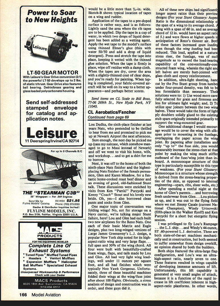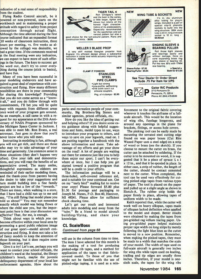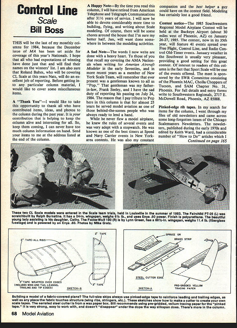 Contml Line Scale Bill Boss THIS will last monthly col umns 1984 because December issue MA has set aside coverage years Nationals hope expectations winning have done just will find names winners list am also sure Roland Baltes will covering CL Scale years Nats will ex cellent job reporting Before getting particular column material would like cover some miscellaneous items Thank YouI would like take opportunity thank have contributed items ideas photos column during past year contribution helping keep column alive interesting So keep coming can never have too much column information hand Send items address listed end column Happy NoteBy time read column will have retired American Telephone Telegraph Communications after 31 /z years service will now able devote considerably time building flying writing about Scale modeling course will some chores around house Im sure better half Jan will want done some between modeling activities Sad NoteThe words now write done heavy heart recall covering AMA Nation als writing Amerian Aircraft Modeler early Seventies recent years member New York Scale Team will remember ever present gentleman known Pop gentleman fatherin-law Frank Seeley have sad duty reporting passing July 24 1984 reason pay tribute Pop column almost 25 years served model aviation behind-the-scenes people always ready lend hand never flew model airplane knew rules several events very adept stopwatch known best timers Speed Navy Carrier events New Yorkarea contests also constant companion best helper guy could have contest field Modeling has certainly lost good friend Contest noticeThe 1985 Southwestern Regional Model Airplane Contest will held Buckeye Airport about 30 miles west Phoenix AZ January 26-27 1985 contest now its 35th year will feature 41 events spread over Free Flight Control Line Radio Con trol Old-Timer events January weather Southwest usually very pleasant providing good setting great contest interest readers col umn fact Sport Scale will events offered meet spon sored SWR Committee consisting Phoenix MAC Cholla Choppers Tucson SAM Chapter No 31 Phoenix full details entry forms write Southwestern Regionals 2717 E McDowell Road Phoenix AZ 85008 Pinked-edge rib tapes search items column went through files old newsletters came across some long-forgotten issues Chicago Scalemasters Newsletters newslet ters published during early 1970s edited Keith Ward considerable number articles Continued ae 165 two CL Scale models entered Scale team trials held Louisville summer 011983 Fairchild PT-26 L scratchbuiit Ralph Burnatine has 54-in wingspan weighs 6 lb uses Enya 60 power Finish polyurethane beautiful young lady assisting daughter Cathy Focke-Wuif 190 R i Lynn Green has 60-in wingspan weIghs 114 lb fiberglass fuselage powered nya 60 Photos Mike Gretz 2 TAPE-ALL RIBS N I- TAPE WRAPPED OVER EDGES INCLUDES WING AND TAIL LEADING TRAILING AND TIP EDGES 2 TAPE 3 TAPE SKETCHB SPRUCE OR C-BRASS STRIP STEEL CUTTER EDGE SKETCHA PRE-GRIDDED VELLUM TRACING PAPER Building modei fabric-covered piano fuil-size ships always use pinkededge tape reinforce leading traiiing edges well piace fabric touches structure wing ribs stringers etc sketches show make cutter create own scale tapes serrated steel cutter wax paper box Bill recommends using pre-gridded vellum tracing paper pinked tape very strong easy work doesnt disappear under dope way silkapan does Theres column 68 Model Aviation ndicative real sense responsibility rom student Flying Radio Control aircraft towered non-powered starts vorkbench maintaining proper Lttitude regard safety project onception through actual flight though time allotted during first ourse indicated expanded format 10 weeks classroom instruction three tours per meeting vs five weeks al owed college desirable tad great time comments received Lt final meeting indication ye can expect have such offer ngs future keys success get word out dont try cover hing during course stick basics md have fun have successful rour modeling endeavors have ac iuired great deal experience con truction flying different tossibilities community sharing knowledge Providing hat come across know t-all follow through ommitments Ill bet will quite tusy requests different areas rnce word program gets around s example call came re luest appearance 25th Anni rersary NASA Program sponsored Michigan Space Center Jackson sras able meet Mr Ron Evans real tstronaut Just goes show youll oever know will meet Instructing modeling fun although rou will get rich ho may try take advantage ime generosity Use common sense hese situations dont happen very ften Give talk demonstra ions will reap benefits ippreciative crowd smiles houghtful expressions oldsters eminded earlier modeling times snd thank-yous parents having desire take suggestions urn model building fine family roject few rewards rhere times walking store hat have child run up ay Im still flying model plane old us about may remember xactly model being flown Arhere child saw impor ant point discussion fective enough Think about ways can ecome effective within local area promoting good public relations image 3f great sportmodel aircraft con ttruction flying does take lot f fancy models keep attention hose listening does require some egwork part Give try Lets see perhaps will want contact school officials childrens ward hospital library childrens hour maybe juvenile delinquency department local law enforcement agencies about TIGER TAIL 4 Ron Chidgeys latest and beat series little larger lighter slower retains honest fliQht character tistica ot its predecessors Especially recommended sportsman ad vanced pattern also good choice turn-around pattern Plans construction hints $995 WELLER 3 BLADE PROP very stiff molded fiberglas propellor England Its efficient design allows substantial reduction noise level actually improving per formance $2000 NEW NEW CLAMP IT FOREVER STAIN LESS STEEL PIPE CLAMPS Lighl strong Low-profile seiflocking 3116 width wont cut silicone co