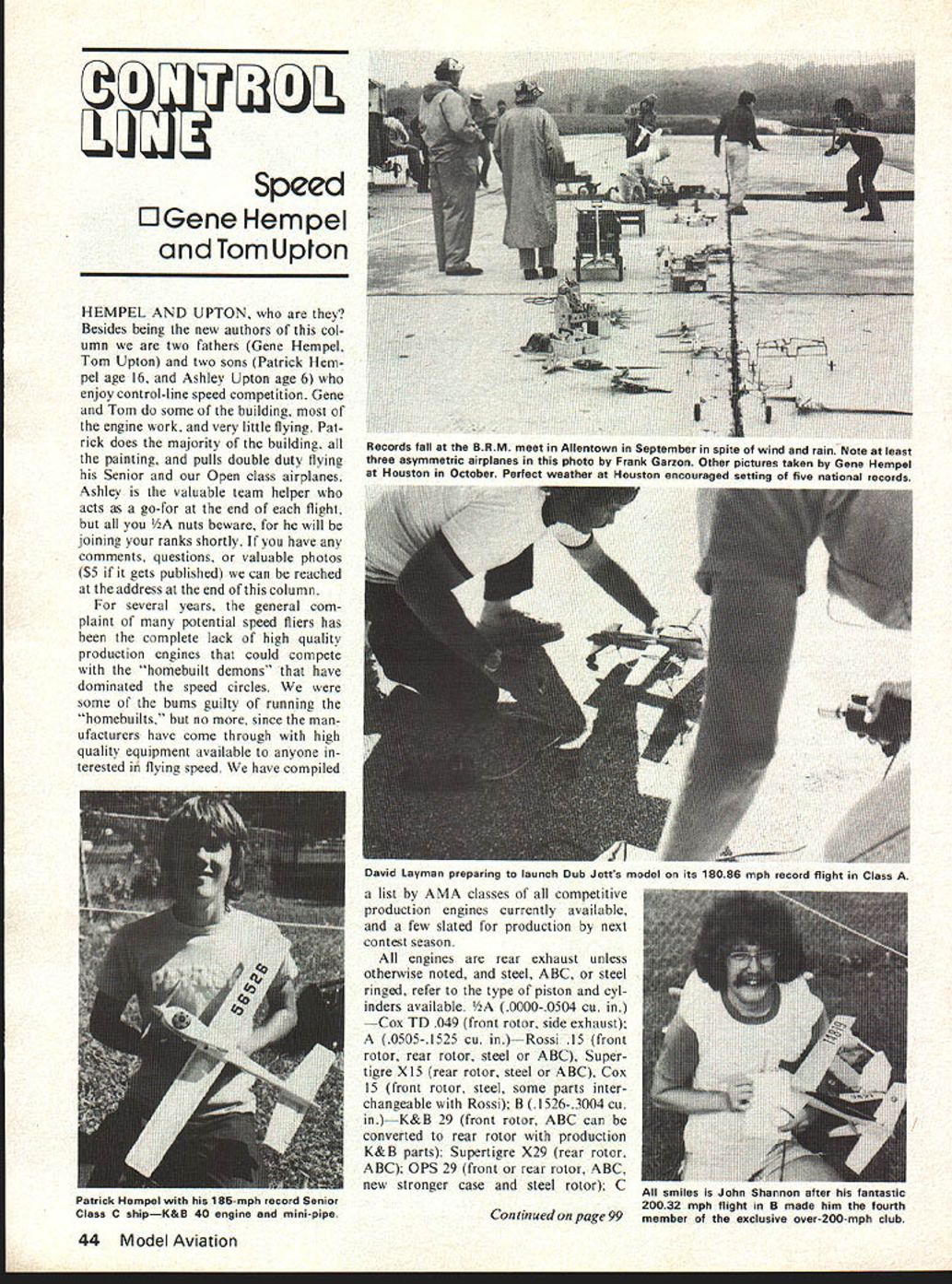 Speed EJGene Hem pel Tom Upton HEMPEL AND UPTON Besides being new authors col umn two fathers Gene Hempel Tom Upton two sons Patrick Hem pel age 16 Ashley Upton age 6 enjoy control-line speed competition Gene Tom some building engine work very little flying Pat rick does majority building painting pulls double duty flying Senior Open class airplanes Ashley valuable team helper acts go-for end flight nuts beware will joining ranks shortly have comments questions valuable photos $5 gets published can reached address end column several years general com plaint potential speed fliers has complete lack high quality production engines could compete homebuilt demons have dominated speed circles some bums guilty running homebuilts no since man ufacturers have come through high quality equipment available anyone terested flying speed have compiled list AMA classes competitive production engines currently available few slated production next contest season engines rear exhaust unless otherwise noted steel ABC steel ringed refer type piston cyl inders available /2A 0000-0504 cu Cox TD 049 front rotor side exhaust 0505- 1525 cu inRossi 15 front rotor rear rotor steel ABC Super tigre XIS rear rotor steel ABC Cox 15 front rotor steel some parts inter changeable Rossi B 1526-3004 cu inK&B 29 front rotor ABC can converted rear rotor production K&B parts Supertigre X29 rear rotor ABC OPS 29 front rear rotor ABC new stronger case steel rotor C Patrick Hempel 185-mph record Senior Class C shipK&B 40 engine mini-pipe Continued page 99 44 Model Aviation Records fall BRM meet Allentown September spite wind rain Note least three asymmetric airplanes photo Frank Garzon Other pictures taken Gene Hempel Houston October Perfect weather Houston encouraged setting five national records David Layman preparing launch Dub Jetts model its 18086 mph record flight Class smiles John Shannon after fantastic 20032 mph flight B made him fourth member exclusive over-200-mph club sitting back Monday night trying enjoy game ignore Cosell same time wheels can use couple small screwdrivers remove tire hub makes much easier sand scratching hub hand like use 3M 220 grit Tri-M-Ite Free-Cut Finishing Paper listed Sig catalog cant find locally yours AMA Scale model judges will close enough touch should sand tire again lightly 360 finer grit paper take out obvious scratch marks wont too can see tire photo sanded 220 Most commercial model wheels PB Aeroscale Robart Goldberg new Fox styles name few have molded tire high gloss finish under standable selling product since looks great package types model airplanes Texas Scale Championships held Abilene included CL FF RC scale events exciting success According Jerry Farr combined contests work very well fly UC FF RC scale same field something see Watch next years con test calender 78 going have two days worth Scale Grapevine AMA museum class scale whatever have calling since advent Sport Scale will referred 78-79 rule book Precision Scale action Scale Board Scale Board also adopted rules proposal cycle will allow unlisted flight options necessarily mechanical required before per formed CL Precision Scale Hmmm about P-5l doing Bob Hoover style one-wheel landing annual FAI meeting Paris will already have taken place time read may discuss including FF Scale next WC Proposed US annual FAI meeting Paris will already have taken place time read may discuss including FF Scale next WC Proposed US Mike Stott perennial Nats WC CL Scale ace former editor column taking breather lately keeping busy building large scale display boats Kayot Corp dont count Mike out hell likely come up full slate options turn up 78 Nats Mike Gretz Box 162 Montezuma IA 50171 CL Speed/Hempel/Upton continued page 44 5oIa GIothFilm HOT FUEL PROOF DOPEEXCLUSIVE LOW HEAT AWARD WINNINGCOVERING FOR HIGLOSS AND FLATFOAM & BAtSA FINISHES AVAILABLEFLYING MODELS IN OVER 36 COLORSflexible ble IN BRUSH AND SPRAYfuel pruaf Iightweigbt pflCflH Industries Inc 7060 HOLLYWOOD BLVD. LOS ANGELES CA 90028 rear rotor ABC Supertigre X40 rear rotor ABC OPS 40 front rear rotor ABC 05 Max 40 front rear rotor steel ringed side exhaust HP 40 front rear rotor steel ringed side exhaust D 30056500 cu inOPS 60 rear rotor ABC has new stronger front housing rod backplate assembly OS Max 65 rear rotor side exhaust steel ringed Rossi 65 rear rotor ABC available sometime Spring cannot find engines local hobby shop try following sources Cox Kustom Kraftsmanship PO Box 2699 Laguna Hills CA 92653 Rossi Bills Miniature Engines 1325 Carol Dr Memphis TN 38116 Supertigre & 05 Max World Engines 8960 Rossash Ave Cincinnati OH 45236 HPMidwest Models 6926 West 59th St Chicago IL 60638 OPS K&B Shamrock Com petition Imports PO Box 26247 New Orleans LA 70186 K&B K&B Manufacturing 12152 5 Woodruff Ave Downey CA 90241 know just what some doubt ing Thomas types saying Sure sure production engines will never compete homebuilt monsters completely rebuilding Yes will examples suc cess some people have recently David Layman 5600 N Freeway Apt 102 Houston TX 77076 Dub Jett February 1978 99 TRY THESE OTHER CONTEST QUALITY PRODUCTS PROM PACTRA 3005-4000 cu Formula 40 2800-4000 cu inK&B 40 front CATALOG 25c DAVIS 22 D-IKPLAN 1 CSD-7BY Chas E Steinchak MODERNISTIC MODELS PO B0X6974ALBUQNM87107, KITS S 0 ACCESSORIES BABY ACEP-N UT KITS N BEARINGS BROWN CO-2 ENGINES RE AL JAPANESE TISSUE-PROPS I17 SPAN 4COMPLETE CATALOG 50q IKIT $425MANY HARD TO FIND ITEMS Pee*-haw BOX 2493LA MESA CALIF 92041 4720 Ashbrook Rd Dallas TX have turned 18011 18086 mph respectively stock ST X-15s except chromed liners new heads Dub will chrome fit liners about $18 David will other work Brent Bussell Dallas TX has turned 186 stock X-29 understand Nick Shear 815 Beech Rd Langhorne PA 19047 has done 188 Patrick Hempel holds Senior B record 19264 mph practically stock K&B 40 mini-pipe Charley Anaston Dallas TX has turned 161-mph Formula 40 time very stock X40 could back up record hold Formula 40 record aK&B4ORRat 161
