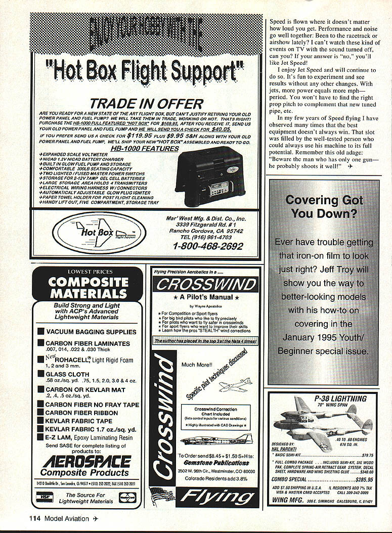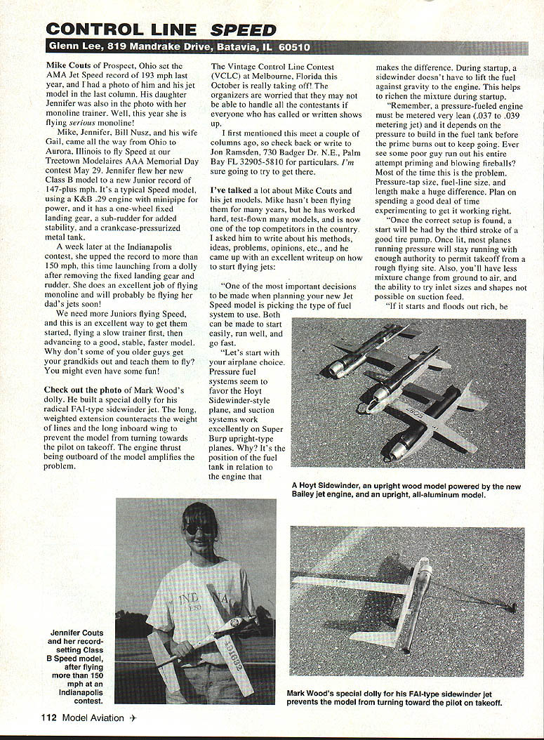 CONTROL LINE SPEED Mike Couts Prospect Ohio set AMA Jet Speed record 193 mph last year photo him jet model last column daughter Jennifer also photo monoline trainer Well year flying serious monoline Mike Jennifer Bill Nusz wife Gail came way Ohio Aurora Illinois fly Speed Treetown Modelaires AAA Memorial Day contest May 29 Jennifer flew new Class B model new Junior record 147-plus mph Its typical Speed model using K&B 29 engine minipipe power has one-wheel fixed landing gear sub-rudder added stability crankcase-pressurized metal tank week later Indianapolis contest upped record 150 mph time launching dolly after removing fixed landing gear rudder does excellent job flying monoline will probably flying dads jets soon need Juniors flying Speed excellent way get started flying slow trainer first advancing good stable faster model dont some older guys get grandkids out teach fly might have some fun Check out photo Mark Woods dolly built special dolly radical FAI-type sidewinder jet long weighted extension counteracts weight lines long inboard wing prevent model turning towards pilot takeoff engine thrust being outboard model amplifies problem Jennifer Couts record setting Class B Speed model after flying 150 mph Indianapolis contest Vintage Control Line Contest VCLC Melbourne Florida October really taking off organizers worried may able handle contestants everyone has called written shows up first mentioned meet couple columns ago check back write Jon Ramsden 730 Badger Dr NE Palm Bay FL 32905-58 10 particulars Im sure going try get Ive talked lot about Mike Couts jet models Mike hasnt flying years has worked hard test-flown models now top competitors country asked him write about methods ideas problems opinions etc came up excellent writeup start flying jets important decisions made planning new Jet Speed model picking type fuel system use Both can made start easily run well go fast Lets start airplane choice Pressure fuel systems seem favor Hoyt Sidewinder-style plane suction systems work excellently Super Burp upright-type planes Its position fuel tank relation engine makes difference During startup sidewinder doesnt have lift fuel against gravity engine helps richen mixture during startup Remember pressure-fueled engine must metered very lean 037 039 metering jet depends pressure build fuel tank before prime burns out keep going Ever see some poor guy run out entire attempt priming blowing fireballs Most time problem Pressure-tap size fuel-line size length make huge difference Plan spending good deal time experimenting get working right Once correct setup found start will third stroke good tire pump Once lit planes running pressure will stay running enough authority permit takeoff rough flying site Also youll have less mixture change ground air ability try inlet sizes shapes possible suction feed starts floods out rich 112 Model Aviation Sidewinder upright wood model powered new Bailey jet engine upright all-aluminum model Mark Woods special dolly FAI-type sidewinder jet prevents model turning toward pilot takeoff ready put out small fire Because pressurized air space fuel tank will continue force fuel back hot tailpipe ignite [Note G Lee- put fire out just tip nose letup let burning fuel run out little no chance explosion just have afew seconds offire Merle Hoyt showed trick] Now lets look upright model pure suction feed Major differences include true venturi-shaped inlet flowjector holes drilled larger located minimum ID venturi much larger metering jet 055 075 uniflow-type fuel tank larger passages make much easier draw fuel tire pump air tank No priming required being correct first-try starts can time Any pilot standing ready take skid launch can really appreciate Fire rare stops running does flow fuel Engine placement regard centrifugal feed critical Suction easy get right ground difficult air Metering jet selection wider much less critical considered feel suction system user-friendly bit less trouble tune good speed advice aspiring new jet flier try suction system first learn practice basics operation tuning try sidewinder-style plane new high-performance engines Both systems capable record performance both can made operate reliably both will fun Let add few general comments about Jet Speed Some non-Speed fliers dont know much about jets meet fliers take few minutes explain jet fly Jets noisy may intimidate some people find may safest powered models No torque no vibration shake things loose no props fly apart cut fingers Sure noise can problem UNIVERSAL STRAP ON older engines muffler bolts 29-45 JT-4OP $2595 51-61 JT-60P $2795 MOKI 61 JT-MK61 P $2995 Pitts-Style Mufflers UNIVERSAL BOLT ON aide mounted engines Will fit 90% moat engines made after 1959 Easytoto JT-A91PASP 108$3295 JT-F74PFOX 74$3395 JT-M1OaPMAX 91-108$3595 JT-BGXPMAX BOXI$3695 JT-ST69PST 617590$3395 JT-5T25PST 25-3000$3595 JT-MK15OPMOKI 15$3695 JT-W12OPWEBRA 1 20 $3395 /7TEU $3195 ExhaUst extensionsMAIL ORDER Please add $400 br UPS worm drive andshipping check MO Visa MC coo mountIng StlI2accepted Add $480 eaira br COD IncludedCalilornia residents add 8% sales lax CHE 31 Light Stone- RAt RCAF Sand Yellow Germany Tan USAAF FS#20400 CHE 32 Middleolose USAAF Tan-IJapan Mid Stone RAF RCAF FS#30266 CHE 33 Dark Earth IJSAAF RAF RCAF FS#30 118 CHE 34 Blue Germany FS#26329 CHE 35 Azure Blue USAAF RAP RCAF Germany FS#35231 CHE 36 Grey Japan FS#36492 CItE 37 Extra Dark Sea Grey RAt 8CM Neutral Grey USAAF FS#36118 CHE 38 Light State Grey RAt RCAF Green Grey Germany P5134 159 CHE3S Dark Slate Grey RAP RCAF Army Green- Japan P5134098 Perfect Paint high quality part fuel proof paint combines conveni ence superb results Perfect Paint will cover dopes epoxies 5V metals fiberglass plastic hi smooth hard mar resistant finish will crack chip CHE4O Dk Green & Extra Ok Sea Green RAF RCAP Dark Green Germany P5134079 CHEAi Navy Green Japan P5134058 CHE 42 Olive Drab USAAt 595 Original P5134087 CHE 43 Dead Flat Clear 0% gloss CHE 44 Sea Blu