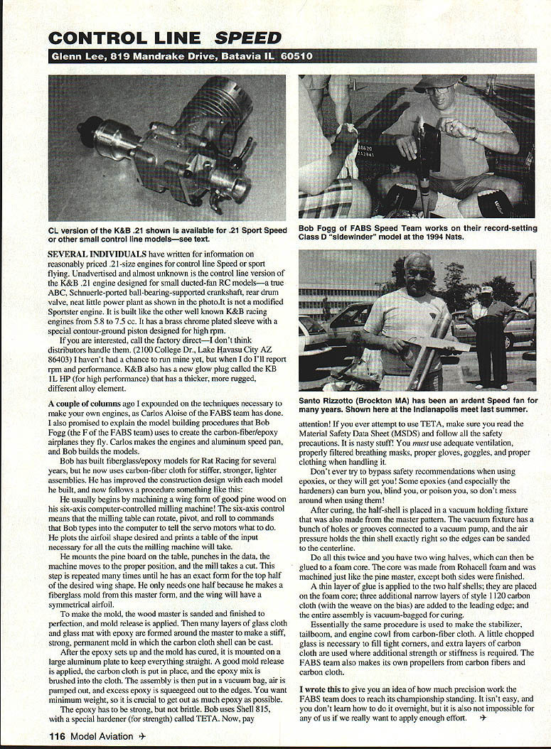 CONTROL LINE SPEED SEVERAL INDIVIDUALS have written information reasonably priced 21-size engines control line Speed sport flying Unadvertised almost unknown control line version K&B 21 engine designed small ducted-fan RC modelsa true ABC Schnuerle-ported ball-bearing-supported crankshaft rear drum valve neat little power plant shown photoIt modified Sportster engine built like other well known K&B racing engines 58 75 cc has brass chrome plated sleeve special contour-ground piston designed high rpm interested call factory directI dont think distributors handle 2100 College Dr Lake Havasu City AZ 864031 havent chance run yet Ill report rpm performance K&B also has new glow plug called KB iL HP high performance has thicker rugged different alloy element couple columns ago expounded techniques necessary make own engines Curbs Aloise FABS team has done also promised explain model building procedures Bob Fogg F FABS team uses create carbon-fiber/epoxy airplanes fly Curbs makes engines aluminum speed pan Bob builds models Bob has built fiberglass/epoxy models Rat Racing several years now uses carbon-fiber cloth stiffer stronger lighter assemblies has improved construction design model built now follows procedure something like usually begins machining wing form good pine wood six-axis computer-controlled milling machine six-axis control means milling table can rotate pivot roll commands Bob types computer tell servo motors what plots airfoil shape desired prints table input necessary cuts milling machine will take mounts pine board table punches data machine moves proper position mill takes cut step repeated times until has exact form top half desired wing shape needs half because makes fiberglass mold master form wing will have symmetrical airfoil make mold wood master sanded finished perfection mold release applied layers glass cloth glass mat epoxy formed around master make stiff strong permanent mold carbon cloth shell can cast After epoxy sets up mold has cured mounted large aluminum plate keep everything straight good mold release applied carbon cloth put place epoxy mix brushed cloth assembly put vacuum bag air pumped out excess epoxy squeegeed out edges want minimum weight soit crucial get out much epoxy possible epoxy has strong brittle Bob uses Shell 815 special hardener strength called TETA Now pay attention ever attempt use TETA make sure read Material Safety Data Sheet MSDS follow safety precautions nasty stuff must use adequate ventilation properly filtered breathing masks proper gloves goggles proper clothing handling Dont ever try bypass safety recommendations using epoxies will get Some epoxies especially hardeners can burn blind poison dont mess around using After curing half-shell placed vacuum holding fixture also made master pattern vacuum fixture has bunch holes grooves connected vacuum pump air pressure holds thin shell exactly right edges can sanded centerline twice have two wing halves can glued foam core core made Rohacell foam machined just like pine master except both sides finished thin layer glue applied two half shells placed foam core three additional narrow layers style 1120 carbon cloth weave bias added leading edge entire assembly vacuum-bagged curing Essentially same procedure used make stabilizer tailboom engine cowl carbon-fiber cloth little chopped glass necessary fill tight corners extra layers carbon cloth used additional strength stiffness required FABS team also makes its own propellers carbon fibers carbon cloth wrote give idea much precision work FABS team does reach its championship standing isnt easy dont learn overnight also impossible us really want apply enough effort Model Aviation ersion K&B 21 shown available 21 Sport Speed other small control line modelssee text Bob Fogg FABS Speed Team works record-setting Class D sidewinder model 1994 Nats Santo Rizzotto Brockton MA has ardent Speed fan years Shown Indianapolis meet last summer