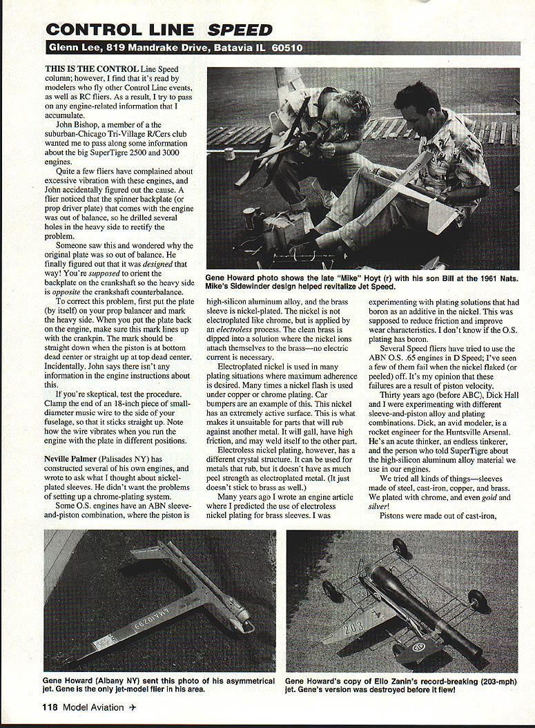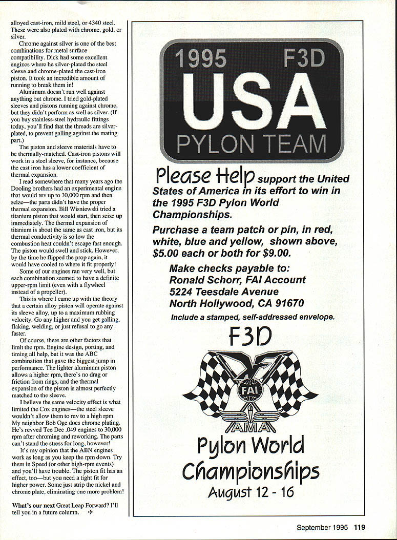 CONTROL LINE SPEED THIS IS THE CONTROL Line Speed column however find its read modelers fly other Control Line events well RC fliers As result try pass engine-related information accumulate John Bishop member suburban-Chicago Tn-Village RICers club wanted pass along some information about big SuperTigre 2500 3000 engines Quite few fliers have complained about excessive vibration engines John accidentally figured out cause flier noticed spinner backplate prop driver plate comes engine out balance drilled several holes heavy side rectify problem Someone saw wondered original plate out balance finally figured out designed way Youre supposed orient backplate crankshaft heavy side opposite crankshaft counterbalance correct problem first put plate itself prop balancer mark heavy side put plate back engine make sure mark lines up crankpin mark should straight down piston bottom dead center straight up top dead center Incidentally John says isnt information engine instructions about youre skeptical test procedure Clamp end 18-inch piece smalldiameter music wire side fuselage sticks straight up Note wire vibrates run engine plate different positions Neville Palmer Palisades NY has constructed several own engines wrote ask what thought about nickelplated sleeves didnt want problems setting up chrome-plating system Some OS engines have ABN sleeveand-piston combination piston high-silicon aluminum alloy brass sleeve nickel-plated nickel electroplated like chrome applied electroless process clean brass dipped solution nickel ions attach themselves brassno electric current necessary Electroplated nickel used plating situations maximum adherence desired times nickel flash used under copper chrome plating Car bumpers example nickel has extremely active surface what makes unsuitable parts will rub against another metal will gall have high friction may weld itself other part Electroless nickel plating however has different crystal structure can used metals rub doesnt have much peel strength electroplated metal just doesnt stick brass well years ago wrote engine article predicted use electroless nickel plating brass sleeves experimenting plating solutions boron additive nickel supposed reduce friction improve wear characteristics dont know OS plating has boron Several Speed fliers have tried use ABN OS 65 engines D Speed Ive seen few fail nickel flaked peeled off Its opinion failures result piston velocity Thirty years ago before ABC Dick Hall experimenting different sleeve-and-piston alloy plating combinations Dick avid modeler rocket engineer Huntsville Arsenal Hes acute thinker endless tinkerer person told SuperTigre about high-silicon aluminum alloy material use engines tried kinds thingssleeves made steel cast-iron copper brass plated chrome gold silver Pistons made out cast-iron 118 Model Aviation Howard photo shows late Mike Hoyt r son Bill 1961 Nats Mikes Sidewinder design helped revitalize Jet Speed Gene Howard Albany NY sent photo asymmetrical Gene Howards copy Ello Zanins record-breaking 203-mph jet Gene jet-model flier area jet Genes version destroyed before flew alloyed cast-iron mild steel 4340 steel also plated chrome gold silver Chrome against silver best combinations metal surface compatibility Dick some excellent engines silver-plated steel sleeve chrome-plated cast-iron piston took incredible amount running break Aluminum doesnt run well against anything chrome tried gold-plated sleeves pistons running against chrome didnt perform well silver buy stainless-steel hydraulic fittings today youll find threads silverplated prevent galling against mating part piston sleeve materials have thermally-matched Cast-iron pistons will work steel sleeve instance because cast iron has lower coefficient thermal expansion read somewhere years ago Dooling brothers experimental engine would rev up 30000 rpm seizethe parts didnt have proper thermal expansion Bill Wisniewski tried titanium piston would start seize up immediately thermal expansion titanium about same cast iron its thermal conductivity low combustion heat couldnt escape fast enough piston would swell stick However time flipped prop again would have cooled fit properly Some engines ran very well combination seemed have definite upper-rpm limit flywheel instead propeller came up theory certain alloy piston will operate against its sleeve alloy up maximum rubbing velocity Go higher get galling flaking welding just refusal go faster course other factors limit rpm Engine design porting timing help ABC combination gave biggest jump performance lighter aluminum piston allows higher rpm theres no drag friction rings thermal expansion piston almost perfectly matched sleeve believe same velocity effect what limited Cox enginesthe steel sleeve wouldnt allow rev high rpm neighbor Bob Oge does chrome plating Hes revved Tee Dee 049 engines 30000 rpm after chroming reworking parts cant stand stress long however Its opinion ABN engines work long keep rpm down Try Speed other high-rpm events youll have trouble piston fit has effect toobut need tight fit higher power Some just strip nickel chrome plate eliminating problem Whats next Great Leap Forward Ill tell future column pionships Purchase team patch pin red white blue yellow shown above $500 both $900 Make checks payable Ronald Schorr FAI Account 5224 Teesdale Avenue North Hollywood CA 91670 Include stamped self-addressed envelope F30 September1995 119 P lea5e Help support United States America its effort win 1995 F3D Pylon World Pylovi World Campicrn5Iip5 Aulqul5t 12- 16
