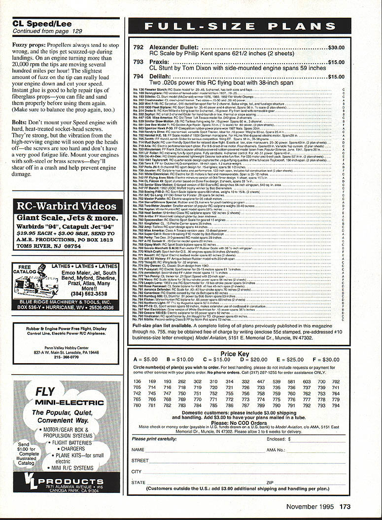 CONTROL LINE SPEED THIS COLUMN IS BEING written just before leave Nats everything rush rush rush Most airplanes ready Ive filing sanding props mostly fiberglass ones wear dust-filter mask long rubber gloves work fiberglassI just hate itchy little glass fibers sticking fingers several items Id like cover column goes Quest Its difficult flier fly Speed himself As result have Speed teams down through years including Clem Beasley Kim ZOOM Speed Team Harris Shelton Graham Booher Nash Pardue Stegens Dodge Telford Violett Lauerman Delaney Theobald Wisniewski Roselle Frye Bussell Jett Anaston Morton Hustad Roy well others list sounds like Speed Hall Fame doesnt late 60s team Bartley Garner High Point NC tough competitors won contests set records over country John Bartleys son Danny also won Junior Senior great good-looking kid accomplished Speed flier Tragically Danny lost life auto accident early 70s Bernie Stadiem other Speed fliers area donated some money beautiful silver trophy made memorial Danny Danny Bartley Memorial Trophy awarded Control Line Champion Nats Points accumulated control line event calculated same way points National Champion compiled winner would have name year engraved small plaque trophy would keep until next Nats some good-running equipment Control Line Champion 1972 1974 Terry Herron won 1973 Mike Langlois 1975 Brent Bussell 1976 About time AIvIA decided too much work collect data compute points select National Champion National Championships no Nats Champion no Control Line Champion lost track Danny Bartley Trophy dont know anyone got trophy after Brentwouldnt great find reactivate award Id like keep memory Danny alive todays computer coverage would simple arrive winner Lets think about itand lets look trophy Lore Like experienced contestants us have flying Speed years have picked up vital tricks techniques procedures items make equipment much reliable and/or faster forget beginners have yet leam such thingswe should pass knowledge to make lives little easier flying successful Needle Valves use surgical-tubing bladder tank its resultant high pressure size hole tapered needle meters fuel should no larger about 046 diameter its bigger needle setting will critical area opening changes drastically adjust needle However use metal tank crankcase pressure might need larger hole since less pressure problem K&B 65 wouldnt run rich enough until drilled out needle seat fitting 055 diameter can have another problem metal tank hole crankcase-pressure fitting too big get surging try reducing pressure-fitting hole sizesoft-solder piece music wire hole pull out just solder sets up Try 014 wire start Ive used wires small 012 worked OK slightly larger wire will probably work well Fuel Injection Another trick can give engine steadier run make sure fuel injected out near center carburetor intake openingnot dribbled out slot hole near wall Air tends stick surfacesyou want get fuel out away boundary layer can atomized properly Try get fuel outlet least 1/ inch wall Continued page 173 November1995 129 Chuck Snyder John Johnson mix concrete Speed pylon base Cincinnatis hotbed CL flying Jim Moore Bill Clark John Johnson Chuck Snyder L-R display 40-powered Scale models Golden Age air racers Bill Tennys widow donated pulse jet engine Jerry Wiles museum use Bills company made Dynajet CL Speed/Lee Continued page 129 Fuzzy props Propellers always tend stop wrong tips get scuzzed-up during landings engine turning 20000 rpm tips moving several hundred miles per hour slightest amount fuzz tip can really load engine down cut speed Instant glue good help repair tips fiberglass propsyou can file sand properly before using again Make sure balance prop again too Bolts Dont mount Speed engine hard heat-treated socket-head screws Theyre strong vibration high-revving engine will soon pop heads offthe screws too hard dont have very good fatigue life Mount engines soft-steel brass screwstheyll shear off crash help prevent engine damage S66-6 Giant Scale Jets & Warblrds 94 Catapult Jet94 $1995 EACH S&H SEND TO AMR PRODUCTIONS P0 BOX 1813 TOMS RiVER NJ 08754 FREELATHES ES ES CATALmco Maler Jet South end Myford Sherline tot Prazi Atlas More! 304 5624633 I0@ S1 Price Key B 0C 0D 0E $2500F $3000 Circle numbers plans wish order best handling please include requests payment ______________________________________________________ some other seroice plans order No phone orders Call 317 287-1256 order assistance ONLY 136169193262302310314332447539581603700702 705714716718719720721726733735736737739741 742745747750751752755756758759760762763764 765766768769770771772773774775776777778779 780781782783784785786787789790791792793794 Domestic customers please include $300 shipping handling Add $300 have plans mailed tube Please No COD Orders Make check money order payable us tunds drawn us bank Mode/ Aviation AMA 5151 East Memorial nr Muncie IN 47302 Please allow 3 6 weeks delivery Please print carefullyEnclosed $ NAME________________________AMA No __________ STREET ___________________________ CITY ___________________________________________ STATE______________ZIP __________________________ Customers outside US add $300 additional shipping handling per plan November1995 173 792 Alexander Bullet$3000 RO Scale Philip Kent spans 621/2 inches 2 Sheets 793Praxis$1500 CL Stunt Tom Dixon side-mounted engine spans 59 inches 794 Delilah$1500 Two 020s power RC flying boat 38-inch span Na 136 PieColor storoh no Scab nodal 2345 5channol has boTh slots sod tiaps C No let Dennyplane RO vorcion lotnod cobb roodelkiltront 19371525 C Na 163 Stiletto CL Stoot model lMcOonaldl oboe 1076 1080 1082 FA wotid Chaorps C No 262 Ceeehnaeter CL craahproot trains Too noest 5-30 35/40 pooter A No 302 Mint P16 80 Sarpolun 049 4oct04 fan spon thor tot 2 channel Boino aross toil tuneloge strootute 0 Ne 310 1930 Fleet elpiane 00 Opon Scale 3540 poocer 4channet Spoon hOrn Vc 00010120100 cheatol S No314 Drake II 80 Ken willard s hying boat 30600001 15 poucor Fly