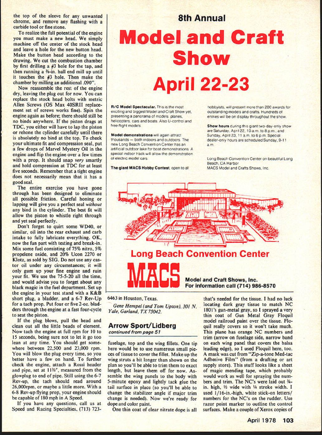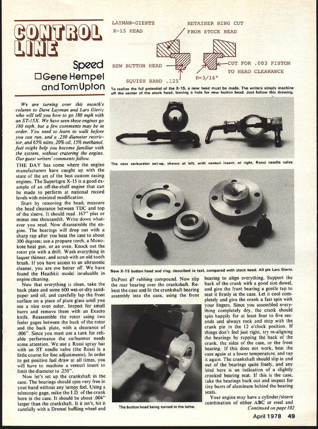 LAYMAN-GIERTZRETAINER RING CUT Speed EJGene Hem pet Tom Uplon X-15HEADFROM STOCK HEAD NEW BUTTON HEAD SQUISH BAND 125R3/16 CUT FOR 003 PISTON TO HEAD CLEARANCE realize full potential X-15 new head must made writers simply machine off center stock head leaving hole new button head Just follow drawing turning over months column Dave Layman Lars Giertz will tell go 180 mph ST-1SX have seen engines go 180 mph few comments may order need learn walk before can run 230 diameter restric tor 65% nitro 20% oil 15% methanol fuel might help become familiar &ystem cratering engine guest writers comments follow THE DAY has come engine manufacturers have caught up state art best custom racing engines Supertigre X-15 good ex ample off-the-shelf engine can made perform national record levels minimal modification Start removing head measure head clearance between TDC top sleeve should read 167 plus minus thousandth Write down what ever read Now disassemble en gine bearings will drop out sharp rap after heat case about 300 degrees use propane torch Mono kote heat gun oven Knock out rotor pin drift Wash everything laquer thinner scrub old tooth brush have access ultrasonic cleaner eve better off have found Heathkit model invaluable engine cleaning Now everything clean take back plate some 600 wet-or-dry sand paper oil carefully lap front surface piece plate glass until see nice color Inspect small burrs remove Exacto knife Reassemble rotor using two feeler gages between back rotor back plate clearance 006 Since must use tank reli able performance carburetor needs some attention use Rossi spray bar ST needle valve Rossi little coarse fine adjustments order get positive fuel draw times will have machine venturi insert limit diameter 250 Now lets set up crankshaft case bearings should spin very free hand lumpy feel Using telescopic gage mike ID crank bore case should about 004 larger crankshaft isnt hit carefully Dremel buffing wheel DuPont #7 rubbing compound Now slip rear bearing over crankshaft Re heat case fit crankshaft bearing assembly case using front bearing align everything Support back crank good size dowel give front bearing gentle tap seat firmly case Let cool com pletely give crank fast spin fingers Since assembled thing completely dry crank should spin happily least four five sec onds always rock stop crank pin 12 oclock position things dont feel just right try re-aligning bearings rapping back crank sides case front bearing does work heat case again lower temperature tap again crankshaft should slip out bearings quite freely bind indication slightly crooked bearing seat case take bearings back out inspect tiny burrs aluminum behind bearing seats engine may have cylinder/sleeve combination either ABC steel Continued page 102 April 1978 49 new carburetor set-up shown left venturi insert right Rossi needle valve New X-15 button head ring described text compared stock head pix Lars Giertz button head being turned lathe SAVE THE BENT-WINGED BIRD HEY MODELERS SUPPORT THE BLACK SHEEP SQUADRON MANY OF YOU COMPLAINED WHEN THE TV SERIES WAS CANCELLED NOW THAT ITS ON AGAIN LETS SUPPORT THE SHOW BY LETTING NBC HEAR FROM US PERSONAL LETTER IS BEST BUT EVEN VOTE WILL HELP THE KIDS WILL LOVE YOU FOR IT MAYBE YOUR WIFE WILL ADDRESS THE ENVELOPE FOR YOU DONT DELAY T NOW CLIP AND SEND TO ROBERT CONRAD BLACK SHEEP SQD NBC-TV 3000W Alameda Burbank CA 91523 YES MY FAMILY TUNES IN THE BLACK SHEEP SQD EVERY WEDNESDAY NIGHT AND WE LOVE IT SIGNED CITY STATE gain counts Send check money order payable Smithsonian Institution National Air Space Museum Pub lications Smithsonian Institution Wash ington DC 20560 Mine took about four weeks delivery also have simi lar volume entitled Rockets Missiles Spacecraft National Air Space Museum $150 75 postage handling charge per book Mike Gretz Box 162 Montezuma IA 50171 CL Aerobatics/Paul continued page 47 planes really flew well new McCoy engines Hurray Bill Netze band long standing fight Half-A As soon Rich gets settled out West hope have report little hot half-As Custom Master Products attending King Orange Internationals over new years holidays chance visit Gene Martines fantastic shop setup Jacksonville Florida Gene slowly organizing operation will definite asset stunt fliers continual quest needed items produced larger manufacturers April May should completely set up distribute very good Custom Master Mufflers very good adjustable handle weighs very light 3 oz ven turis building weights nose weights other items Write Gene catalog address given earlier article Fuel Tanks want 5-ounce larg er tank ST 46 HP 40 Fox 45 engine about source know presently Randy Hancock custom makes 008 tin plate tanks work art well worth $1000 plus postage prices Write him 541 Columbia Blvd Lexington KY 40508 tel 606-252-8137 Foam Wings Look another manufac turer custom stunt foam wings near future John Poynter Kirk Mul linnix California getting business will soon have price list catalog available interested price list write J & K foam wings 10261 Janice Lynn Cypress CA 90630 also have heard Arnold Stott gets relocated Texas intends start producing wings again substan tial basis Havent heard him am certain will let Model viation know ready produce Stunt Scoring Change good possibility scoring system pro posed September issue Model Aviation point awards 0-to-lO one-half point increments 0-10 points appearance 2 points starting within minute 6 points completion pattern will drawn up soon pro posed PAMPA membership via newsletter proposal accepted President Keith Trostle will propose CLCB next rules cycle Com ments should sent Keith information stunt PAMPA contact Wynn Paul 1640 Maywick Dr Lexington KY 40504 CL Speed/Hempel/Upton continued page 49 iron Either combination will work fine will need chrome steel sleeve insure good life consistent runs stock timing should 1330 intake 1730 exhaust dont have degree wheel check can measure ports top sleeve exhaust will come out 500 intake 596 sure mike piston ca