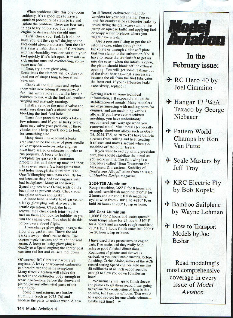 CONTROL LINE SPEED BACK IN THE SEPTEMBER issue Model Aviation told about John Bishops tip help balance big SuperTigre 2500 3000 engines John told prop driver large aluminum disk prop bolted against has heavy side should oriented crankshaft reduce engine vibration imbalance weight totals several grams Johns friends calculated produces pound radial force 8000 rpm orient drive washer correctly mark heavy side put shaft mark lined up crankpin exactly opposite crank counterbalance got letter Ken Bell modeler Fontana Wisconsin says its also important orient heavy side brass split collet same way collet locks prop driver plate crankshaft tighten prop nut has slot side might think such slight difference wont matter gram helps Im happy pass little suggestion like might make engine operate betterthere may similar methods would help Speed engines too times Speed Control Line Free Flight RC engines just refuse run properly instance friend flying small RC airplane couple years incident Suddenly just wouldnt work right anymore engine wouldnt run steadily wouldnt respond needle-valve changes wouldnt idle first thought engine worn out thats rarely case problems arise suddenly January1996 143 Chris Sackett has promoting 21 Proto Speed class models would judged beauty well speed Built small speed Tom Blankman displays Class 21 Sport Speed models flew Indianapolis Excellent Pilot Billy Hughes regularly flies other competitors ph crew fiancd Lori Wilson helps out Tom Blankmans neat little 21 Proto model features wing mounted wheels orange-checkerboard finish problems like occur suddenly its good idea have standard procedure steps try isolate problem four easy things try before buy new engine disassemble old First check fuel old have left cap off jug fuel could absorb moisture air Its nasty habit lot fliers have high-humidity weather can ruin fuel quickly its left open results sick engine runs overheating try some new fuel Next try new glow plug Sometimes element will oxidize bend out shape long before will burn out Check fuel lines replace new tubing necessary fuel line hole will allow air bubbles mix fuel produce surging unsteady running Finally remove needle valve make sure isnt chunk crud blocking fuel-feed hole four procedures take few minutes youre lucky may solve problem checks dont help youll need look something else times have found leaky crankcase cause poor needlevalve responsetwo-stroke engines must have sealed crankcases order run properly loose leaking backplate gasket common problem will show up now have seen few backplates holes through aluminum Oge-Willoughby race team recently lost out because two engines bad backplates newer Speed engines have 0-ring seals backplate prevent leaks Check backplate screws gasket loose head leaky head gasket leaky glow plug will also result erratic operation Check head screws check jointsquirt fuel look bubbles turn engine over should before Speed flight change glow plugs change glow plug gasket too Throw old gaskets awaydont reuse copper work-hardens might seal again loose leaky glow plug deadly Speed engine center post can turn red hot cause meltdown course RC fliers use carbureted engines leaky worn-out carburetor can precipitate same symptoms times vibration will shake barrel carburetor body enough wear outlong before sleeve piston other vital parts engine Some manufacturers use harder aluminum such 7075-T6 anodize parts reduce wear new different carburetor might wonders old engine can look crankcase carburetor leaks pressurizing crankcase tire pump squeeze bulb applying fuel soapy water places might have leak Use pressure fitting get air case either through backplate through blankoff plate clamp carburetor Youll have rotate crankshaft get air casewhen intake open piston should blank off exhaust opening will get some leakage out front bearingthats necessary because oil fuel lubricates front end carburetor leaks excessively replace Getting back some technical information Ill expound bit stabilization metals modelers experimenting making parts engines machining various alloys have ever machined anything have undoubtably encountered part warpage removed metal Most metals especially wrought-aluminum alloys such 6061T6 2024-T35 7075-T6 have built-in stresses rolling heat treating relaxes moves around machine off outer layers want end up precision part should stabilize metal work following procedure called Heat Treatment Maximum Dimensional Stability Nonferrous Alloys taken issue Machine Design magazine 2024-T35 Aluminum Rough machine 3650 F 8 hours air cool semifinish machine 3750 F 2 hours air cool finish machine cycle twice l0OO F 2100 F hold 20 hours 2000 F lap hone 356 Cast Aluminum 10000 F 2 hours water quench room temperature 24 hours 3100 F 4 hours air cool rough machine 2800 F 1 hour finish machine 2000 F 20 hours lap hone have used procedures engine parts Ive made really help achieve good finished dimensions Roundness pistons sleeves critical need stable material before finishing Carlos Aloise maker ACE record-setting Speed engines told 40 millionths inch out round enough slow down 10 miles hour normally use laps finish sleeves pistons get round going explain construction laps column ran out room would good subject whole column maybe next time uary issue RC Hero 40 Joel Cimmino ar 13 Texaco 1¼2A George Niebauer Pattern World Champs Ron Van Putte Scale Masters Jeff Troy KRC Electric Fly Bob Kopski Bamboo Sailplane Wayne Lehman How Transport Models Joe Beshar Read modelings comprehensive coverage issue Model via tion 144 Model Aviation