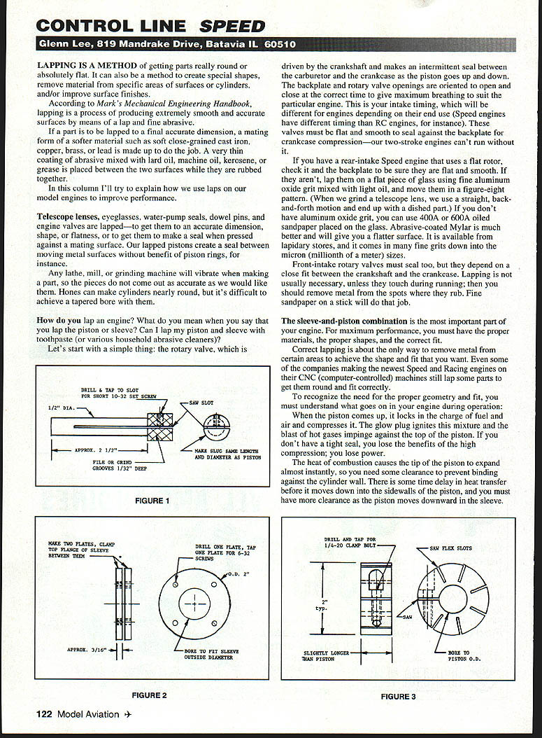 CONTROL LINE SPEED LAPPING IS METHOD getting parts really round absolutely flat can also method create special shapes remove material specific areas surfaces cylinders and/or improve surface finishes According Marks Mechanical Engineering Handbook lapping process producing extremely smooth accurate surfaces means lap fine abrasive part lapped final accurate dimension mating form softer material such soft close-grained cast iron copper brass lead made up job very thin coating abrasive mixed lard oil machine oil kerosene grease placed between two surfaces rubbed together column Ill try explain use laps model engines improve performance Telescope lenses eyeglasses water-pump seals dowel pins engine valves lappedto get accurate dimension shape flatness get make seal pressed against mating surface lapped pistons create seal between moving metal surfaces benefit piston rings instance Any lathe mill grinding machine will vibrate making part pieces come out accurate would like Hones can make cylinders nearly round its difficult achieve tapered bore lap engine What mean say lap piston sleeve Can lap piston sleeve toothpaste various household abrasive cleaners Lets start simple thing rotary valve DRILL TAP TO SLOT FOR SHORT 10-32 SET SCREW MAZE SLUG SAMR LENGTH AND DIAMETER AS PISTON FILE OR GRIND GROOVES 1/32 DEEP FIGURE 1 MAFE TWO PLATE5 PDRILL ONE PLATE TAP TOP FLANGE OF SLEEVEONE PLATE FOR 632 BETWEEN THEMSCREWS 002 0 00 APPROX 3/16 4 U-BORE TO FIT SLEEVE IOUTSIDE DIAMETER FIGURE 2 driven crankshaft makes intermittent seal between carburetor crankcase piston goes up down backplate rotary valve openings oriented open close correct time give maximum breathing suit particular engine intake timing will different engines depending end use Speed engines have different timing RC engines instance valves must flat smooth seal against backplate crankcase compressionour two-stroke engines cant run have rear-intake Speed engine uses flat rotor check backplate sure flat smooth arent lap flat piece glass using fine aluminum oxide grit mixed light oil move figure-eight pattern grind telescope lens use straight backand-forth motion end up dished part dont have aluminum oxide grit can use 400A 600A oiled sandpaper placed glass Abrasive-coated Mylar much better will give flatter surface available lapidary stores comes fine grits down micron millionth meter sizes Front-intake rotary valves must seal too depend close fit between crankshaft crankcase Lapping usually necessary unless touch during running should remove metal spots rub Fine sandpaper stick will job sleeve-and-piston combination important part engine maximum performance must have proper materials proper shapes correct fit Correct lapping about way remove metal certain areas achieve shape fit want some companies making newest Speed Racing engines CNC computer-controlled machines still lap some parts get round fit correctly recognize need proper geometry fit must understand what goes engine during operation piston comes up locks charge fuel air compresses glow plug ignites mixture blast hot gases impinge against top piston dont have tight seal lose benefits high compression lose power heat combustion causes tip piston expand almost instantly need some clearance prevent binding against cylinder wall some time delay heat transfer before moves down sidewalls piston must have clearance piston moves downward sleeve DRILL AND TAP FOR 1/420 CLAMP BOLTSAW FLEX SLOTS PISTON 00 FIGURE 3 122 Model Aviation NTLY LONGER nAN PISTON Additionally friction between sleeve piston creates heat also causes piston expand So piston goes down expands need clearance eliminate binding nonessential friction time combustion gases have less pressure dont need tight seal top bottom stroke fuel-air mixture crankcase cools piston next sequence reasons taper bore sleeve tight top stroke extremely loose bottom also put taper top piston wall period Speed engine development sleeve least 005 larger bottom tapered piston seals top 20% stroke doesnt touch sleeve anywhere else during stroke rides loosely oil film top piston wall also tapered bottom half relieved about 001 engines come way have lap bore until round has enough clearance check piston roundness clearance taper whether wrist pin square sides major differences allow engine go much faster another engine same type laps made various materials such brass cast iron copper Aluminum steel will sometimes gall dont use usually make brass internal laps sleeve brass wears faster chrome sleeve end up tapered lapexactly what want lap made cast iron sharp corners can easily go through thin chrome platingbe careful Too much pressure lap can also damage sleeve take easy let abrasive work Cast iron makes excellent external lap pistons will last longer bore will stay straighter know lapping necessary needed Run engine flying prop slightly smaller pitch diameter few minutes note rpm can has flown okay too Disassemble engine look bore surfaces reflected light will see piston has rubbing chrome will polished marked want have piston touch seal top stroke approximately 1/ inch no 20% stroke Most likely will see shiny spots shiny areas around exhaust bypass ports walls shiny spots piston rubbingthe sleeve out round doesnt have clearance areas Make lap like shown Figure 1 make sleeve holder like Figure 2 lap sleeve applying mixture oil aluminum-oxide grit 600 size finer both parts rotating other adjusting diameter surfaces wear away use aluminum oxide grit because breaks down can washed out easily Some abrasives like diamond carborundum can imbed themselves surfaces keep wearing parts Cross-hatching makes lap cut lot faster grooves dont have fancyjust file use grinder Deburr lap before use must have patience chrome hard wear-resistant dont try hurry things applying too much pressure lap you can warp sleeve score plating both sleeve holder keeps squeezing sleeve out round lapping Put marker stop some kind shaft lap dont go too deep lap area pistons seals us