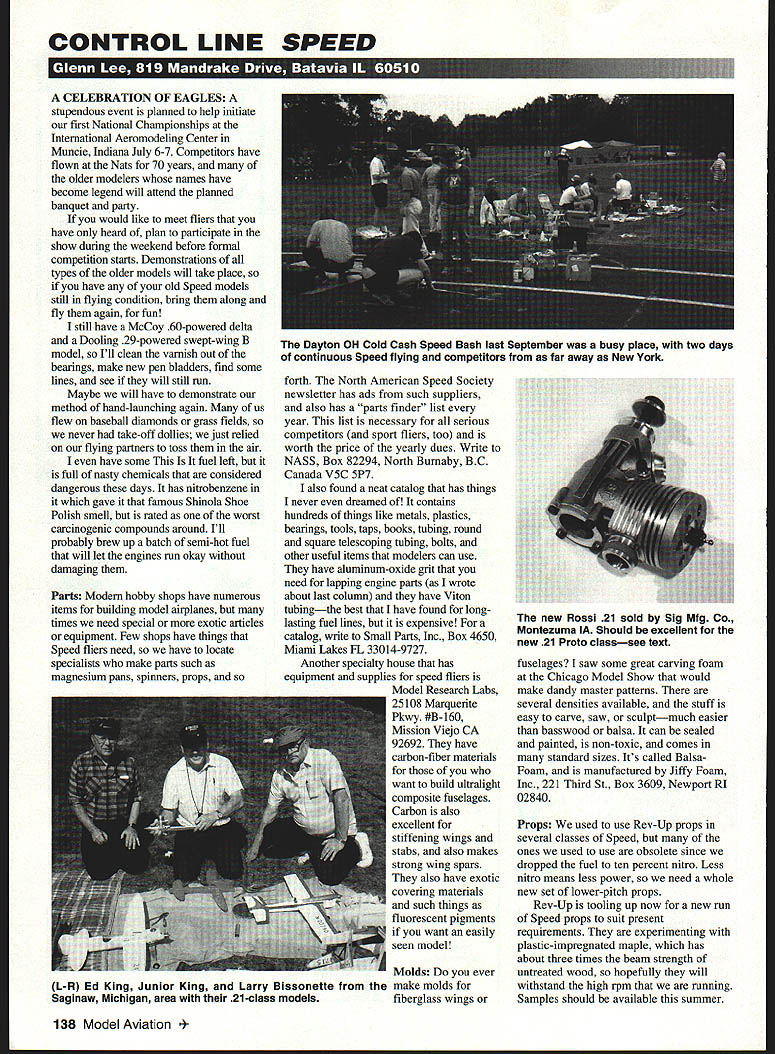CONTROL LINE SPEED CELEBRATION OF EAGLES stupendous event planned help initiate first National Championships International Aeromodeling Center Muncie Indiana July 6-7 Competitors have flown Nats 70 years older modelers names have become legend will attend planned banquet party would like meet fliers have heard plan participate show during weekend before formal competition starts Demonstrations types older models will take place have old Speed models still flying condition bring along fly again fun still have McCoy 60-powered delta Dooling 29-powered swept-wing B model Ill clean varnish out bearings make new pen bladders find some lines see will still run Maybe will have demonstrate method hand-launching again us flew baseball diamonds grass fields never take-off dollies just relied flying partners toss air have some fuel left full nasty chemicals considered dangerous days has nitrobenzene gave famous Shinola Shoe Polish smell rated worst carcinogenic compounds around Ill probably brew up batch semi-hot fuel will let engines run okay damaging Parts Modem hobby shops have numerous items building model airplanes times need special exotic articles equipment Few shops have things Speed fliers need have locate specialists make parts such magnesium pans spinners props forth North American Speed Society newsletter has ads such suppliers also has parts finder list year list necessary serious competitors sport fliers too worth price yearly dues Write NASS Box 82294 North Burnaby BC Canada V5C 5P7 also found neat catalog has things never dreamed contains hundreds things like metals plastics bearings tools taps books tubing round square telescoping tubing bolts other useful items modelers can use have aluminum-oxide grit need lapping engine parts wrote about last column have Viton tubingthe best have found longlasting fuel lines expensive catalog write Small Parts Inc Box 4650 Miami Lakes FL 33014-9727 Another specialty house has equipment supplies speed fliers Model Research Labs 25108 Marquerite Pkwy #B-160 Mission Viejo CA 92692 have carbon-fiber materials want build ultralight composite fuselages Carbon also excellent stiffening wings stabs also makes strong wing spars also have exotic covering materials such things fluorescent pigments want easily seen model Molds ever make molds fiberglass wings fuselages saw some great carving foam Chicago Model Show would make dandy master patterns several densities available stuff easy carve saw sculptmuch easier basswood balsa can sealed painted non-toxic comes standard sizes Its called BalsaFoam manufactured Jiffy Foam Inc 221 Third St Box 3609 Newport RI 02840 Props used use Rev-Up props several classes Speed ones used use obsolete since dropped fuel ten percent nitro Less nitro means less power need whole new set lower-pitch props Rev-Up tooling up now new run Speed props suit present requirements experimenting plastic-impregnated maple has about three times beam strength untreated wood hopefully will withstand high rpm running Samples should available summer 138 Model Aviation on OH Cold Cash Speed Bash last September busy place two days continuous Speed flying competitors far away New York new Rossi 21 sold Sig Mfg Co Montezuma IA Should excellent new 21 Proto classsee text L-R Ed King Junior King Larry Bissonette Saginaw Michigan area 21-class models Bob Fiorenze Building Service- Jets Warbirds Helicopters Contact Bob 407-330-1448 experience best assurance reliable power system set-ups send 0/s 91 engine Dynamax fan pipe will assemble adjust test fly $6000 labor Bob Fiorenze 407330-1448 Free Catalog home Klingberg Wing offer flying wings types other exciting aircraft kits Send #10 SASE stamp Future Flight 1256 Prescott Aye #2 Sunnyvale CA 94089 Stop Spending Money Hobby well established aircraft kit manufacturer looking sales reps Wanted Unbuilt Sterling Kit #E-6 Piper Super Cruiser Dana E Anderson Rt 1 Box 154 St Edward NE 68660-9522 Klingberg Wing other fine kits FutureFlighte-mail bootstrap@earthlink visit httpllhomeearthlinknet/free/bootstrap/ /webdocs// Nobody Beats Deal Unimat miniaturelathee-mail bootstrap@earthlink visit http//homeearthlinknet/free/bootstrap/ /webdocs// Futaba Super 7 Owners Get best programing guide 91 pages Don Edberg Team Futaba $13 Postpaid Send check/MO Dynamic Modelling 4922-C Rochelle Irvine CA 927142941 Electric Flyers Measure thrust easily Combine RPM measurement pocket-sized mechanical Field Thrust Calculator charts determine static thrust Send SASE detailed information $10 check money order purchase ARPI 900 Bower Drive Idaho Falls ID 83404 Wanted Wood scale kits 50s & 60s Monogram Speedee Bilt Guillows WWI & WWII Berkeley controliner others Mike Walker 515 Price St Morris IL 60450 42-0380 Classified advertising must paid advance rate $50 per word Please make check payable Model Aviation mail check printed copy ad Sue Schrock Hobby Advertising 150 Ott St Harrisonburg VA 22801 Ad payment must received 15th third month preceding issue date example June 15 Sept issue Ads will printed first come first served basis space permits Ads may run month time Multiply cost ad times number months ad will run include initial payment Count initials numbers phone numbers address city state zip code word Questions about Classified ads should directed Sue Schrock 540-434-0350 21 Proto Class Speed fliers including quite few old-timers dropped out competition few years ago building new airplanes 21 Proto event Proto used popular fiercely contested classes Nats other Speed contests airplanes must painted look like real racing airplanes used wheels dont have worry about building dolly ruining prop flight Engines last long time 10% nitro fuel can afford buy good engine rather several try find outstanding after swapping parts and/or reworking plan submit rules Provisional Class year design own model write Chris Sackett editor NASS newsletter has rules set plans Blondie elliptical-wing model beautiful going flying Nats objective 21 Proto fl